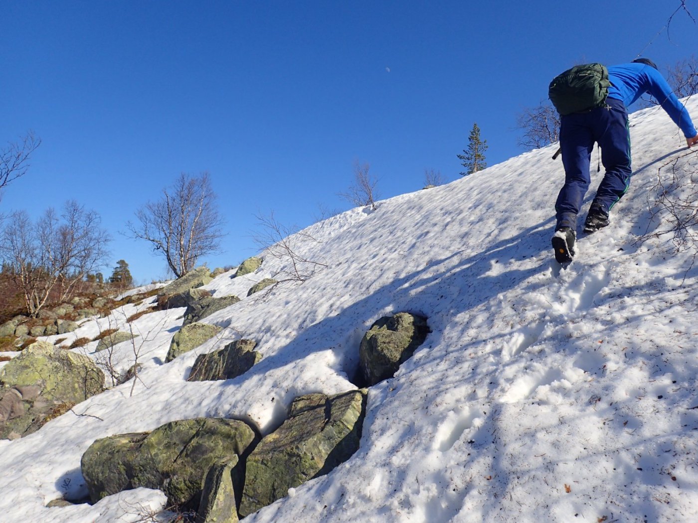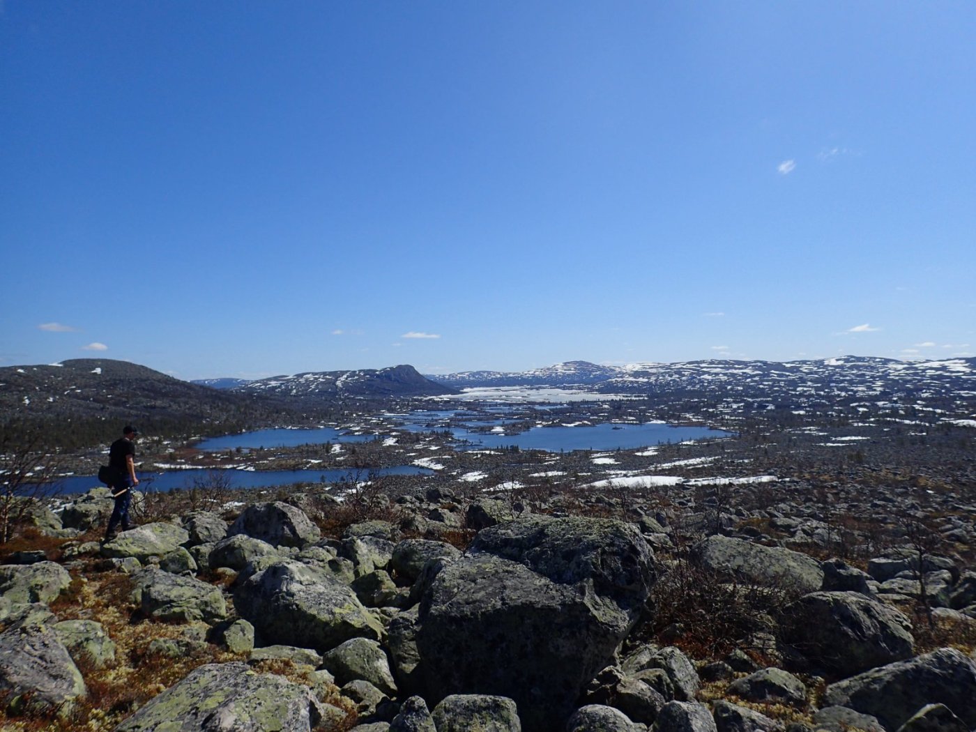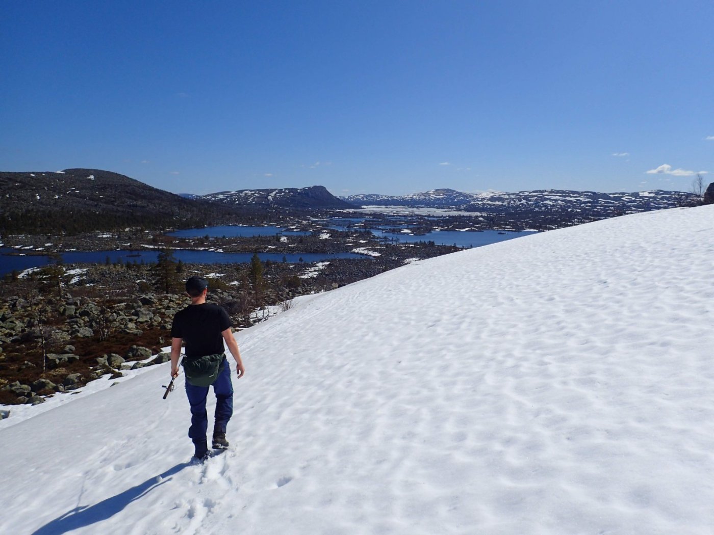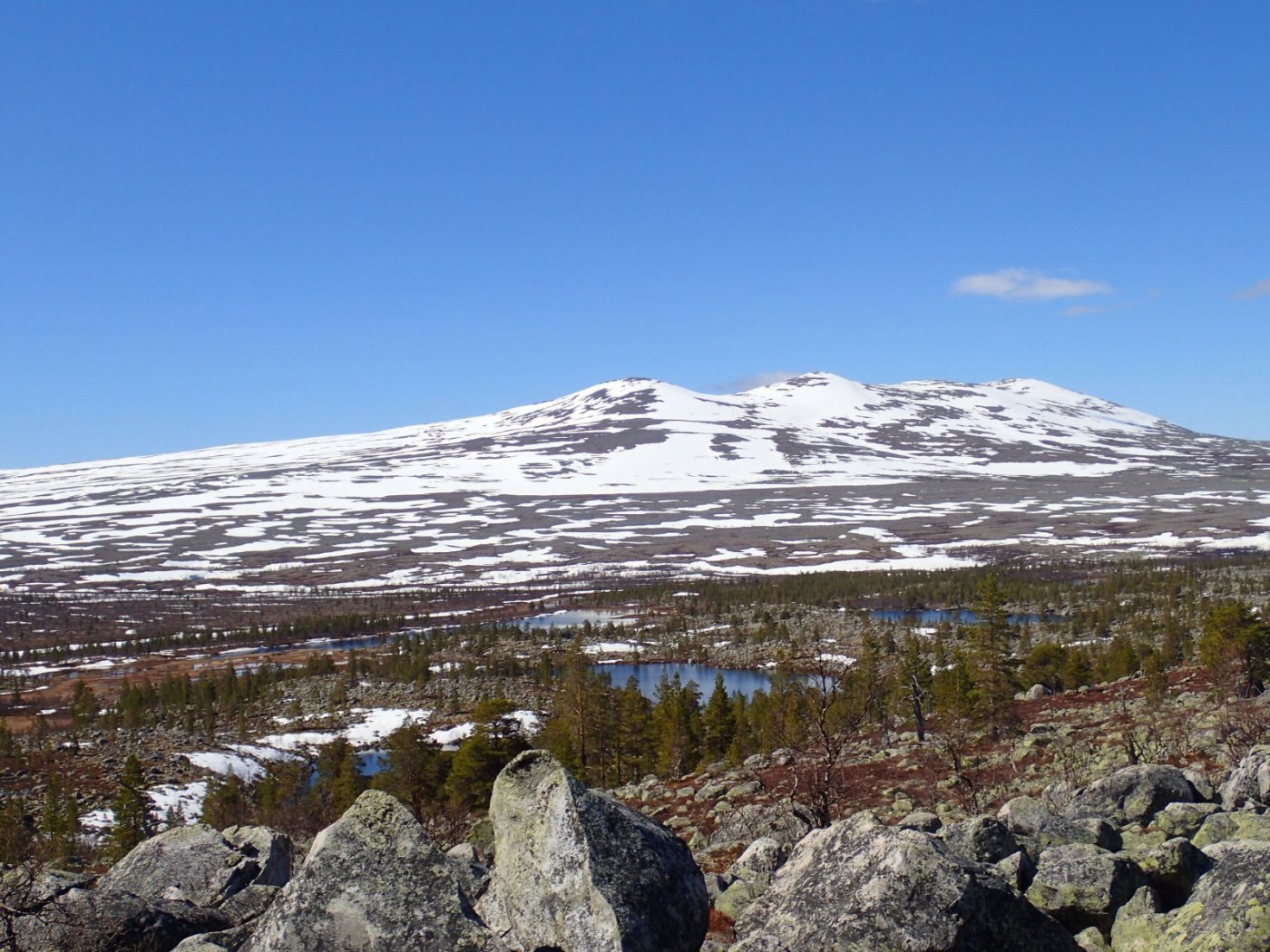Nå som vi er inne i den mørkeste tida av året passer det kanskje med noen bilder fra vår og tidligsommer i Femundsmarka. Turen i månedsskiftet mai/juni 2021 var min 9. og foreløpig siste tur innover i Femundsmarka. Som alltid er man litt usikker på vær og føre når man drar så tidlig, men vi fikk marka helt for oss selv, og virkelig noe i nærheten av en drømmetur. I hvert fall huskes det sånn når man ser på bildene såpass lenge etterpå. Her følger en bildetung og for øvrig kortfattet rapport fra turen. Avreise fra Jonasvollen sent på kvelden 28. mai. Over Femunden, opp på Røvolfjellet, og videre ned mot Røa. Trekvart kilo harr på første kast. Oppover langs Røa første dag, etter en kald natt og en lang morgen med mange kopper kaffe. Andre kveld og natt tilbringes ved Midtrøsta, ved foten av Kratlvola. Henning drar opp indrefilet av hjort, bearnaisesaus og øl fra sekken. Du verden som vi koste oss. Langt nede mellom noen store steiner finner jeg tilfeldigvis noe som ser ut som et gammelt syltetøyglass med små fisk inni. Vi spekulerer lenge og vel på hva dette kan være, men finner ikke noe svar. Fisken er rimelig godt bevart. Etter hjemkomst er jeg i kontakt med fjellstyret, men de er også blanke. Noen som vet? Videre i kronglete terreng over mot Kratlan, via Voltjønnan. Fra disse høydene får man et nytt perspektiv på marka. Favorittutsikten min, østover fra Kratlvoltangen. Fremdeles noe is på Vonsjøen. Neste natt tilbringes ved Halvkoitjønna. Ved ankomst er jeg så varm at jeg rett og slett må ta et bad. Temperaturen er slett ikke ille med tanke på at vi fremdeles skriver mai. I en bålgrue ved tjønna er det lagt igjen masse senerester. Der har en rype viklet seg inn og endt sine dager. Hva skal man si om slikt? Ubetenksomhet, dumskap, vond vilje? Jeg snakker da naturligvis ikke om rypa, men om mennesket som ikke brant opp eller tok med seg sena si. Særdeles unødvendig. Jeg sender bildet til fjellstyret og de lager en liten sak på det på nettsida for å vise hva som kan være konsekvensen av å bruke bålgrua som søppelplass. Nydelig vårkveld i Grøtådalen. Hoggorm har jeg aldri sett i Femundsmarka før. Ved Stortjønna biter omsider fisken. Det har vært steindødt hele veien opp langs Røa, i Kratlan og ved Halvkoitjønna. Så er tiden omsider kommet for min første virkelig store fiskeopplevelse i Femundsmarka, etter 8 år. Når vi kommer ned fra Grantjønna til Grøtåa bytter jeg til mark og dupp. Vi skal fiske oss nedover mot Krokethåen. Det første jeg gjør er å slenge duppen opp i nærmeste furu, slik at jeg må slite den bort. I middels stor frustrasjon hiver jeg på noe metall på sena og begynner å slenge litt umotivert mens vi beveger oss nedover. I et av de «kjedelige» partiene av elva hogger det til. Jeg kjenner fort at det ikke er snakk om den vanlige to-hektosfisken. Etter en bortimot fem minutter lang kamp med hjertet i halsen kan jeg endelig triumfere. Nokså akkurat kiloen, i hvert fall så nært at jeg kan si at jeg har bikket kilosgrensa. Kilosfisk er nokså dagligdags i marka, men å ta den såpass langt opp i Grøtåa så tidlig i sesongen synes jeg er veldig gøy. Jeg snur meg og takker Grøtåa og Kratlvola for opplevelsen og fortsetter på lette bein nedover. Siste natt tar vi ved Korstjønna. Få steder på jorda har vakrere solnedganger enn Korstjønna. Kjøring av fisk med samtidig tannpuss. Også siste dag byr på knall sommervær. Snakk om full klaff. Ned mot Haugen hvor vi skal bli hentet. Takk for nå!