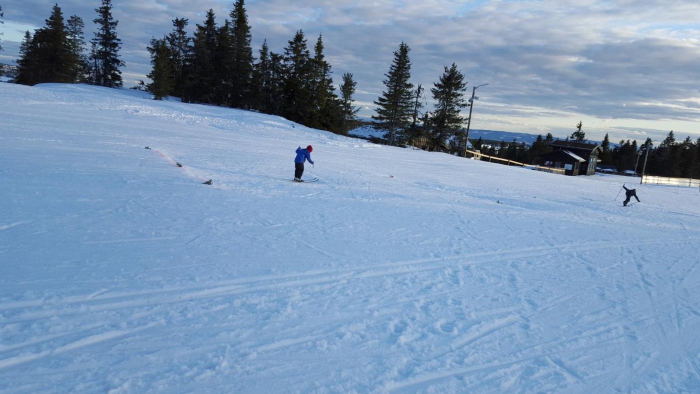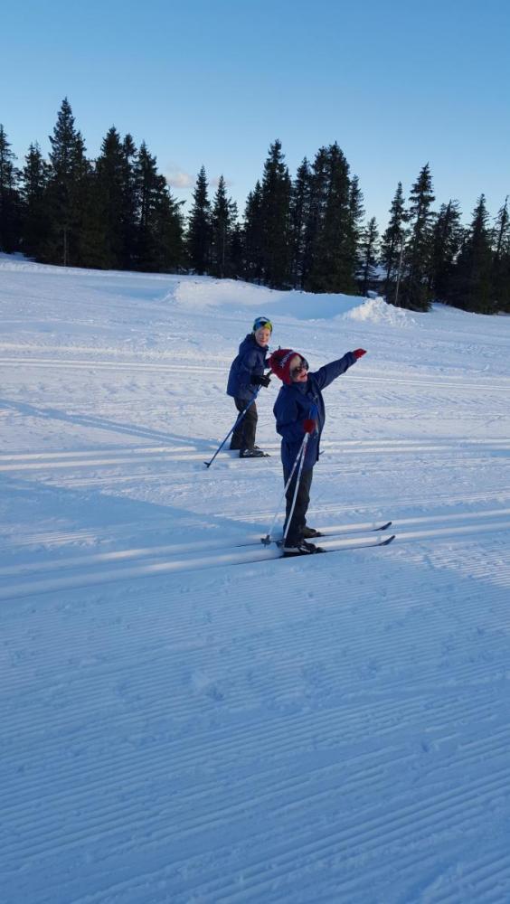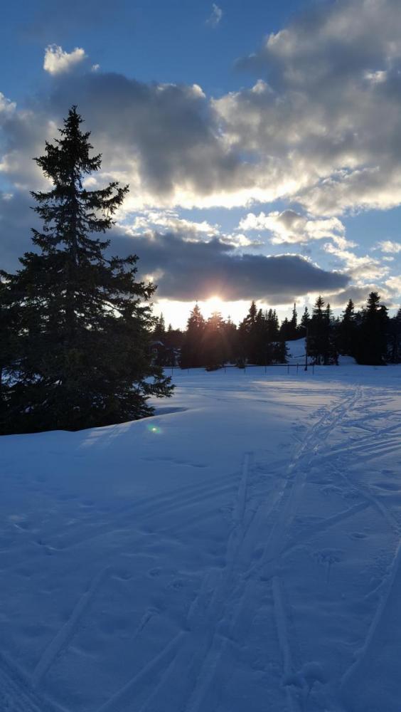 Føler meg fryktelig lite oppfinnsom for tida, men tok med ungene på skitur innover Sjusjøen i dag. Men så er det nå en fint tur å starte med - littegranne nedoverbakker bortover og oppover hjemover, men ikke så bratt at det går helt i stå for ungene. Masse plasser å raste på. Og når vi går litt utpå ettermiddagen er det nesten folketomt, og i tillegg har vi fått med oss to flotte solnedganger. I går ble det impulstur med bare litt sjokolade og vann med på turen. Og litt for lite klær, så rastene ble få og korte. I dag ble turen planlagt litt mer nøye. Bursdagsfeiring betød sen tur igjen, men med god tid til å pakke og være klar med en gang bursdagen var over. Målet var samme tur og sted som i går, men med mer klær, mer proviant, stormkjøkken og pølser og varmt vann og te/kakao/kaffe. Når man er 7 år hender det at motivasjonen sånn plutselig tar stopp. Eller heldigvis bare pause her. Finn en feil.. Gassbrenneren lå jo igjen på kjøkkenbordet. Så mye for å ha planlagt (nesten) alt annet.. (lompeboksen var jo også så godt som tom viste det seg da vi kom hjem). Men med nok nøtter og sjokolade i sekken ble man jo mett likevel. Og ungee var storfornøyde! Turning/dansing i løypa. Så fint å ha den nesten for seg selv.