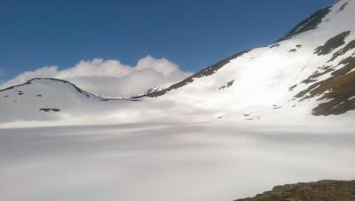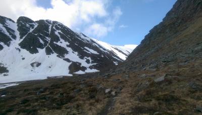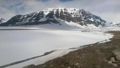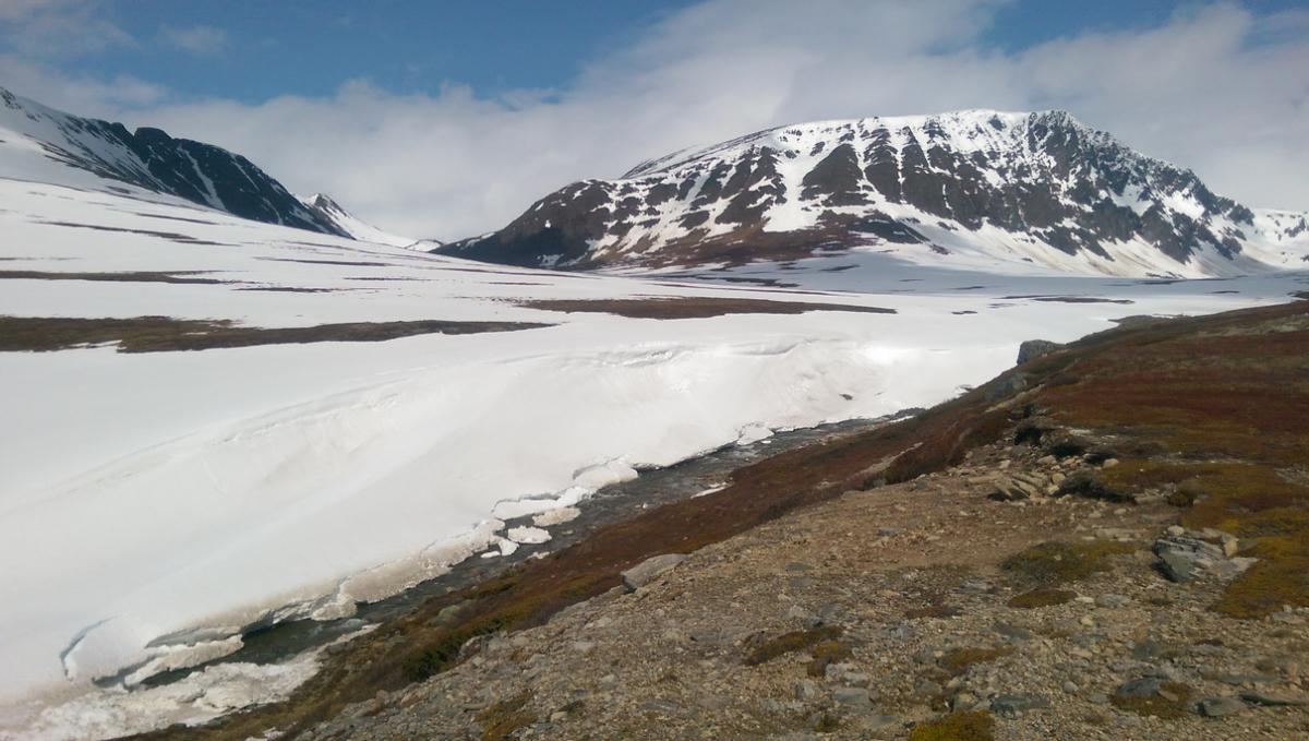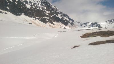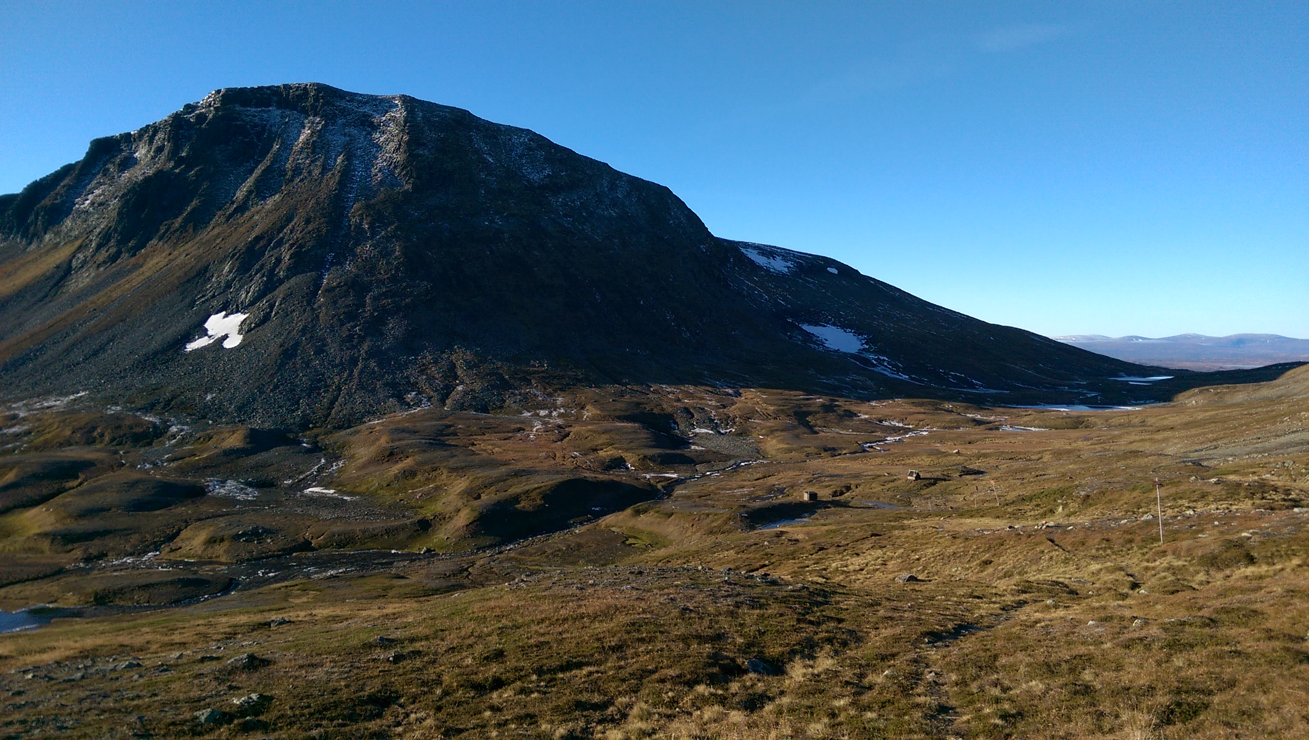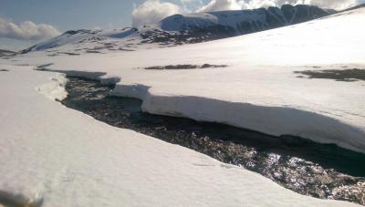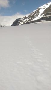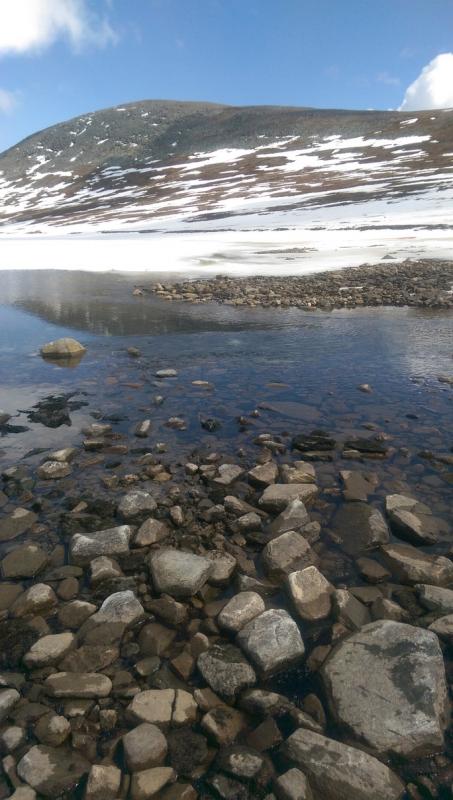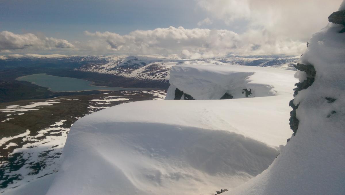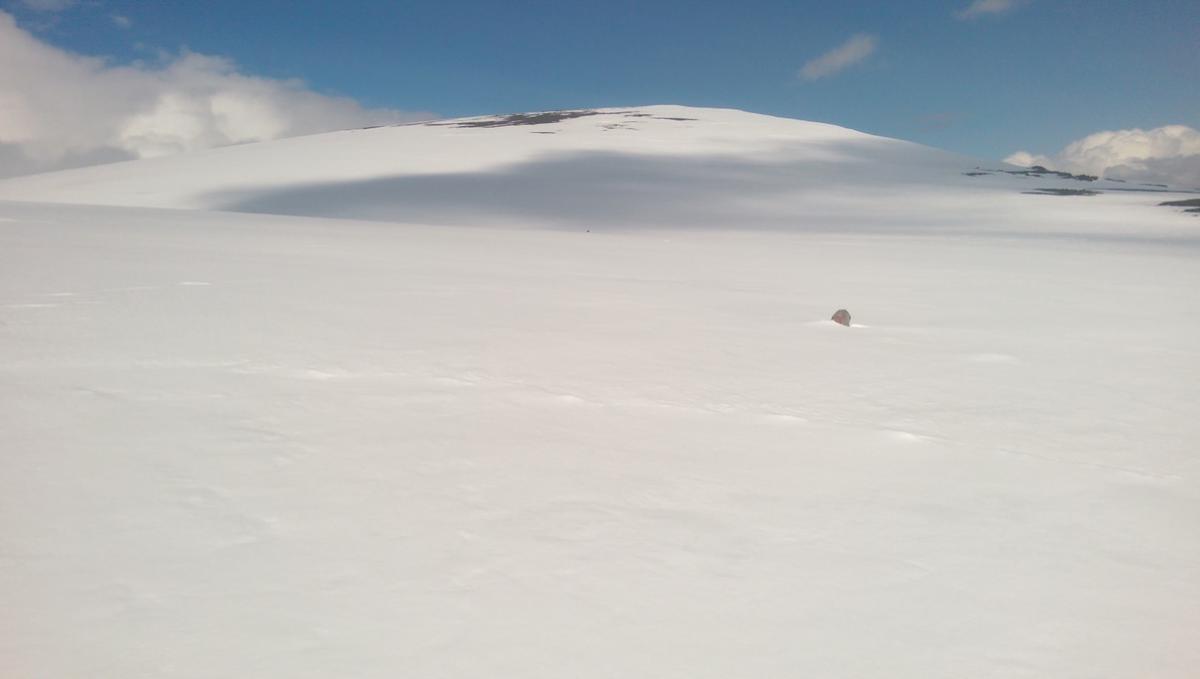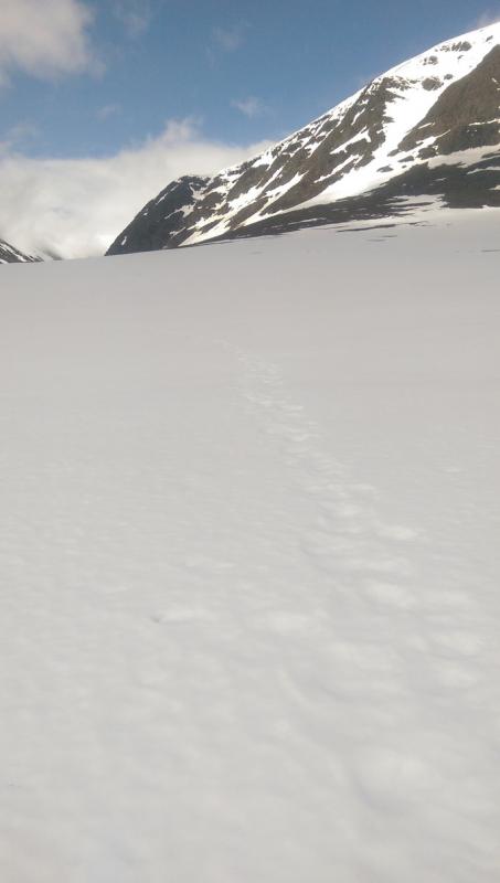 I går ble det et lite besøk i Trollheimen. Jeg var nysgjerrig på hvor mye snø det var, og i hvilken grad informasjonen fra f.eks. senorge.no var til å stole på. Jeg håper bildene er nyttige for andre som vurderer turen. Parkeringsplassen var helt tom og jeg traff ikke på et eneste menneske eller ferskt fotspor. Det var litt mer snø enn det senorge.no informerte om, men det var så godt som snøfritt helt frem til hvor den merkede stien krysser Gravbekken. Gjevilvassdalen var veldig snørik. Det var kun én plass langs hele bekken hvor det var mulig å krysse, men jeg stolte ikke på at snøen ville holde. Jeg så at noen hadde gått her for noen dager siden. Jeg fulgte bekken helt opp til Blåhøtjønna og fant ut at det var mulig å vade over der. Vannet gikk opp til underlivet, men det gikk fint. Snøen i dalen, og til tider også oppå fjellet, var våt og vanskelig å gå i. Truger kom godt med. Været var førsteklasses, og jeg må innrømme at det var litt deilig å ha Trollheimen for meg selv. Her, et lite stykke forbi hvor stien krysser bekken, har bekken tydeligvis vært krysset tidligere. Det var imidlertid en del sprekker i snøen, så jeg tok ingen sjanser. Dyp, men kort vadetur. Bart (men vått) helt opp til platået på Blåhøa. Jeg prøvde først uten truger. Du vil falle gjennom et par ganger, men det er overkommelig.
