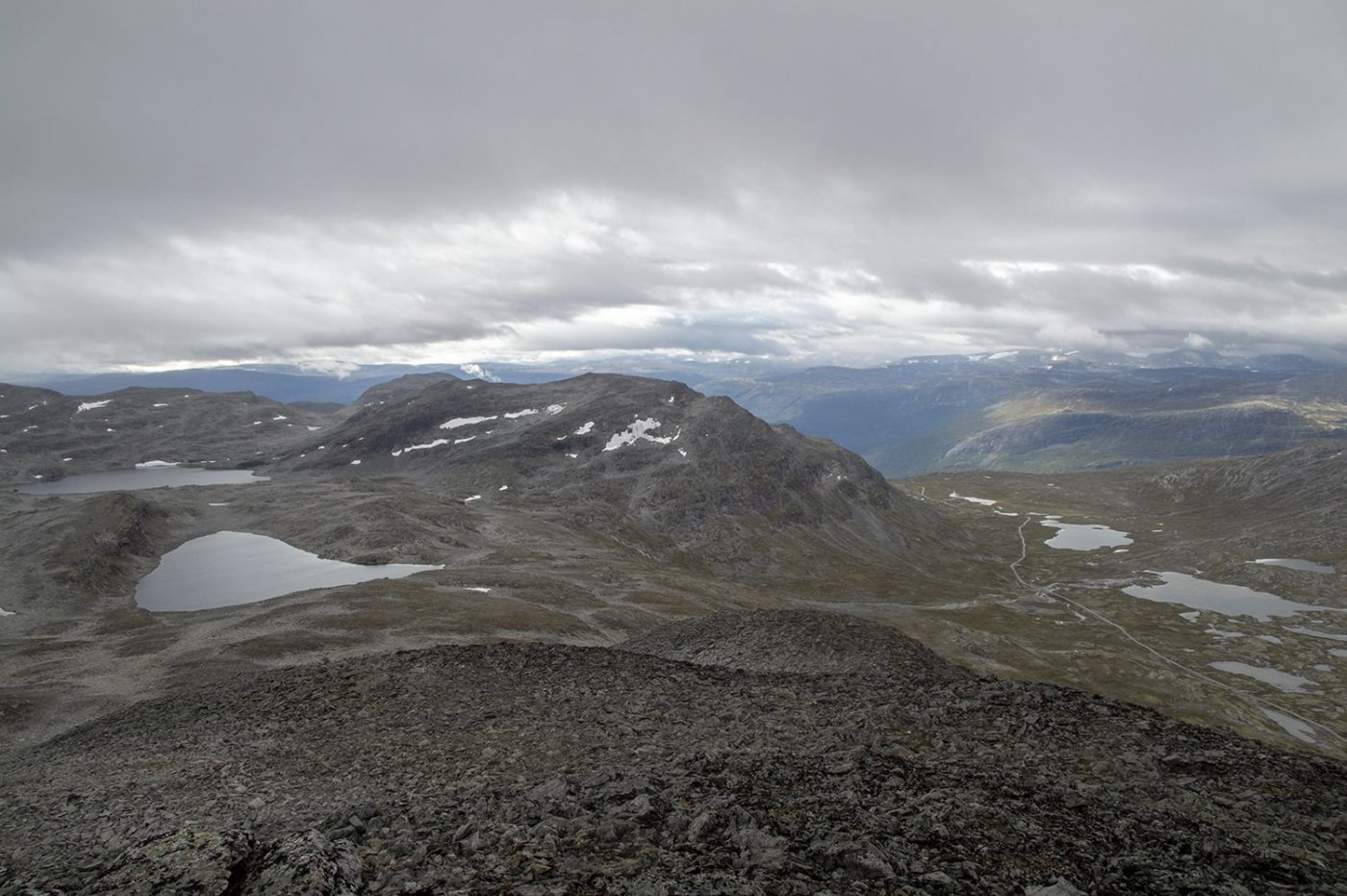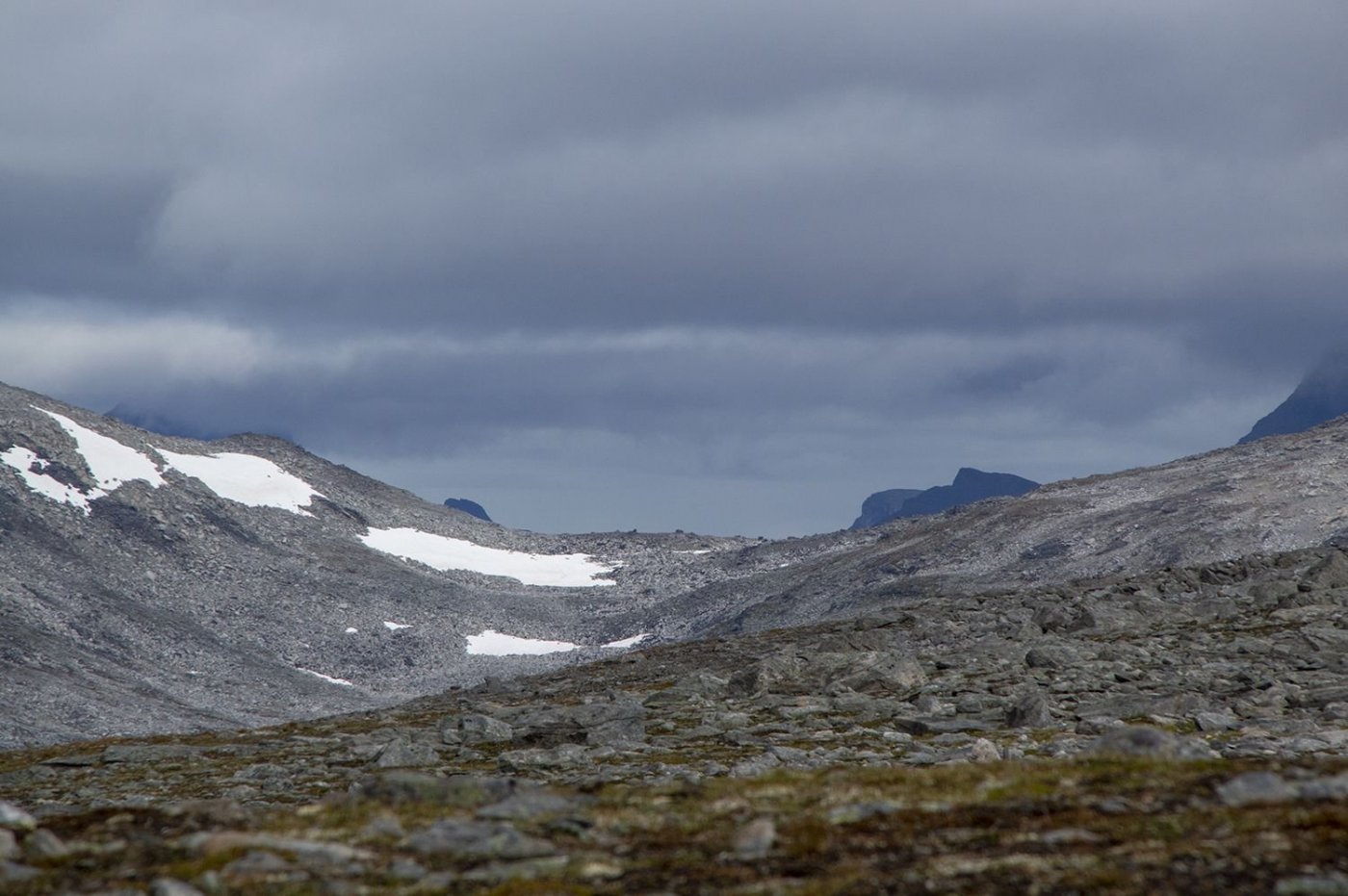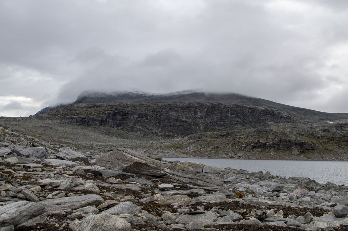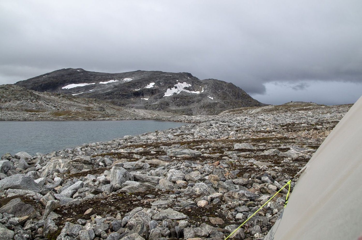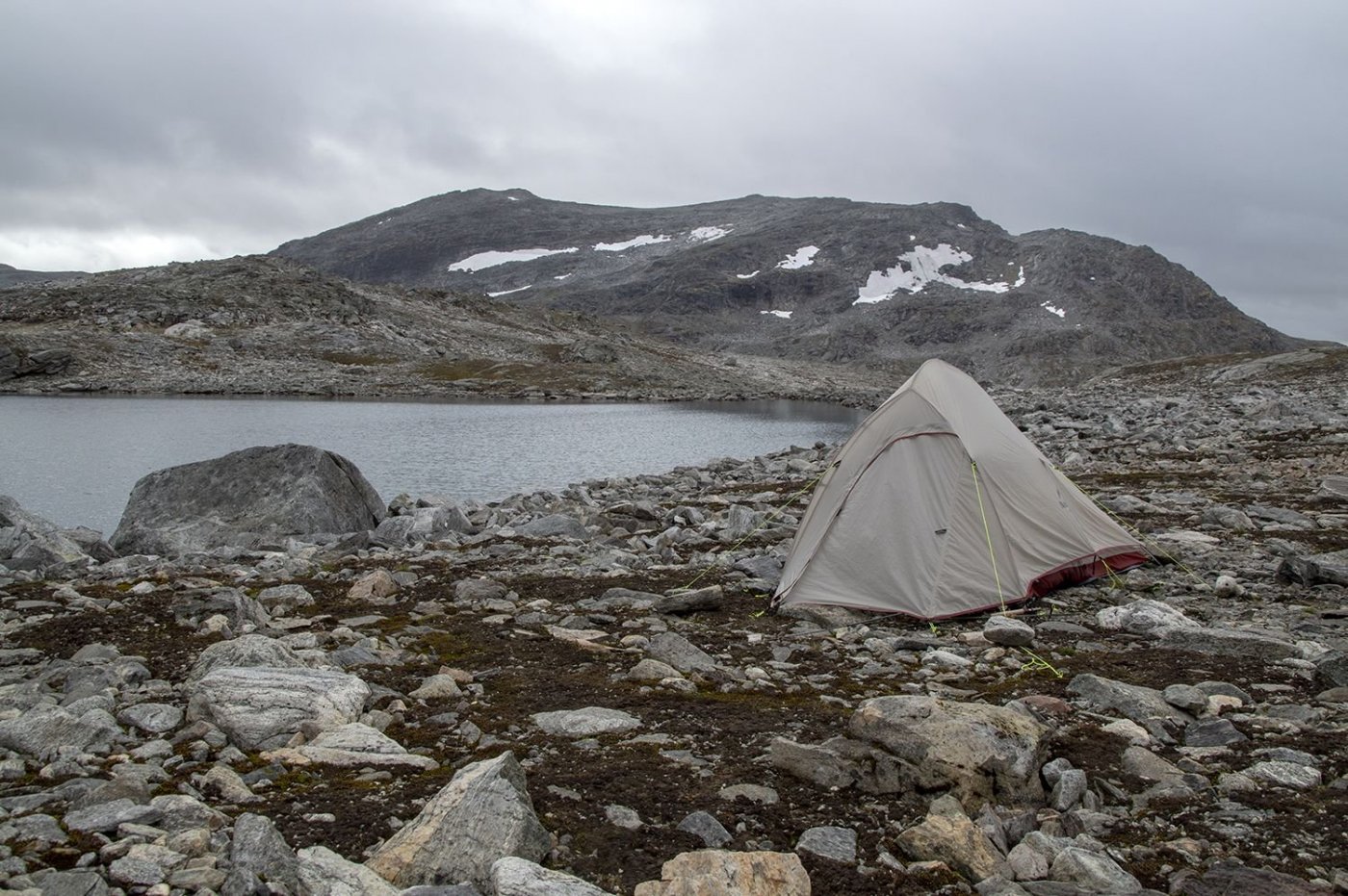 Kjørte fra Oslo til Isfjorden på torsdag for å hente en maskin (for jobb). Kjørte et stykke tilbake, tok av ved skilt Brude. Fulgte veien et stykke, før det kom skilt om at det var anleggsvei og ferdsel på eget ansvar. Kjørte ca. 1 mil fra E136 før jeg kom frem til der jeg skulle parkere. Da var klokken 20:30. Området jeg skulle til (Kalbotnen), var bare 2 km fra veien og et par hundre høydemeter. Passerte steinbuen Danielbua. Oppe ved første vann i Kalbotnen, startet letingen etter teltplass. Kom over denne; en tann? Ingen kjempefin teltplass, men helt OK. Kveldsmat ble egg. Ikke ofte jeg har med slik luksusmat, normalt er det tørrmat som gjelder på fjellturer. Sko og fiskeutstyr rett ved maten & matlaging. Ikke så farlig når man er på tur. "Billig"-teltet (Cloud 2 2018) fra Naturehike overlevde nattet med vind og regn. Noe som irriterer meg er at jeg ikke får strammet ytterteltet skikkelig på den ene siden, noe som gjør at det blir en del bråk når det er vind. Det samlet seg også noen vanndammer på matten under teltet på begge sider, men ikke noe fukt inne i teltet. I de sterkeste vindkastene var jeg redd for at hele teltet skulle revne. Rare tanker som kan poppe inn i hodet når man ligger i et telt på fjellet. Ellers fornøyd med teltet med tanke på at det kostet 1.300 kr, er ganske lett og tar liten plass i sekken. Litt uventet var det kommet nysnø på toppene over ca. 1900 moh. Her med utsikt mot deler av fjellet Kleneggen. Regn på vei, så da ble teltdøren lukket igjen. Nettbrett er "luksus"-varen jeg tar med på tur. Dette er helt nødvendig da jeg kjeder meg veldig raskt. Siden turen var planlagt å være 2 døgn, var også en tung nødlader med i sekken. Etter å ha ventet i en time, kom jeg meg ut. Fisket en liten stund, men ble veldig kald på fingrene. Trodde det fortsatt var sommer, så hansker hadde jeg ikke tatt med. (Men har ført det opp på pakklisten så det ikke glemmes å vurdere om det skal tas med på neste tur.) Tok en liten gåtur. Kom over denne benet i steinuren i 1600 meters høyde på vei mot toppen. Camp var ved det nærmeste vannet på venstre side. Inste Bruåbotnen Grått telt skiller seg dårlig ut blant all steinen... Kom over denne hodeskallen(?). Kanskje tannen ved camp, benet langt oppe i steinuren og hodeskallen er fra samme dyr. Kan det være reinsdyr? Et ønske om stekt fisk til lunsj... Ser ikke ut som Mammut-skoene (Mercury III Mid GTX) tåler mer enn 5 fjellturer. Betalte kontant, så håper jeg finner igjen kvitteringen. Hadde jeg bare fulgt mitt eget råd (ta bilde av kvittering)... Egentlig skulle jeg være på tur til søndag morgen, men regn og vind gjorde det litt utrivelig, så da reiste jeg like godt hjem fredag kveld. Synes det uansett var en fin tur i nytt område.