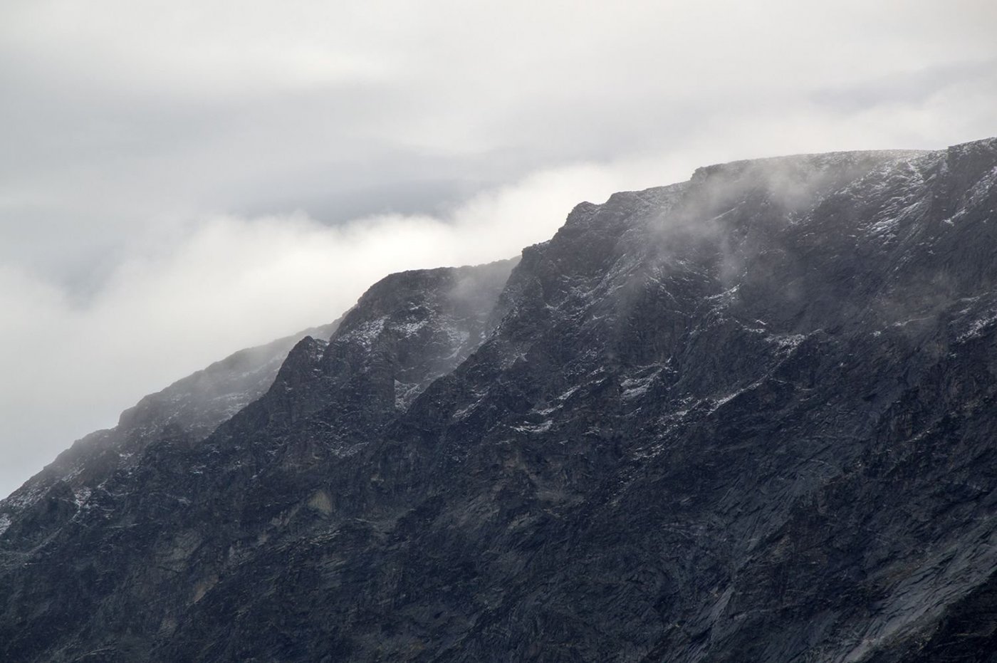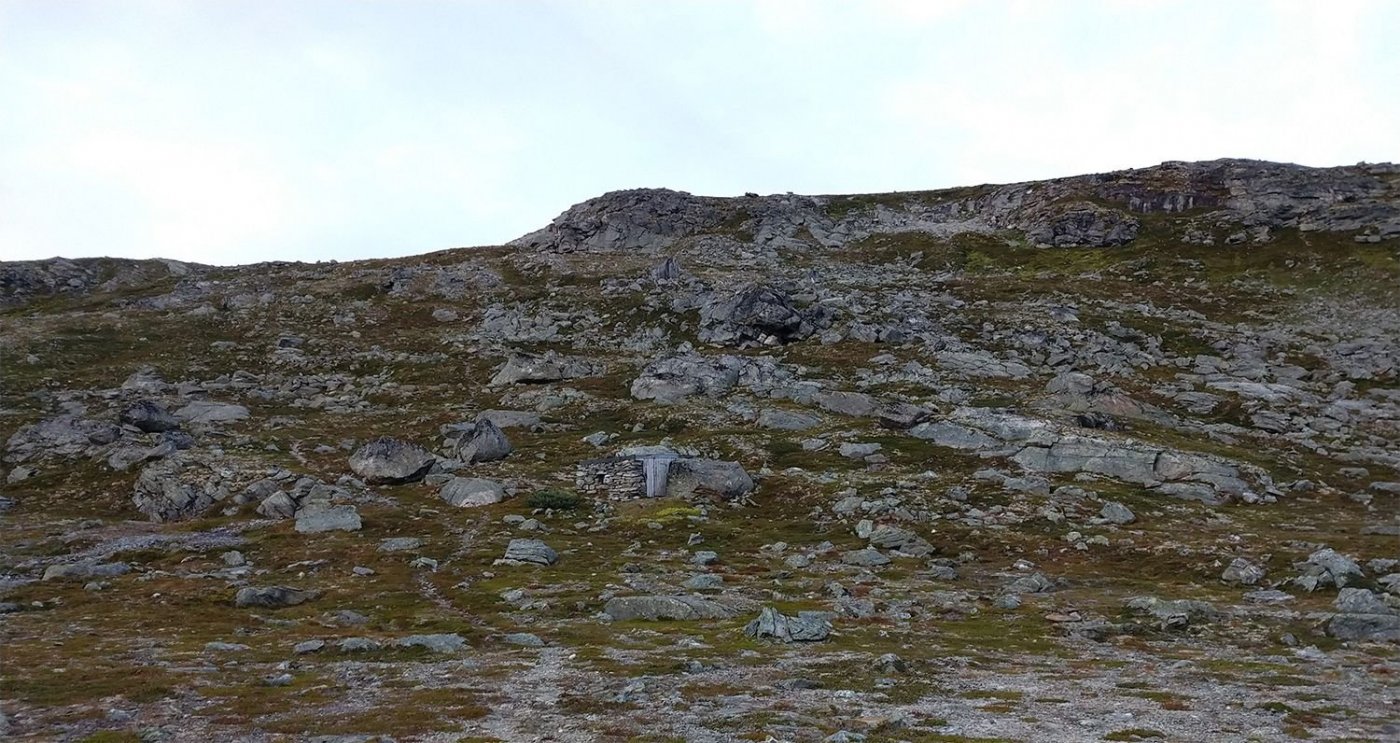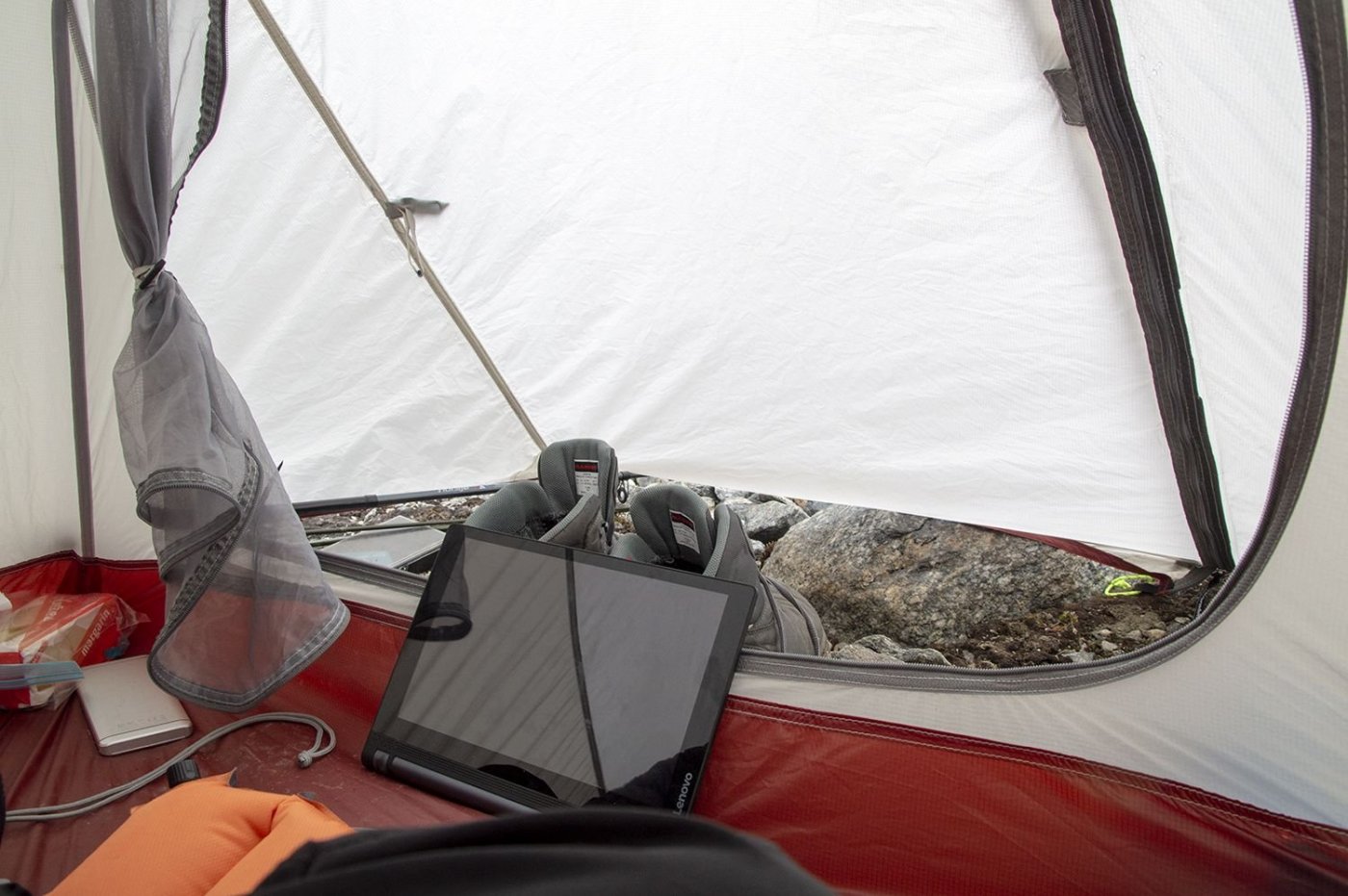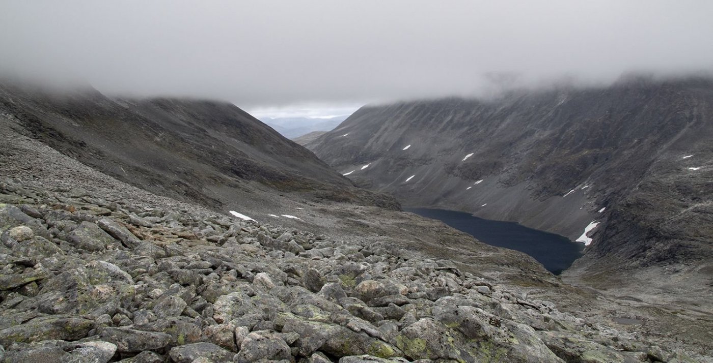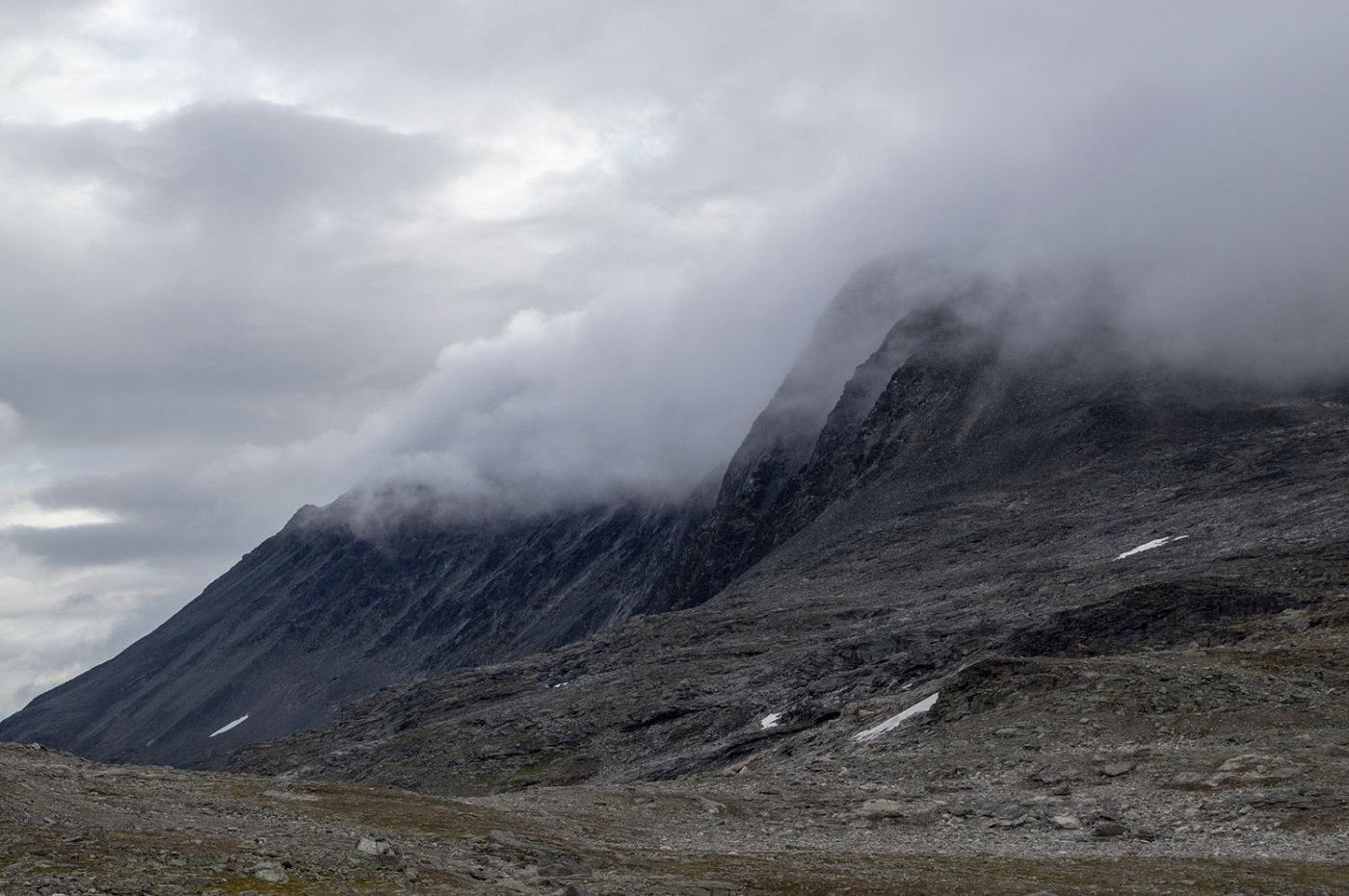 Kjørte fra Oslo til Isfjorden på torsdag for å hente en maskin (for jobb). Kjørte et stykke tilbake, tok av ved skilt Brude. Fulgte veien et stykke, før det kom skilt om at det var anleggsvei og ferdsel på eget ansvar. Kjørte ca. 1 mil fra E136 før jeg kom frem til der jeg skulle parkere. Da var klokken 20:30. Området jeg skulle til (Kalbotnen), var bare 2 km fra veien og et par hundre høydemeter. Passerte steinbuen Danielbua. Oppe ved første vann i Kalbotnen, startet letingen etter teltplass. Kom over denne; en tann? Ingen kjempefin teltplass, men helt OK. Kveldsmat ble egg. Ikke ofte jeg har med slik luksusmat, normalt er det tørrmat som gjelder på fjellturer. Sko og fiskeutstyr rett ved maten & matlaging. Ikke så farlig når man er på tur. "Billig"-teltet (Cloud 2 2018) fra Naturehike overlevde nattet med vind og regn. Noe som irriterer meg er at jeg ikke får strammet ytterteltet skikkelig på den ene siden, noe som gjør at det blir en del bråk når det er vind. Det samlet seg også noen vanndammer på matten under teltet på begge sider, men ikke noe fukt inne i teltet. I de sterkeste vindkastene var jeg redd for at hele teltet skulle revne. Rare tanker som kan poppe inn i hodet når man ligger i et telt på fjellet. Ellers fornøyd med teltet med tanke på at det kostet 1.300 kr, er ganske lett og tar liten plass i sekken. Litt uventet var det kommet nysnø på toppene over ca. 1900 moh. Her med utsikt mot deler av fjellet Kleneggen. Regn på vei, så da ble teltdøren lukket igjen. Nettbrett er "luksus"-varen jeg tar med på tur. Dette er helt nødvendig da jeg kjeder meg veldig raskt. Siden turen var planlagt å være 2 døgn, var også en tung nødlader med i sekken. Etter å ha ventet i en time, kom jeg meg ut. Fisket en liten stund, men ble veldig kald på fingrene. Trodde det fortsatt var sommer, så hansker hadde jeg ikke tatt med. (Men har ført det opp på pakklisten så det ikke glemmes å vurdere om det skal tas med på neste tur.) Tok en liten gåtur. Kom over denne benet i steinuren i 1600 meters høyde på vei mot toppen. Camp var ved det nærmeste vannet på venstre side. Inste Bruåbotnen Grått telt skiller seg dårlig ut blant all steinen... Kom over denne hodeskallen(?). Kanskje tannen ved camp, benet langt oppe i steinuren og hodeskallen er fra samme dyr. Kan det være reinsdyr? Et ønske om stekt fisk til lunsj... Ser ikke ut som Mammut-skoene (Mercury III Mid GTX) tåler mer enn 5 fjellturer. Betalte kontant, så håper jeg finner igjen kvitteringen. Hadde jeg bare fulgt mitt eget råd (ta bilde av kvittering)... Egentlig skulle jeg være på tur til søndag morgen, men regn og vind gjorde det litt utrivelig, så da reiste jeg like godt hjem fredag kveld. Synes det uansett var en fin tur i nytt område.