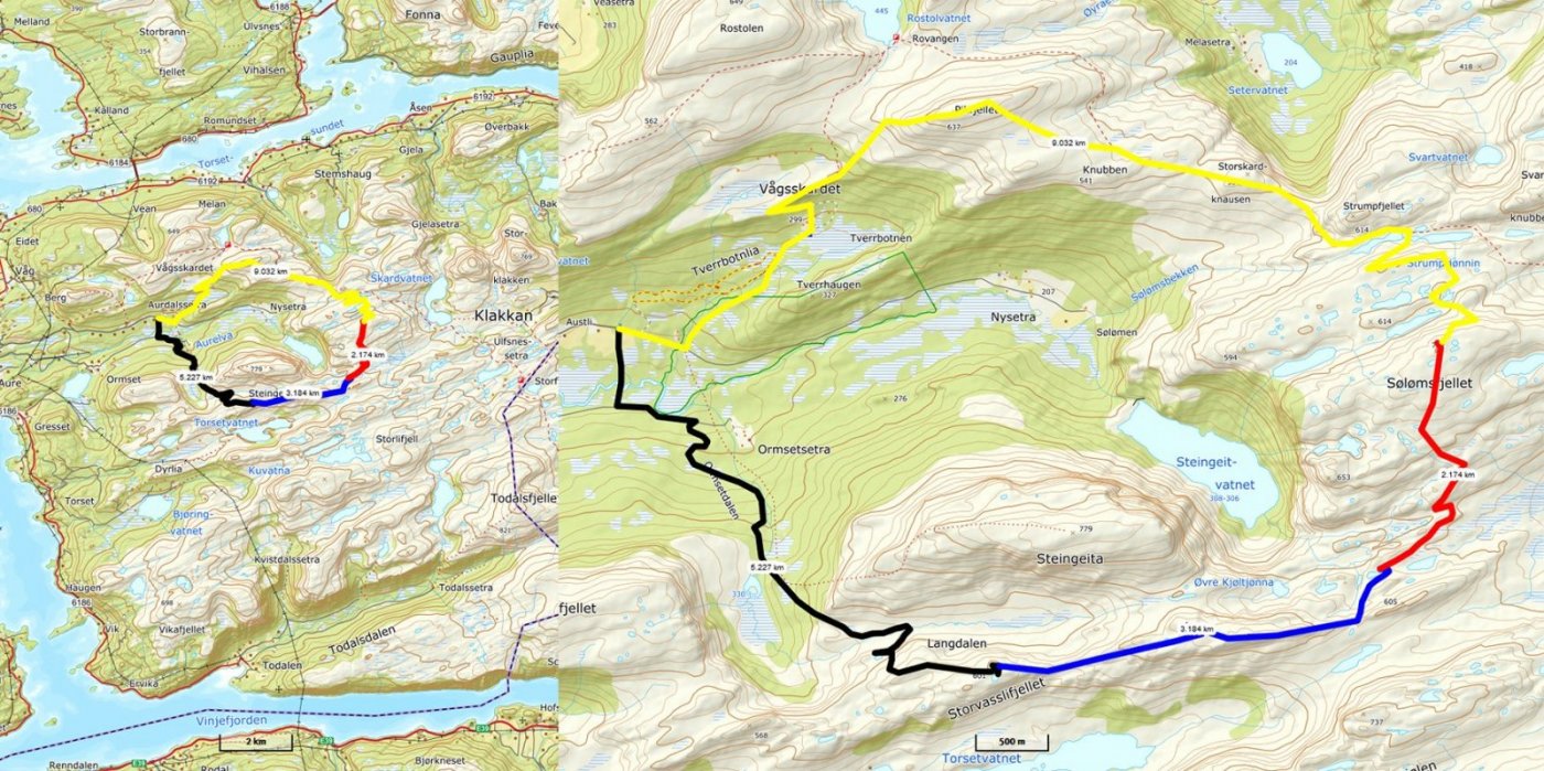 Hadde planlagt å gå over Søre Steinbruhøa og Nordre Steinbruhøa (i Sunndal kommune), med start ved Reinsvatnet. Plan var å starte å gå i 18-tiden for å ta unna så mange kilometer som mulig. Men ble forsinket, og startet ikke før 19:30. Etter ca. 3 km, var klokken allerede 21:00. Det begynte å bli dårlig sikt. Egentlig skulle jeg gå et par timer til. Litt skuffet, slo jeg opp teltet og overnattet. Det er det fine når man har med alt i sekken, det er bare å sette opp teltet når man må. Det var kaldere enn forventet. Neste tur må skumunderlaget være med, ikke bare luftmadrass. Kroppen ble veldig kald, og da måtte jeg snu meg ofte. Alltid litt "spenning" i å åpne teltdøren om morgenen for å se værstatus. Fin utsikt etter noen få minutters gange. Det er slik som gjør at jeg liker å gå i fjellet. Hovedmålene ikke synlig. Mistet mye av motivasjonen siden jeg nå visste at jeg ikke ville greie å gå planlagt tur. Satset på at det var mulig å komme meg ned igjen et stykke lengre frem. Det var ganske bratt, men gikk fint å komme ned til flatere terreng. På slutten begynte jeg å bli veldig sliten, vondt i både beina og ryggen. 1-2 km fra parkeringsplassen møtte jeg ca. 15-20 personer i løpet av 15 min som var på vei ut i fjellet. Var tilbake ved bilen 12:45. Ikke noe spesielt eller spektakulært som skjedde på turen, men synes det var en fin mini-tur. Tviler på at jeg hadde greid å gått opprinnelig rute, så jeg må nok roe ned egne forventninger og planlegge kortere ruter. Hjelper ikke på saken at jeg er utrolig stresset, og tar sjeldent pause når jeg først har startet å gå. Det er noe jeg må prøve å forbedre meg på. Tegnet inn ca. rute. Hadde det vært GPS-sporing, ville det nok blitt mye mer hit-og-dit, enn disse fine/rette strekene. 😀