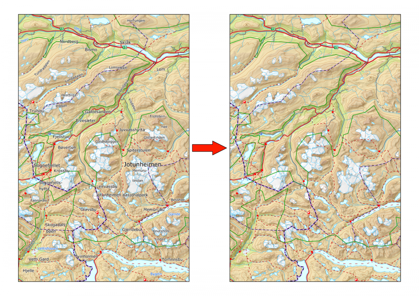 Om man benytter Topografisk norgeskart 4 gjennom WMS-serveren til Kartverket har man muligheten til å velge hvilke "underlag" som skal lastes ved import av laget. Stedsnavn ligger som et eget underlag for Topografisk norgeskart 4, så da har man muligheten til å fjerne stedsnavn også fra bakgrunnslaget, men å endre innhold/formatering er nok verre, Ved å legge til https://openwms.statkart.no/skwms1/wms.topo4 i URL-feltet for nytt WMS-lag og velge alle "underlag" foruten Stedsnavn og velge "Legg til" får man bakgrunnskart uten stedsnavnpåskriftene 🙂 Merk at man her må sortere underlagene i synkende rekkefølge i ID-kolonnen for at kartet skal bli riktig! Slik kan man velge bort både stedsnavn, høydepunkter, tekst osv. for et bakgrunnslag i QGIS: