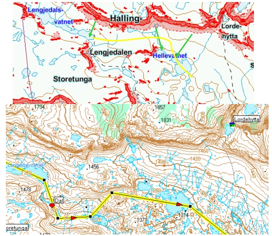 Og her er turkameraten. Jeg synes ruta fra Lengjedalsvatnet til Hellevatnet igjennom Lengjedalen virker noe utsatt. Jeg har tegnet inn en alternativ rute i gult. Det som forundrer meg når jeg ser på Forsvarets skredkart er hvorfor ikke eventuelle snøras kan dra helt ned til bunnen slik som jeg har tegnet inn på vedlegget (grønne piler). Mads /Heller tjukk og varm enn flat og kald