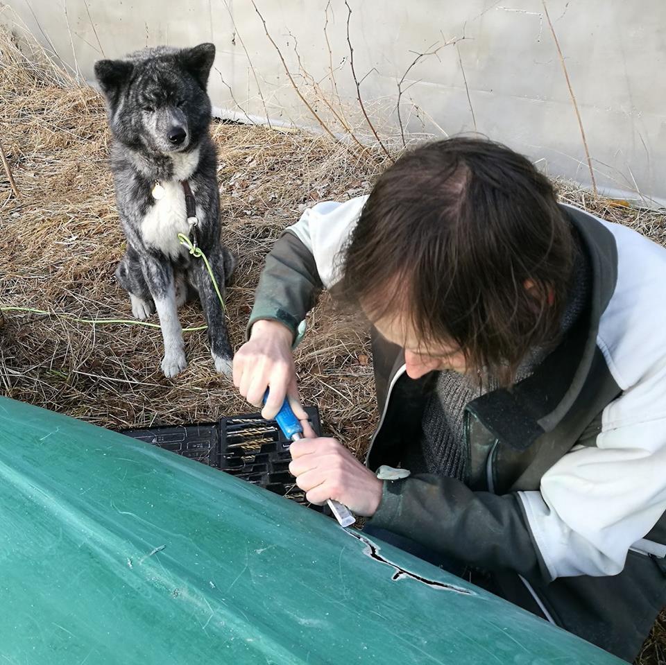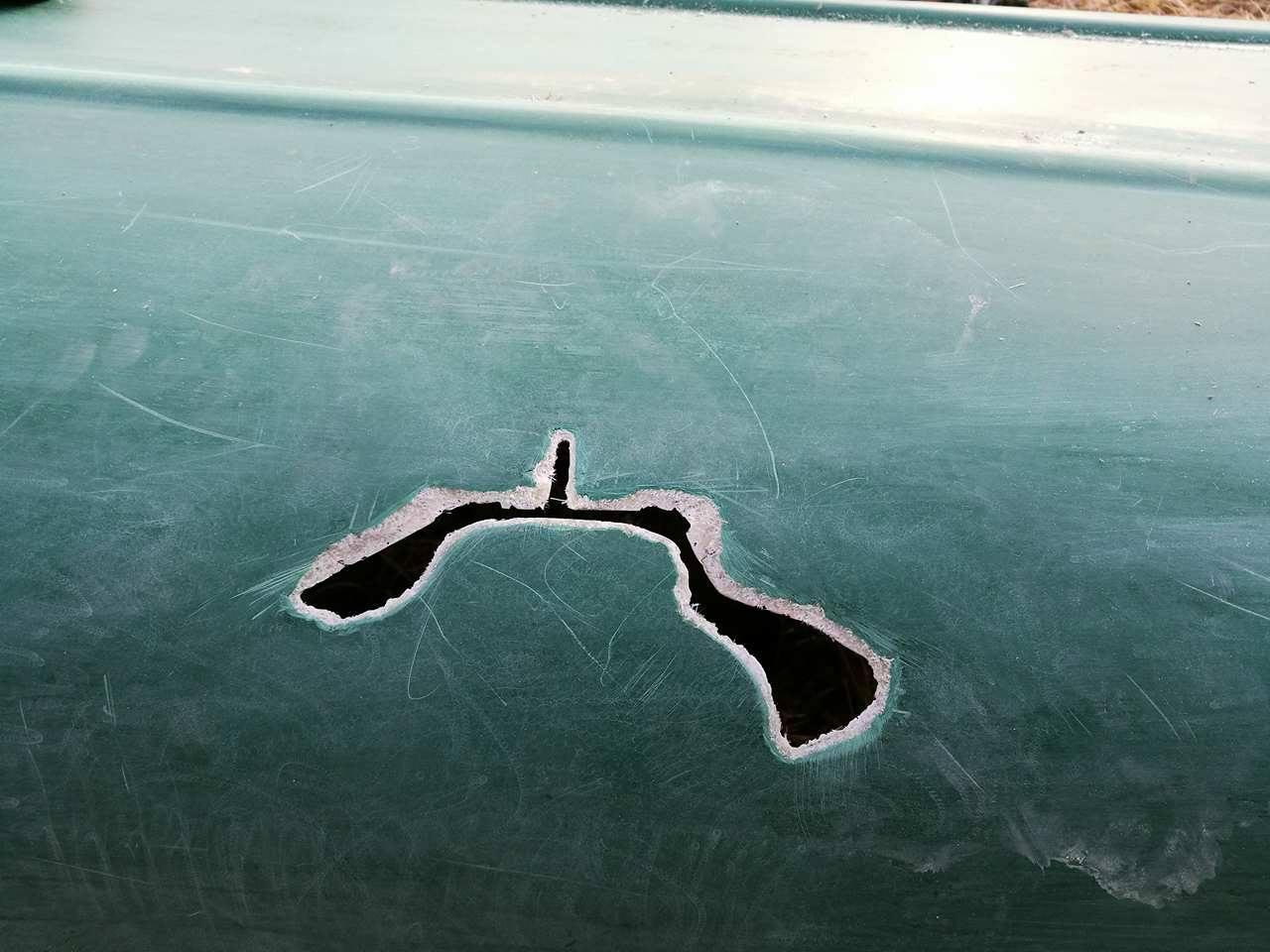 Da har vi fjernet ødelagt glassfiber og pusset til vi ikke orket mer. Nå skal den få seg en grundig vask før vi tetter igjen hullene. Vi bruker masker da vi har fått med oss at glassfiberstøv ikke er så digg å ha i lungene, bildet er bare for å teste hva vi kan skrape hull med