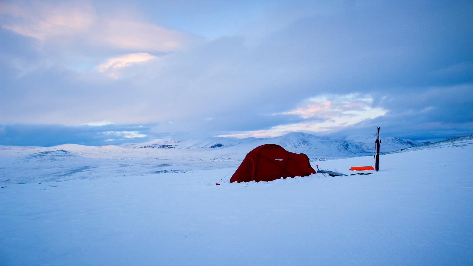 Les testen på bloggen min ved å trykke her! Dette teltet ble kjøpt inn primært til vinterturer og nå har det fått være med på turer i all slags vær de to siste vintrene. Her er mine erfaringer med teltet så langt. Bergans Helium Dome er et 4-sesongers kuppeltelt på cirka 5 kilo. Forholdsvis lett tatt i betrakning 5 stenger og store storm-matter. Jeg bruker teltet kun vinterstid da jeg syntes det blir for stort og tungt å ha i sekken. Kuppelformen gir både fordeler og ulemper. Den største fordelen er stabilitet i vind og innvendig romfølelse. Særlig høyden er fantastisk. Her er det 130cm innvendig høyde, noe som gjør det komfortabelt å sitte og svært anvendelig å tørke klær på det medfølgende, store tørkeloftet. De fire kryssende stengene gjør at duken presses godt ut og skaper forholdsvis rette vegger som gjør romfølelsen god. Bergans annonserer teltet som et tremanns. Sommerstid kan det fungere med tre personer med normalbredde underlag. Vinterstid er teltet best egnet for to. Da har man god plass, som man trenger med alt plasskrevende utstyr og bekledning vinterstid. Oppsett Teltet er konstruert litt motsatt av det vi er vant til fra nordiske telt. Dette teltet settes opp med innerteltet først. Det er verdt å merke seg at også innerteltet er vanntett, så det er ikke noe problem om det regner når teltet sette opp. Det er fire fargekodede stenger som krysser hverandre og de er forholdsvis enkle å tre, men det lønner seg å tre inn de «innerste» først og man trer alle stenger før man begynner å spenne opp teltet. Når innerteltet er spent opp trekker man ytterduken over og klipser fast i innerteltet med plastklips. Dette kan være en litt selsom opplevelse i sterk vind. Man er da relativt avhengig av å være to slik at den ene kan klipse og den andre holde teltet Når ytterduken er festet i innerteltet setter man inn den siste stanga som spenner opp forteltet. Teltet har svært store storm-matter rundt hele så det er enkelt å få spent duken skikkelig ut. Dette sikrer godt feste og et lunt inneklima. Praktisk bruk Teltet har et forholdsvis lite forelt med inngang fra begge sider, i tillegg til inngang fra baksiden av teltet. Dette sikrer at man alltid har en inngang i le for vinden. Mellom dørene i forteltet er det et lite «vindu» som gjør at man enkelt kan sjekke været uten å måtte åpne teltdøren. Smart! Når det er nok snø til å grave ut en skikkelig grop oppleves forteltet som stort nok til at det er enkelt å komme seg ut og inn samt smelte snø i forteltet. Er det lite snø blir det litt i trangeste laget å snirkle seg ut og inn de forholdsvis små døråpningene. Særlig når det er kaldt og man er kledd i mange lag. Innerteltet er romslig og takhøyden svært god. Dørene på begge sider kan åpnes helt og er todelt slik at det blir helt tett, eller helt åpent med bare myggnetting. I toppen av teltet er det to store lufteluker som kan justeres og lukkes innenfra. Om det blåser mye er det praktisk å kunne åpne luken bare på lesiden for å unngå føykesnø inn. Teltet oppleves som veldig lunt, men det er viktig å være klar over at det kreves god lufting når man fyrer med primus. Om man ikke har åpne luker i taket og dørene er helt igjen blir innerteltet i praksis helt tett. Dette er farlig! Jeg pleier derfor alltid å ha en glippe på begge dørene og minst en av taklukene åpne. Da sikrer man god gjennomlufting samtidig som teltet oppleves lunt og fint. Har faktisk oppnådd opp mot +20 grader inne når det har vært under -10 ute, bare ved å fyre lett med brenneren i forteltet. Teltet leveres med et stort «tørkeloft» som henges opp i taket. Dette fungerer svært godt når man fyrer med brenner siden man får god luftgjennomstrømning mellom loftet og ut luftelukene i toppen, i tillegg til at varmen naturlig nok strømmer opp i toppen av teltet. Her legger jeg hansker, luer, sokker og annet som er fuktig og det meste tørker raskt til neste gang man skal ut. Dimensjonene på innterteltet er 22 0x 195 cm. Det går greit med to Arctic Beddings og to smale bagger, men det er ikke mer plass enn det må i lengderetningen for en kar på 190. At teltet blir markedsført som vintertelt til tre personer er ikke riktig i mine øyne. Kort oppsummert: Pluss: Robust konstruksjon som tåler mye vind og snø. Romslig innvendig med svært god takhøyde. Generelt høy kvalitetsfølelse. Minus: Litt tungvint å sette opp, særlig alene i sterk vind. Plastklipsene som fester yttertelt er ikke optimale. Litt knotete å feste og kan fryse om man får snø i dem når man klipser. Litt lite fortelt. Teltet er ganske aggresivt priset, så dette er mye vintertelt for pengene! Les testen på bloggen min ved å trykke her!