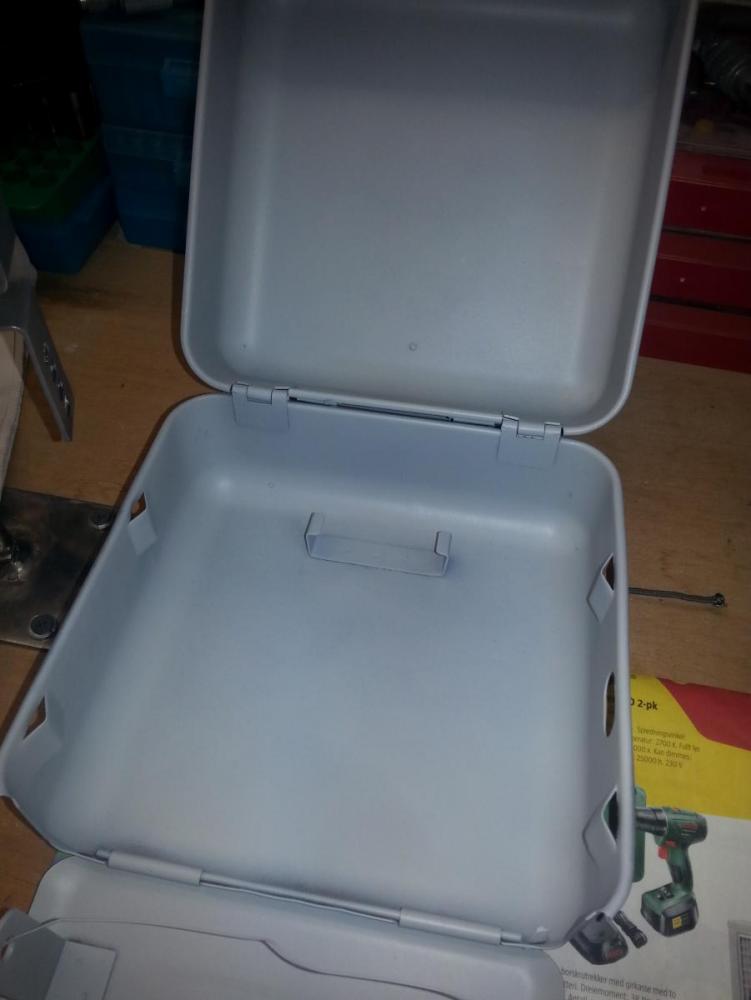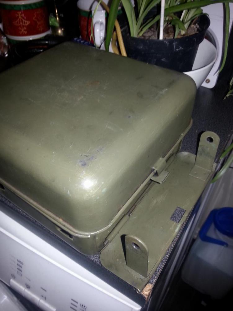 Før, under og etterbilder:) 111 med bråkebrenner og delbar kasse. 111 med stillebrenner og påkladdet maling fra forsvaret, pluss brennmerker fra de beryktede tusen HV-bål:) Elektrolysebad. Strekkmetall i strips på sidene av en plastkasse, plusspoler fra batteri/batterilader på disse, minus på kassa, krystallsoda i vannet. Maling og rust har det travelt med å fjerne seg fra kassa:) Ferdig strippet. To-tre strøk med grunning... Og det ferdige resulatet, fire strøk med svart matt! Kassa med stillebrenner må vente på riktig flaske grønn spray. Ellers ble det riktig bra, og elektrolysebad anbefales. Det krever lite, Meny har Krystallsoda, og resultatet blir veldig bra.