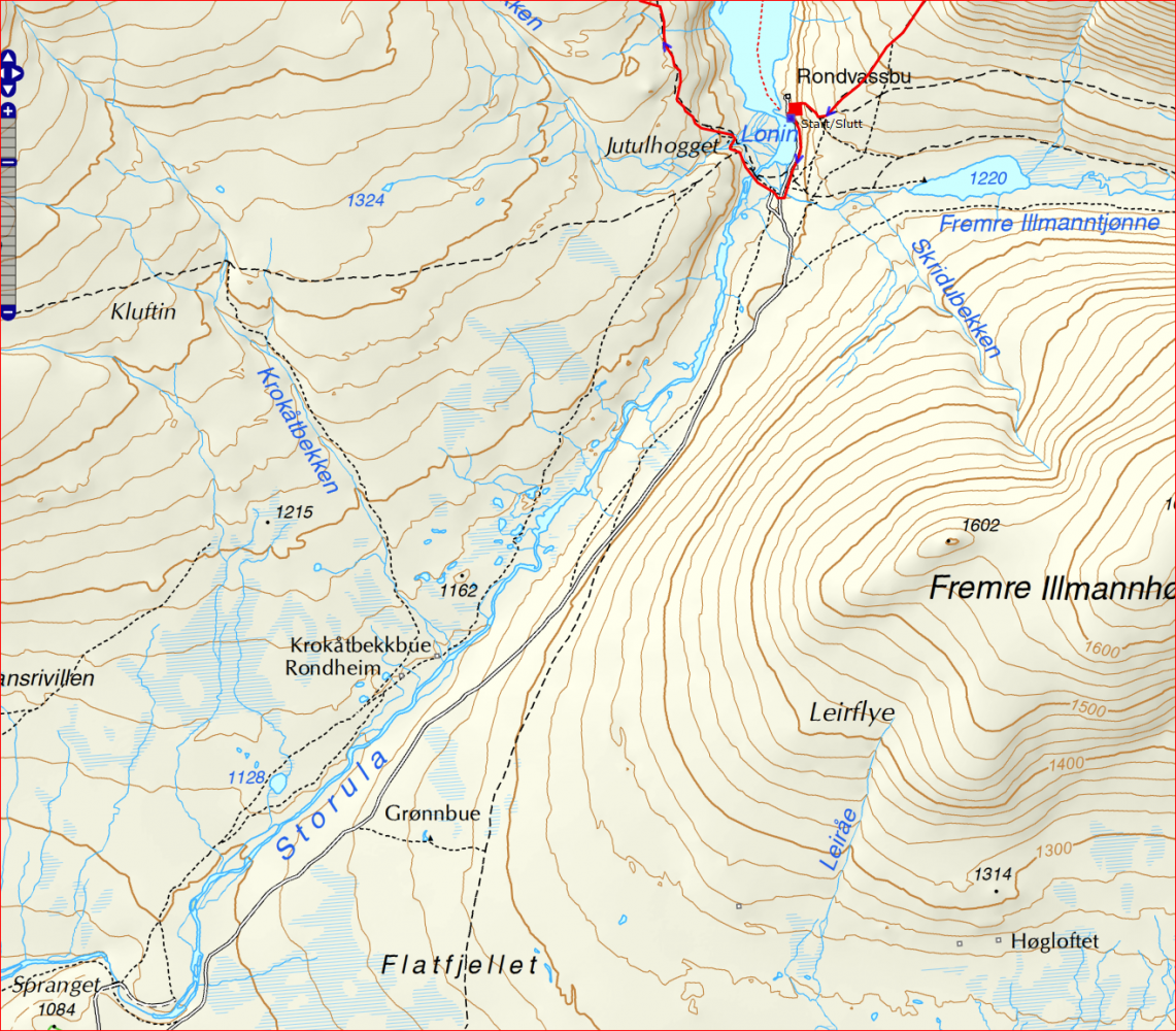 Er ikke så mange vann på transportdistansen, men du har jo Fremre Illmanntjønne. Legger ved kart her så du kan se muligheter. En tanke var at dere kunne gått stien fra Rondvassbu og krysset ned ved Krokåtbekken. Jeg har ikke gått der selv, så aner ikke hvordan den turen er.