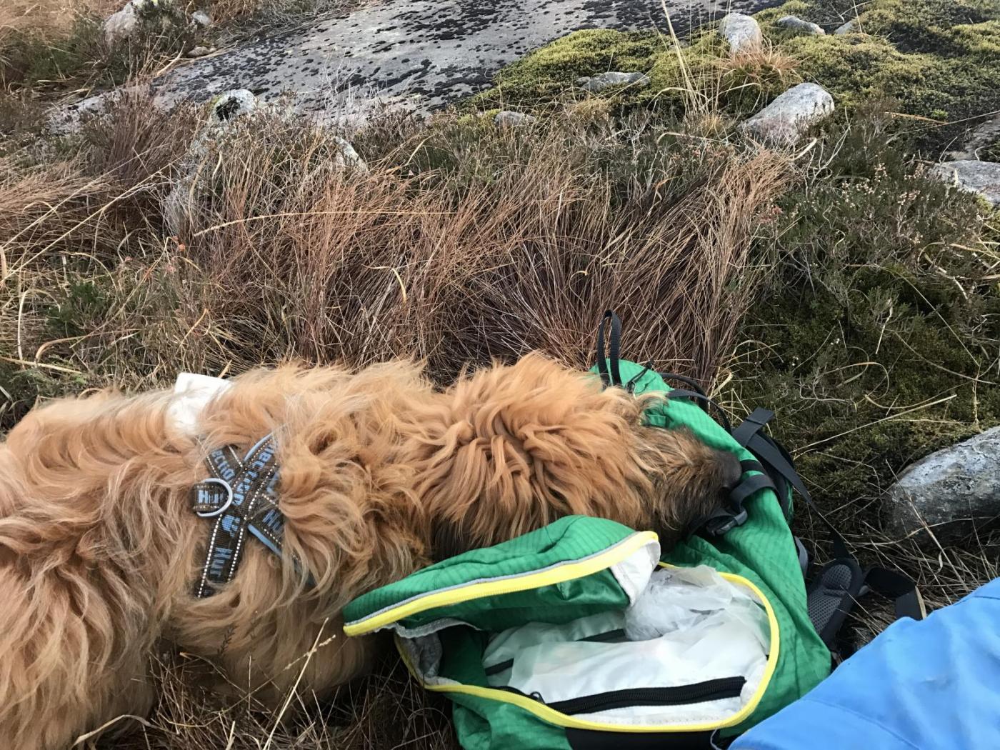 Jeg fikk meg en turstekepanne denne uka og ville ut og prøve den. Nå har også valpen vokst seg litt større og jeg tørr å ha den med på litt lengre tur (og med lengre mener jeg et par tre kilometer og god tid). Så når jeg følte vi hadde kommet langt nok prøvde jeg å finne en grei plass å gjøre opp bål i solen og i ly for vinden. Det var enklere sagt enn gjort, fordi det blåste litt for godt overalt og solen gikk plutselig ned. Men jeg fikk nå fyr på bålet etter hvert og peanøttkylling i wraps ble tilberedt mens jeg så på en fin himmel over fjellene. Galileo slo seg sånn halvveis til ro med sekken til hodepute. Ellers lå han strak ut resten av dagen og jeg var fornøyd med stekepanna mi!