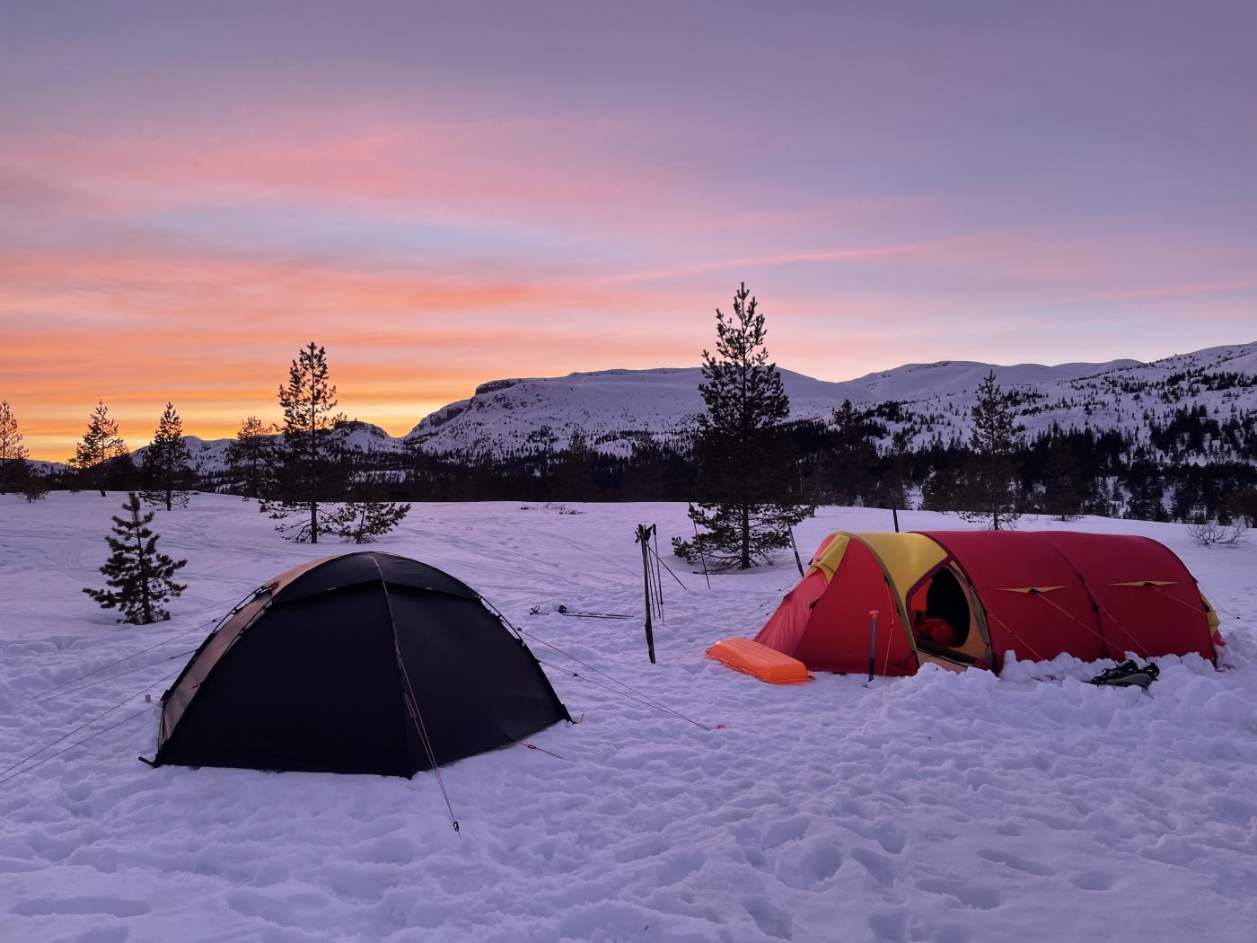 Kjekt å ha ett stort telt som man kan samles for mat, smelting av snø etc. Så når natten kommer og man skal gå til ro går man hvert til sitt i sine respektive mindre telt. Det har vi hatt hell med. Her er vi kjernefamilien på tur, to voksne og to barn. Staika 2 mannstelt og Spitsbergen 4 Camp.
