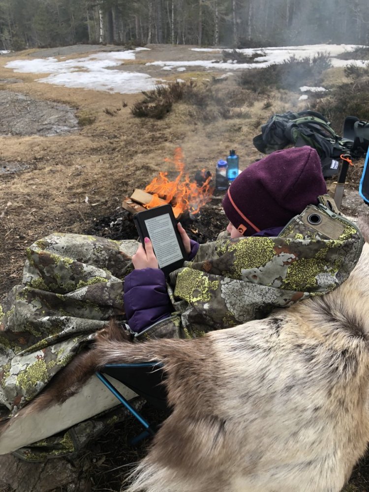 Tok med 10-åringen på båltur i efta med innlagt middag på stormkjøkkenet. Lot det bli litt glamping over det hele med Helinox chair One, reinskinn, Jervenduk og Kindle lesebrett. Ble tre timer i frisk luft og bålrøyk.:-) Greit å dele søskenene opp noen timer i disse noe spesielle dager....