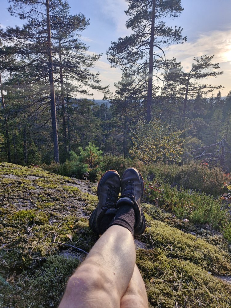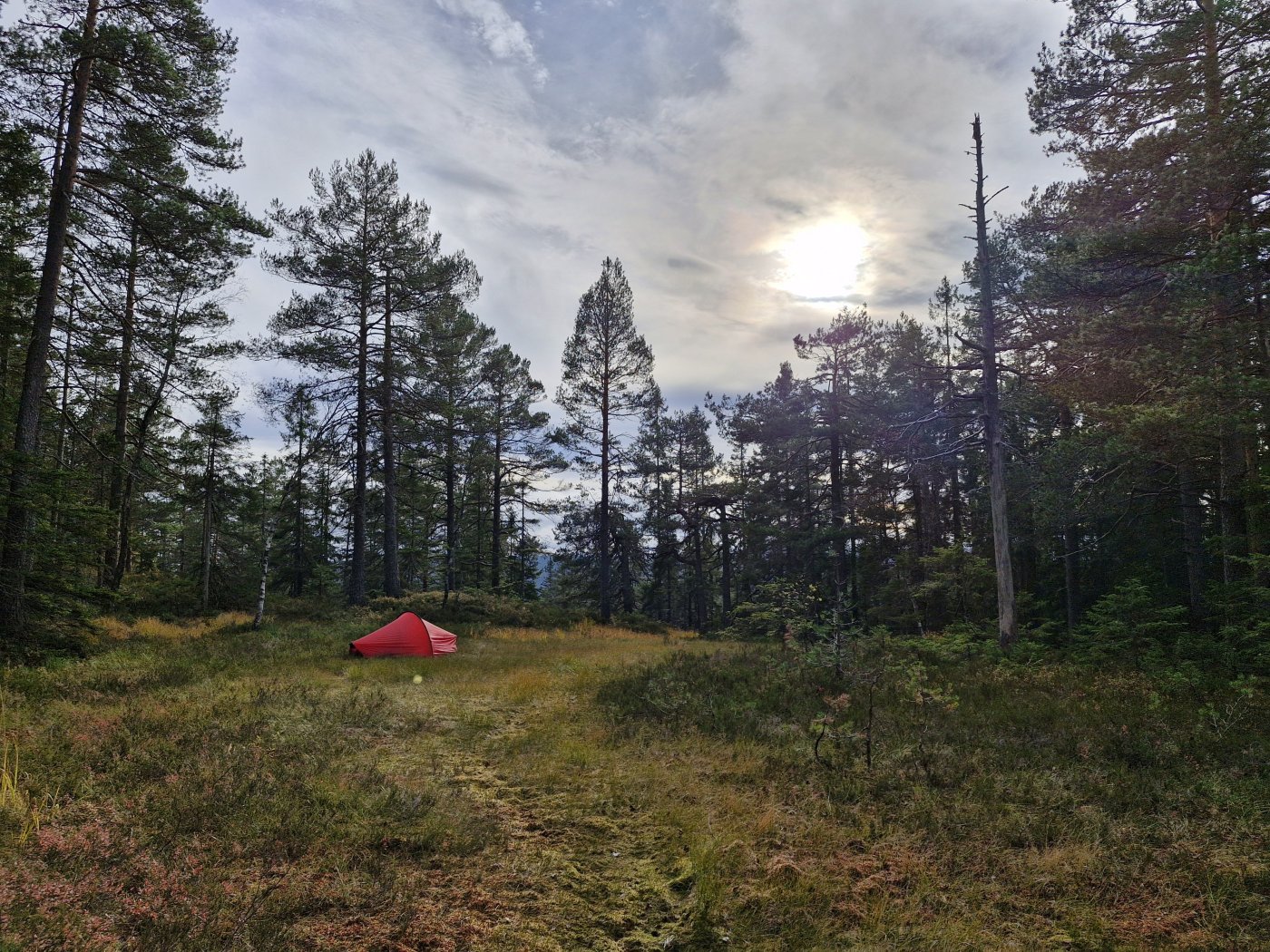 En natt innover fra Maridalen, en måned siden forrige telttur, det var godt. Et stykke på sti, et stykke utenom sti, til tider ulendt. Så etter traktkantarell i et område jeg har funnet dette tidligere, men ingen spor av dette nå, litt kjedelig. En håndfull hjortelusfluer underveis, ikke spesielt plagsomt. Heller ikke knott eller mygg som jeg merket da jeg var ute og gikk og i leiren. Satte meg ned for å nyte kveldssola ikke lenge før jeg kom til teltplassen som jeg har brukt et par ganger før: en kolle/knaus akkurat stor nok til et solotelt.