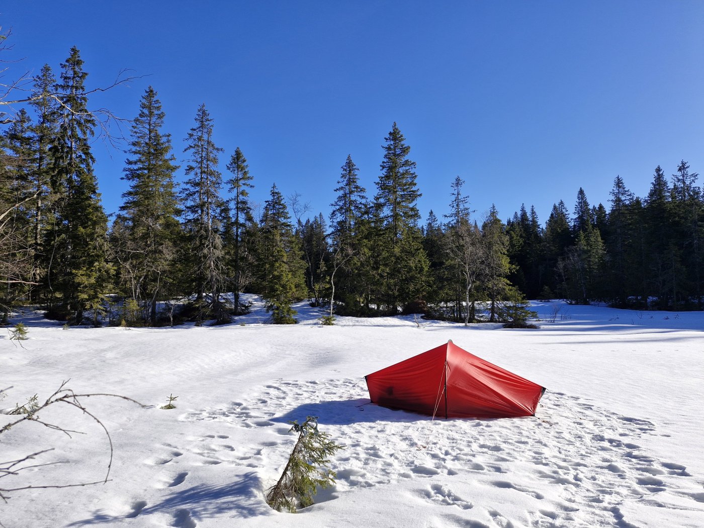 Et lite døgn på tur, Maridalsalpene igjen, rundt to timer sykling og gåing hjemmefra. Kom fram i går kveld i sludd, litt utrivelig, og satte opp teltet på 10-20 cm våt snø. Brukte barmarksplugger, og siden det skulle fryse på, så tråkket jeg dem ikke helt ned, og kunne sparke dem inn for å løsne dem da jeg rev leiren i dag. Da ble det 49 utenetter år, fornøyd med det.