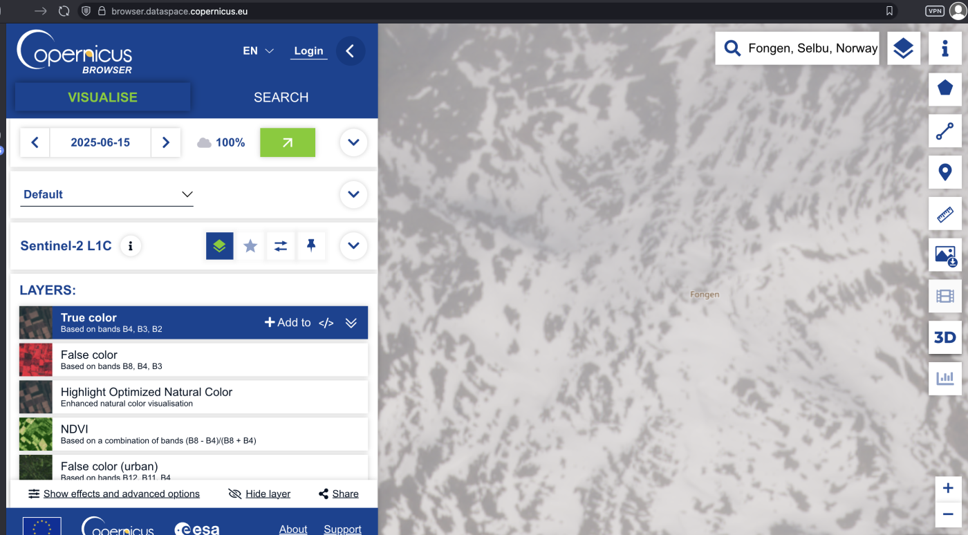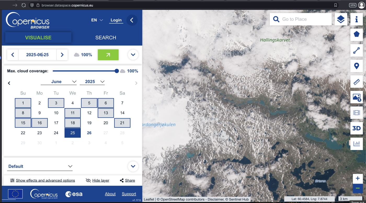Det kommer bilder hver andre til fjerde dag på Copernicus Browser. Hvor mye man ser av landskapet avhenger selvsagt av skydekket. Bildet fra i går, med listing av hvilke datoer det er bilder for uansett skydekke. Det går an å zoome inn på bildene. Et utrolig godt planleggingsverktøy! Selv skal jeg på telttur fra Haugastøl til Finse i neste uke, på nordsiden av toglinja / under Hallingskarvet. Snøen pleier være ganske fast på denne tiden av året, jeg tenker ikke ta med meg truger. Gåing på sommersnø tar bare litt mer tid og energi enn å gå på barmark. Det er så godt som bart rundt Haugastøl, men mer snø mot Finse. Antagelig finner jeg teltplass på barmark nær Finse, men jeg skal helgardere meg ved å ta med spade og fullt sett med snøplugger, så kan jeg få forankret teltet godt, uansett hvor jeg velger å slå meg ned.