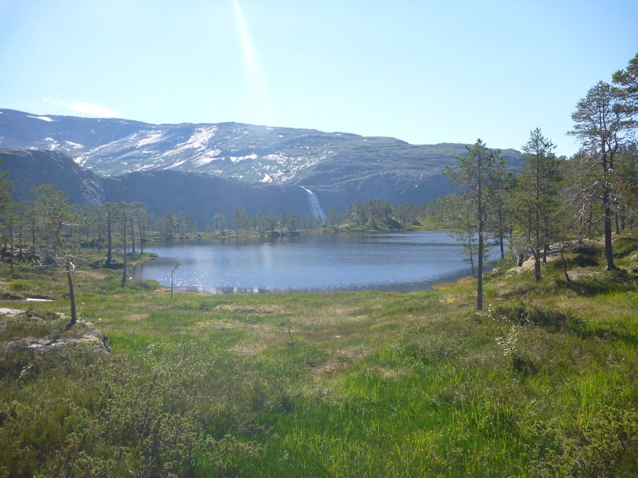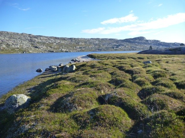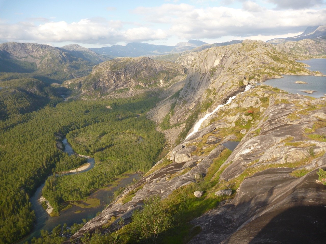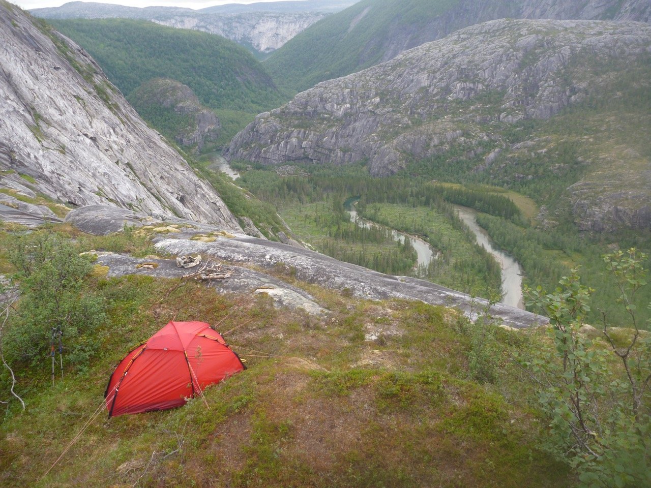 Har akkurat kommet tilbake fra Rago nasjonalpark. En viktig grunn til at jeg dro dit er spektakulære Litlverivassfossen, og et håp om å få tatt noen fine bilder der av det kjære, røde teltet mitt. Før turen trodde jeg at jeg kanskje kunne sette opp teltet på svaene i forgrunnen, men de var enten for skrå, eller var flate nok men lå midt i stien. Så jeg endte med å sette opp teltet nedenfor stien, mot kanten av stupet. Teltplassen og utsikten var flott, men bildene fikk jeg ikke til helt som jeg hadde håpet. Med riktige lysforhold, kan et strategisk plassert telt her bli bra. Vann 178 vest for Helligholet, Litlverivassfossen i bakgrunnen.