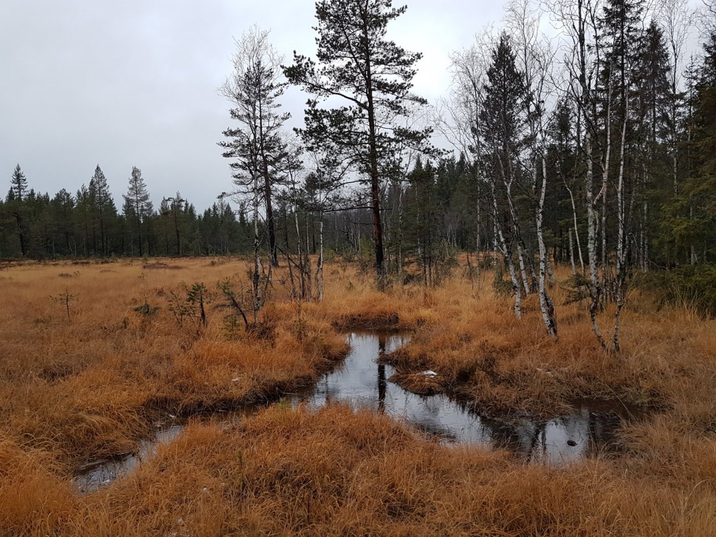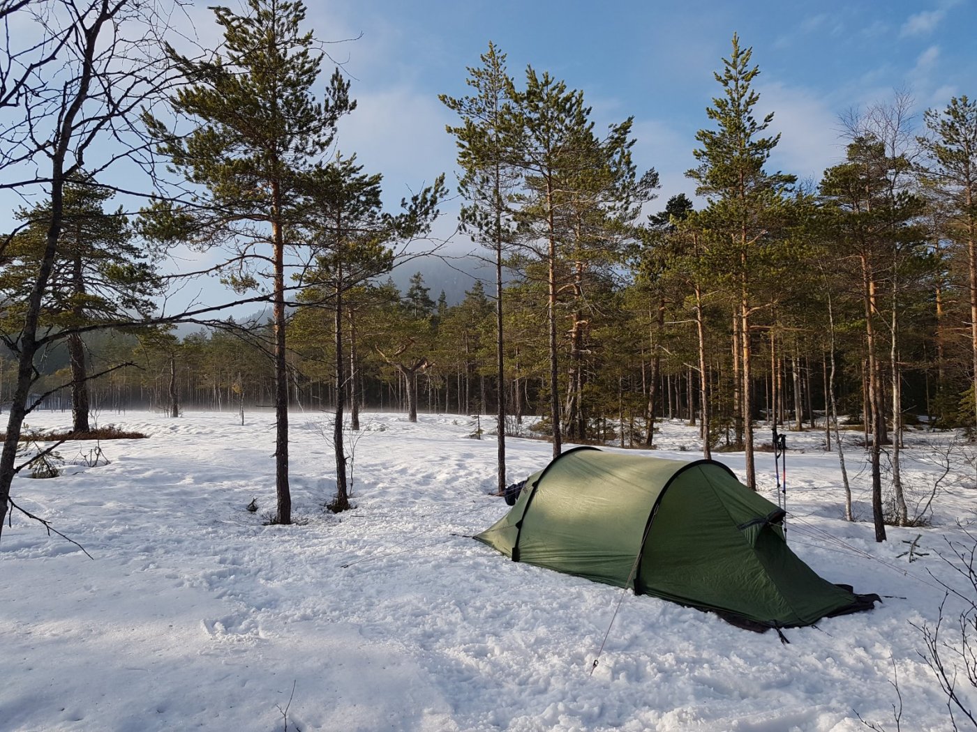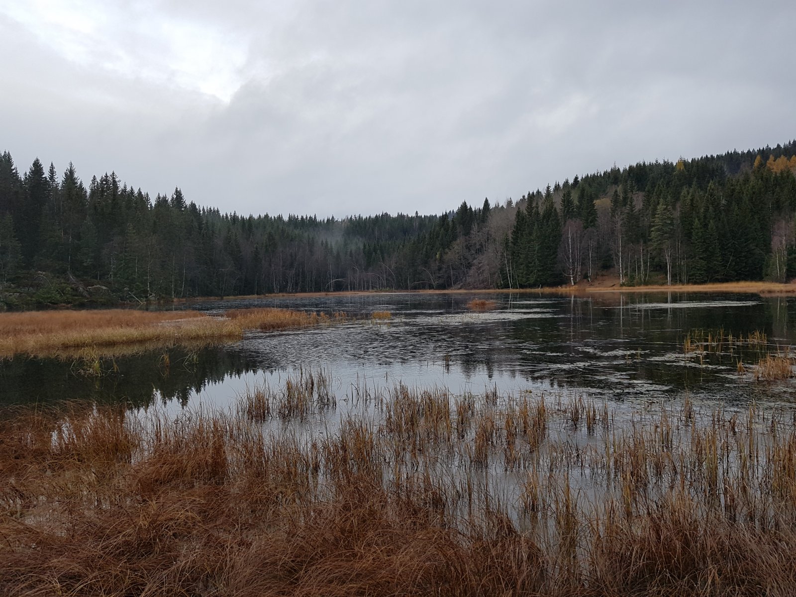 Var på tur i helgen, i Maridalen i Nordmarka. På lørdag startet jeg på Skar, fulgte skogsbilvei til Øyungen, videre til Kalven (283 moh), med delvis ishinne: Videre forbi Liggeren, over Gørjehøgda. Etterhvert tok jeg av fra stien i nord-nordvestlig retning. Grått og regn i lufta, rester av snøen som falt tidligere i uka, stille og fint: Ikke lenge etter kom jeg til Søndre Lamyr, hvor jeg slo opp teltet ikke langt fra bildet: Brøt leir ganske sent på søndagen, kom meg avgårde kvart på fire. I halv fem-tiden hadde jeg Liggeren gård i forgrunnen, Øyungskollen til venstre, Øyungen nede til høyre: Brukte hodelykt siste timen ned til Skar.