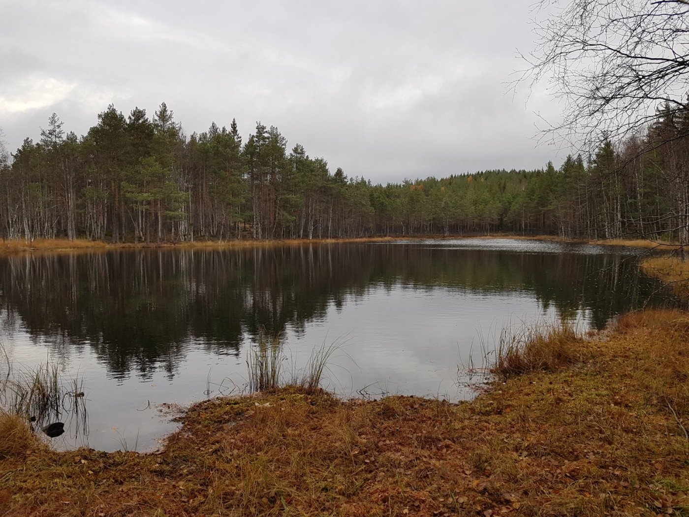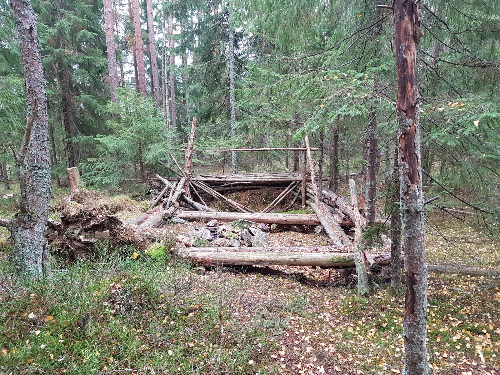 Dagens tur var i Lillomarka i Oslo, gikk fra Solemskogen. Dagen hadde startet med lettskyet og sol, nå var det blitt mer skyer, likevel mildt, tydelig lukt av høstskog, måtte ha noen herlige magadrag. Ur på østsiden av Store Gryta: Fulgte vestsiden av Store Gryta et stykke, før jeg tok oppover mot Grytlihøgda, så i sør-sørvestlig retning langs høyden til Lille Gryta. Stien i høyden her er ikke mye brukt. Er noen år siden jeg gikk her sist, hadde glemt hvor fint det er. Så endel mulige teltplasser med noe utsikt, kjekt med slikt ikke langt fra bilvei og kollektivtransport. Kom over dette byggverket ikke langt fra Lille Gryta, en slags gapahuk med bålplass. Det er sikkert fint å få utløp for byggetrang, men en tarp eller et telt er da mye mer praktisk, penere er det også med sporløs ferdsel Lille Gryta: Etter Lille Gryta opp mot Kampen, deretter ned til Kjelsås langs småstier.