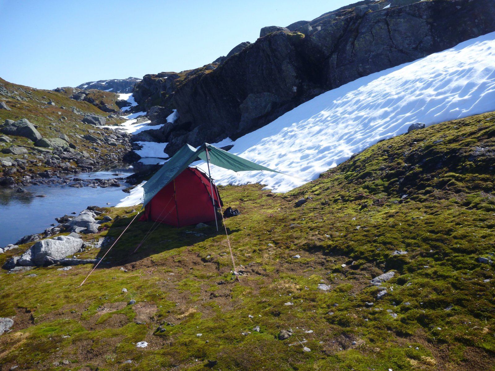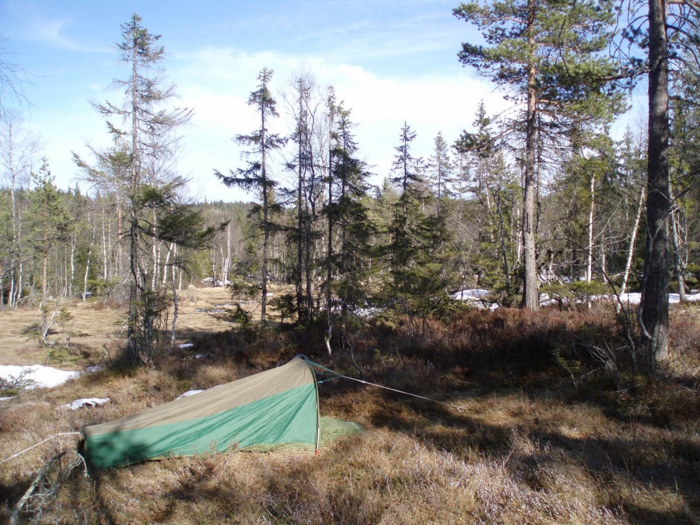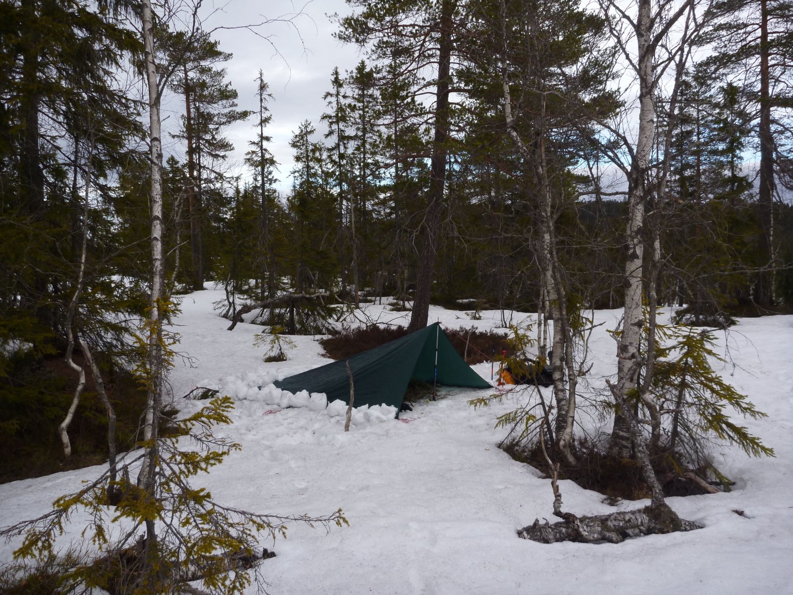 Jeg var på tur i Maridalen sist helg, hadde leir på ca 250 moh, og det var så mye og så råtten snø der at det var bra å ha truger. Heggelivann ligger på rundt 500 moh, så jeg tipper det er mer snø der. På bildet nedenfor har jeg festet bardunen i en vandrestav, du kan få til det samme med å surre en bardun rundt en stokk på 1.5-2 m. Tarpen min er på 2.9x3.5 m, og det var nok plass til å sitte under den slik jeg hadde satt den opp. (Bildet er tatt for et par år siden, da det var mindre snø i marka ) Det er smart med presenning, da trenger du ikke ødelegge trær for å få granbar til underlag. (Ja, jeg har lært...) -