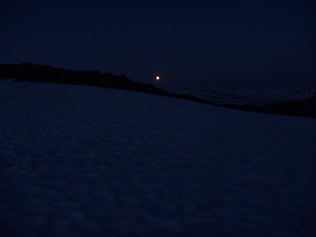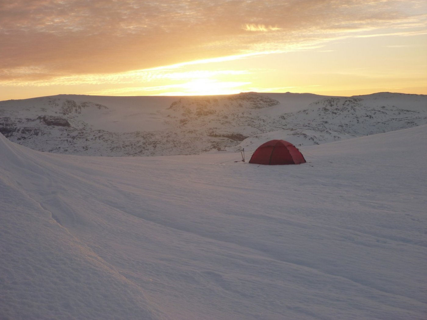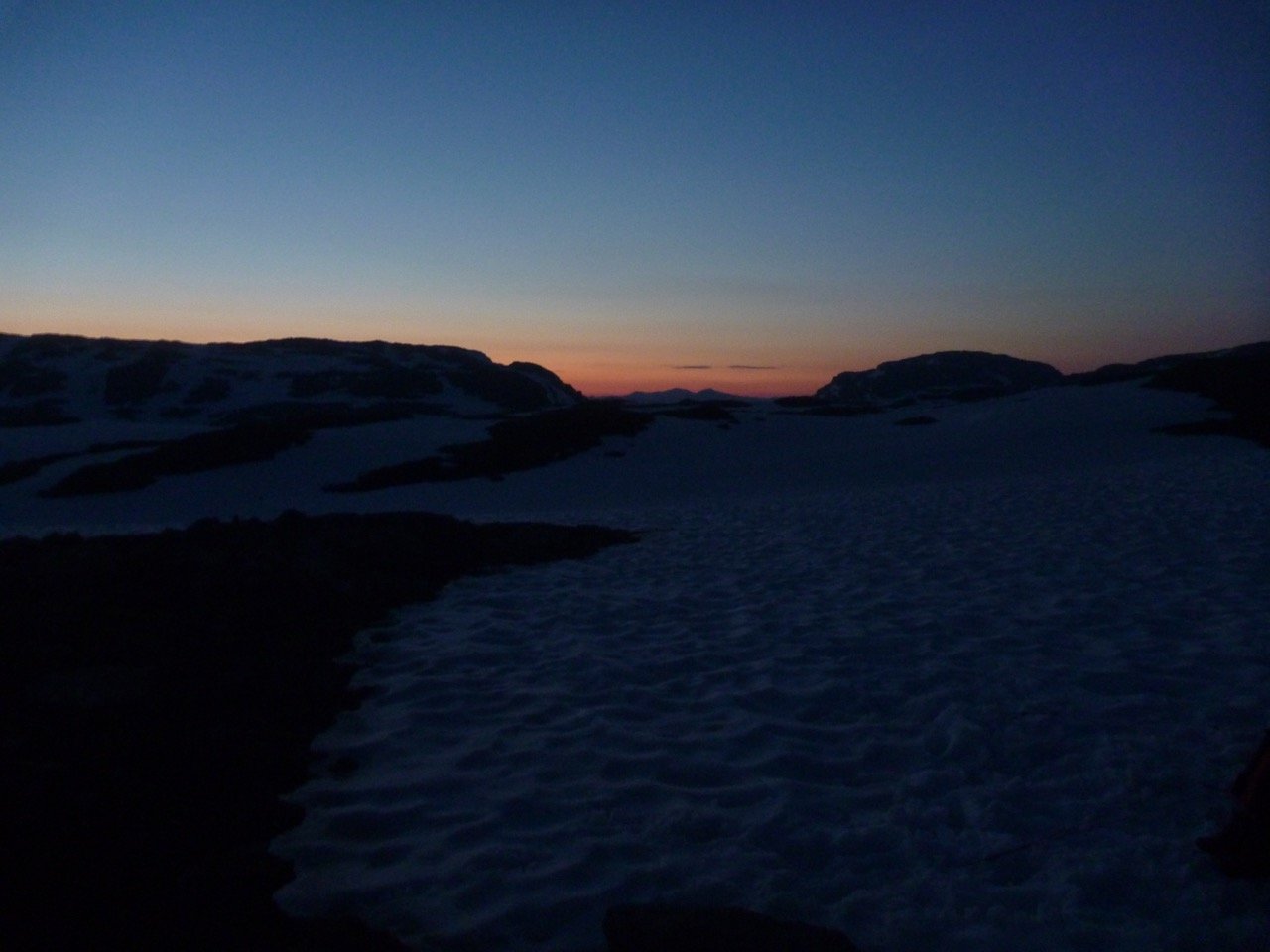 Lå to netter i telt noen få kilometer nordøst for Finse i helgen, på litt over 1500 moh, med utsikt mot Hardangerjøkulen. Knall vær, råtten og løs snø utpå ettermiddagene. Teltleir på høyden i bakgrunnen: Kveldsutsikt mot Hardangerjøkulen: Natt: Fjell og snø: Rødsildre og lav, og issoleie: