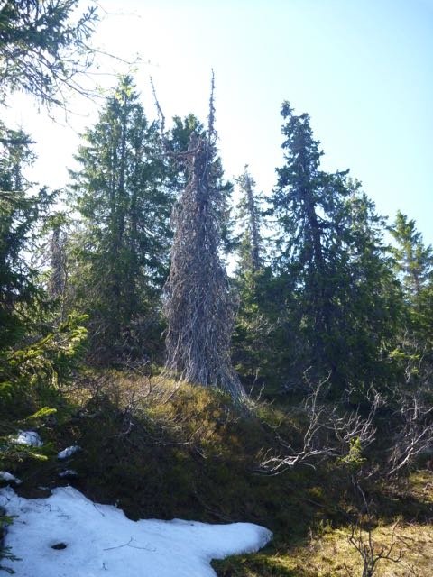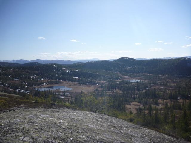 Jeg hadde en fin tur i Trillemarka i pinsen, tilsammen 5 dager på tur, satser på at noen kan ha glede av en rapport. I juli i fjor hadde jeg min første tur i Trillemarka, som ga mersmak, på tross av så mye knott at den tiden jeg ikke var ute og gikk, måtte jeg holde meg i teltet. Det som gjorde at jeg måtte tilbake, var all den uberørte og naturlige skogen, trær i alle stadier, vill skog. Så jeg planla en ny tur, på våren, forhåpentlig før det ville være særlig med knott og mygg. Valget falt på den utvidede 17.mai- og pinsehelga, og jeg traff skikkelig godt: det var knapt insekter, og været kunne ikke vært bedre. Det meste av snøen hadde smeltet, ikke at snø er noe spesielt problem, og trærne hadde begynt å få knopper. Jeg dro på onsdagen. Etter en togtur fra Oslo S og to busser hoppet jeg av bussen i Nedre Eggedal ved Båsheim skole, og etter 250 greie høydemetre på skogsbilvei fra Båsum, dreide jeg av stien og var i villmarka. Returen var på mandagen, siste leir var ved Bråtatjenn, vest for Nedalen, derfra var det rundt en halvtime å gå i terrenget, så en drøy mil transportetappe på grusvei ned Nedalen og langs Nedalselva, til Coop i Nedre Eggedal. Grovt sett var ruta: Båsheim skole - Båsumsetra - Skjærsnatten - nord for Tuftnevann - nordvika i Myklevann - Tjenndalstønn - Bråtatjenn - Nedre Eggedal. Rett etter avstigning på Båsheim skole: utsikt mot Andersnatten: Hadde leirplass her, utsikt ned til Soneren. Ca. 1 km øst for Båsumsetra: Mellom Båsumsetra og Skjærsnatten: Utsikt vestover fra Skjærsnatten: Gaustatoppen i horisonten, sett fra Skjærsnatten: Mellom Tuftnevatn og Myklevatn: Mellom Tuftnevatn og Bråtatjenn: Har begynt å steke pannebrød på tur, og dette var første lengre tur med ferskt brød hver dag. Begynner å få taket på det nå :-) Fra siste leirplass ved sørvest-enden av Bråtatjenn.