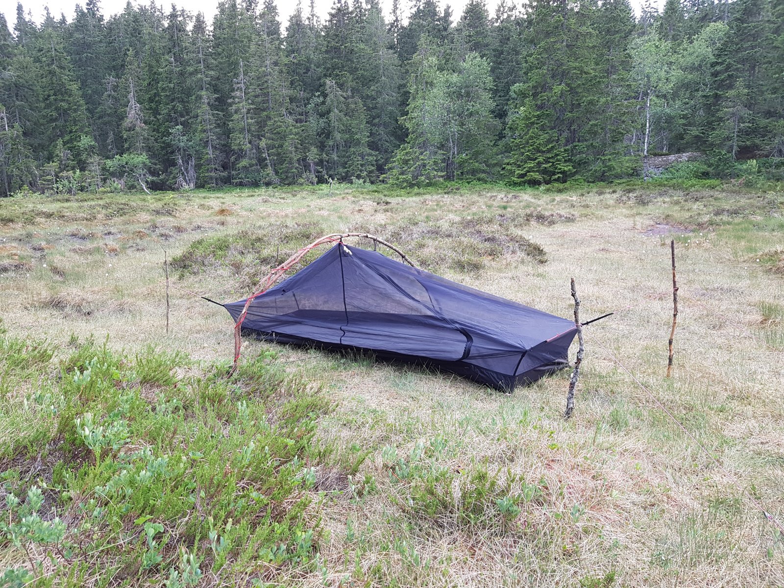 Det er en lett og luftig løsning, men uten spilene i hjørnene på den vanlige teltduken, må du gjøre noe for å trekke hjørnene på innerteltet opp. Jeg pleier å surre bardunene rundt noen pinner, det fungerer greit i skogen. Det går an å klare seg uten medbragt teltstang: sist helg klarte jeg glemme stang hjemme, men improviserte med et par lange grener istedenfor Jeg har faktisk to Akto-stenger, og jeg trenger jo ikke mer enn en om gangen. Du kan få låne av meg om Akto-mesh-løsningen er aktuell.