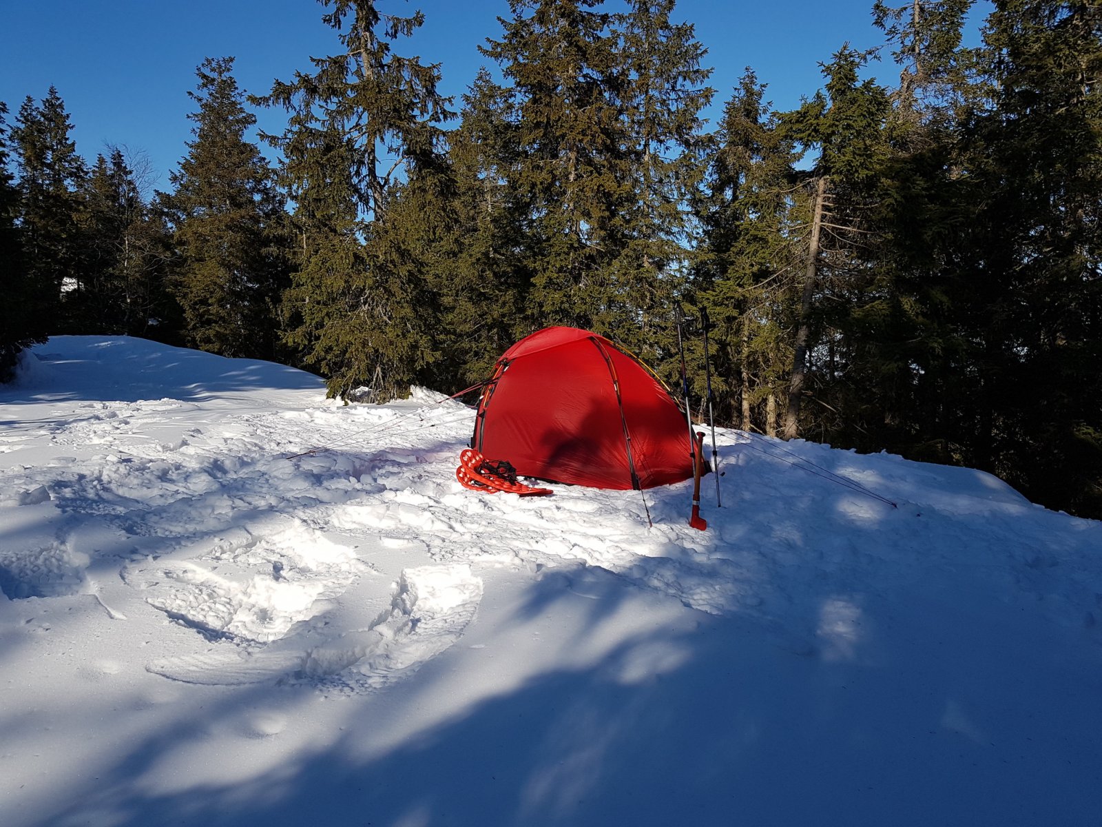 Måtte bare ha meg en natt ute, nå som det er så fint vær, og tok turen til Maridalsalpene. I går gikk jeg fra Vaggestein opp til Gaupekollen, mesteparten til fots på sti med hard snø. Satte opp teltet noen få meter fra selve toppen uten utsikt. Etterhvert kom stjernene fram, så tre-fire stjerneskudd. Lå med åpent telt gjennom natta, det var meldt 6-7 minus, vet ikke om det ble så kaldt, sov uansett varmt og godt, og brukte en 20 år gammel sommerpose som dyne over tresesongsposen. I dag fortsatte jeg på truger bratt ned Gaupekollen og så bratt opp til Mellkomkollen, derfra på sti ned til Skar. Jeg er ikke så opptatt av å ta bilder underveis, spesielt ikke i kjente trakter, men her er ihvertfall et stemningsbilde fra leiren.