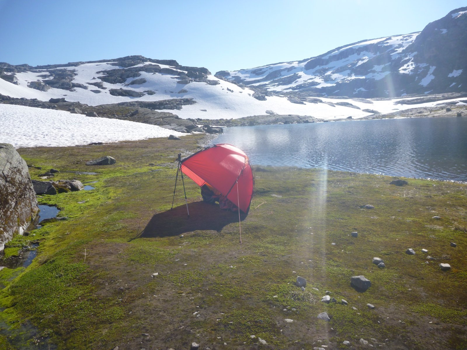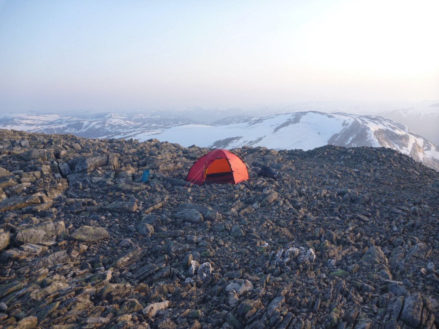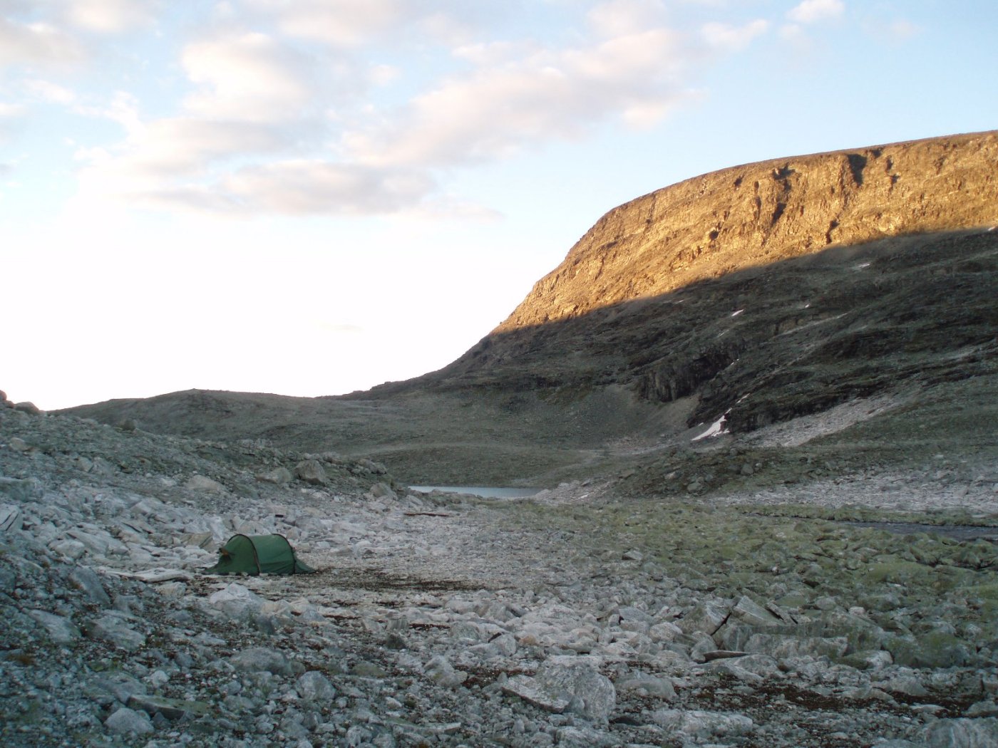 Jeg har vært på 3-4 teltturer i Reinheimen, det er noen år siden, så jeg husker ikke alle detaljer om hvor mye eller lite stein det er hvor. Om jeg var deg, tror jeg at jeg ville gått gjennom Skarvedalen og så mot Dørtjønn og langs Spongi mot Torsbu. Teltet en gang litt nord for vann 1442 helt øst i Skarvedalen, det var en god teltplass der, mener det var på gress. Regner med at du finner brukbare teltplasser på strekningen Skarvedalen-Dørtjønn-Spongi-Torsbu, men jeg ville tatt med ekstra og gode teltplugger, Y-plugger, og ekstra tau/barduner sånn at du har flere festemuligheter. Den ene gangen jeg brukte en del tid før jeg fant teltplass var på bildet nedenfor, mellom Benkehøa og Trollkyrkja. Slet med å få festet teltpluggene, men da hadde jeg telt med stormmatter, som jeg la stein på, det hjalp. (Dagen etter fant jeg en bedre teltplass noen hundre meter unna..) Ellers tror jeg @Anders Eriksen er lokalkjent i området. Han har noen fine turrapporter fra Reinheimen.