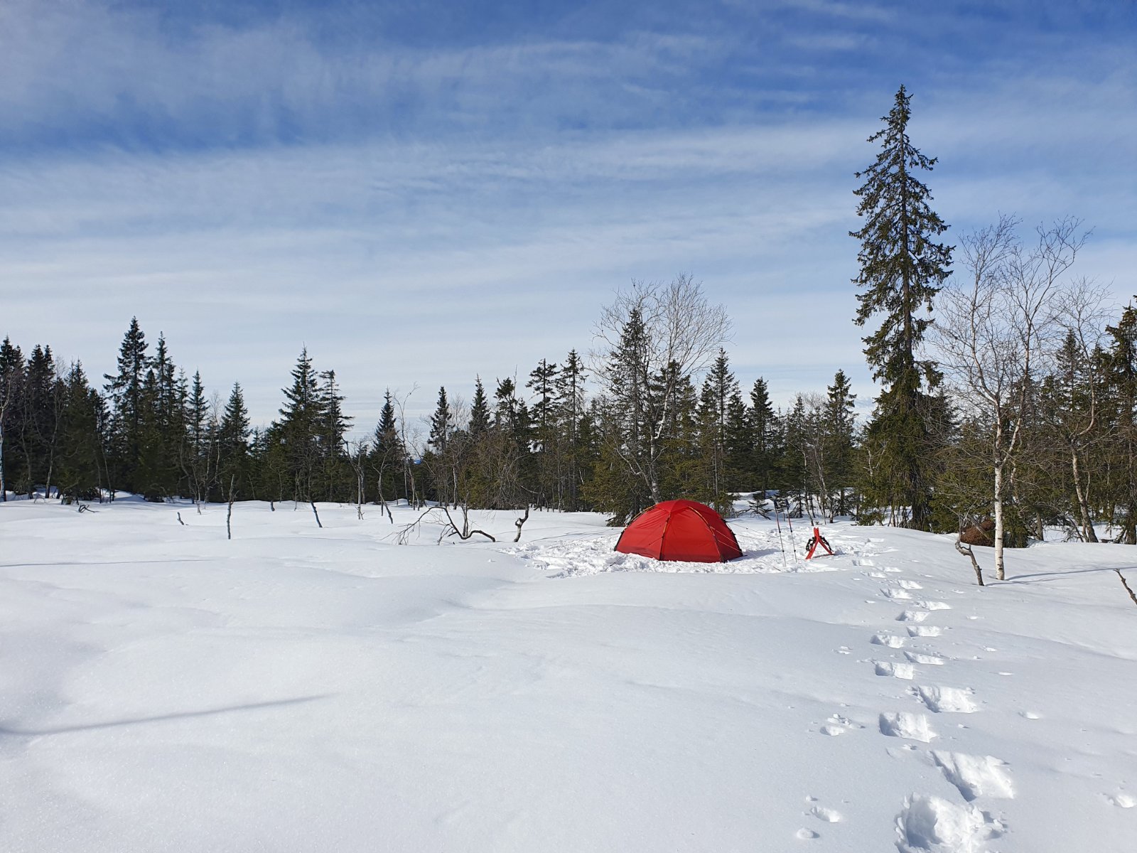 Et døgn på tur innover fra Maridalen. Hørte en svarttrost i det fjerne da jeg parkerte sykkelen ved Vaggestein utpå lørdagsettermiddagen. Isete på stien i Vaggesteinskleivene, ellers fint føre på stien. Siste del av turen gikk på truger, til stedet jeg hadde sett meg ut på kartet. Viste seg å være en veldig fin teltplass, ihvertfall på vinteren. Stjerneklart og halvmåne i går kveld og natt.