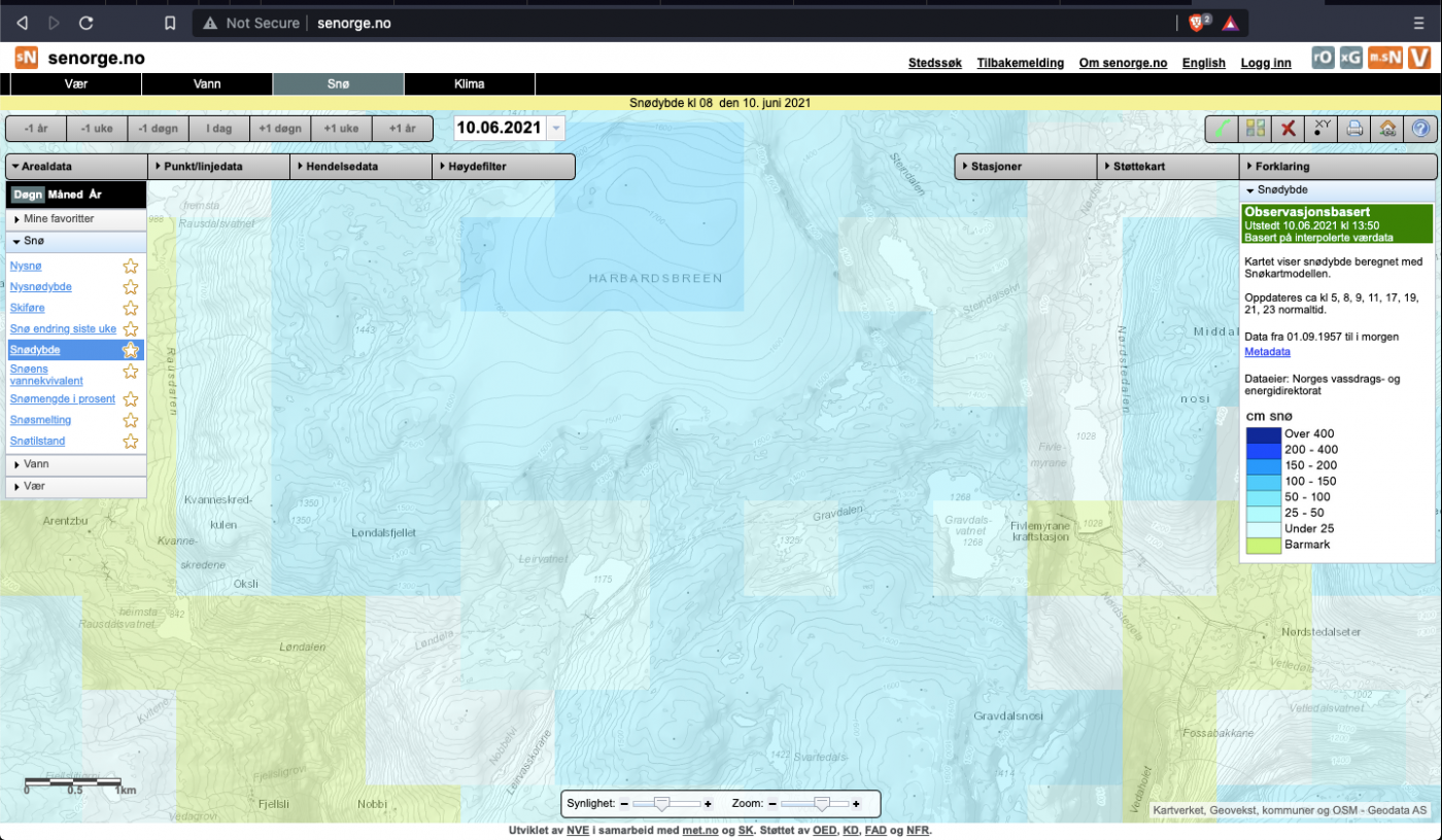 Er det mye snø, så betyr det at det blir tyngre å gå. Om det er mye snø og varmt, så blir det stor snøsmelting, og sannsynlighet for store bekker. Er det bratt og mye snø, så kan det være vanskelig å få godt fotfeste om stien er dekket av snø. På ruta du tenker gå, så er de bratteste partiene opp mot Oksli og ned mot Fivlemyrene, men der ser det ikke ut til å være særlig med snø i følge senorge.no. Det er et kort, bratt parti rett øst for Leirvannet, der ser det ut som det ligger en del snø fortsatt, og det er også nordvestvendt, så snøen ligger kanskje en god stund til. Du kan jo sjekke med Nørdstedalsseter når det nærmer seg tur. Pluss sjekke oppdatert føremelding på dnt.no. Den ferskeste meldingen for Breheimen sier: "09.06: I Breheimen er det fortsatt mye snø i høyden. Det er bart og fint nede ved Sota Sæter og fint å gå turer i området her. Grønt og sommerlig. Men straks en kommer opp i høyden er det snøføre. Vi er nå i en mellomsesong fra vinter til vår i fjellet og forholdene endrer seg for hver dag. Sjekk senorge.no om du planlegger tur." Det står ikke noe i meldingen om bruer er lagt ut. Det er også noe å sjekke.- 9 svar