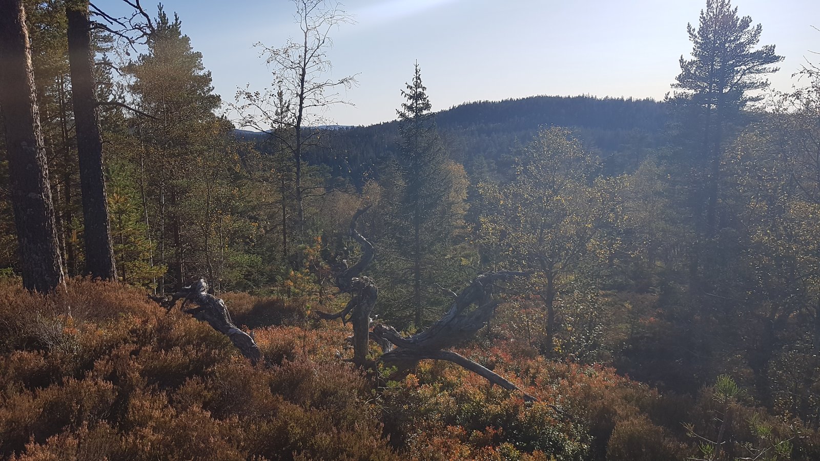 18. Tok toget til Hakadal tidlig i går ettermiddag. Etter en transportetappe på grusvei og forbi hogstfelter, begynte fin og ganske uberørt skog i nærheten av Store Hyttetjern, tok en liten rast der. Etter det gikk jeg vekk fra stien for å gå i terrenget til dagens mål: Glotjernskollen. Til tider veldig fint i området, som her ved Blekketjern: Mot Glotjernskollen: Det er en del trær på Glotjernskollen, men jeg fant en passe åpen og vestvendt plass litt før toppen. Kom dit rundt seks og satte opp tarpen, som jeg ikke hadde planer om å bruke, for det var meldt finvær fram til søndag, men man skal jo være forberedt på uvær selv på korte turer.... Solnedgang fra Glotjernskollen, slapp tarp og føtter: Himmelen holdt seg skyfri på kvelden, gjennom natta og videre i dag, og stjernehimmelen var flott. På vei hjem fant jeg nok traktkantarell til en middag. Et døgn under åpen himmel, det ble utenatt nummer femti hittil i år, en av årets beste,.