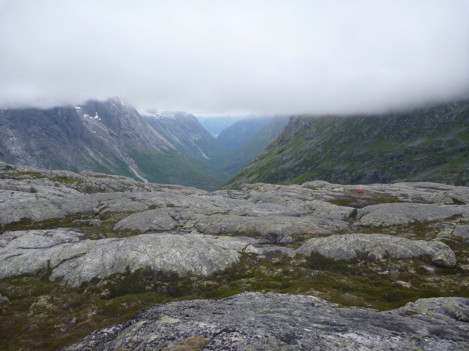 21. Jeg gikk over Kamperhamrene i midten av juli, fra Stryn mot Sjåk. Merradalsbotn var tunggått og med mye stein. Det var teltplassmuligheter flere steder ved Kamperhamrene, bl.a ved nordenden av vann 1173, eller som teltplassen jeg hadde litt nedenfor vann 1158 (det ser tørt ut, men elva gikk like ved):