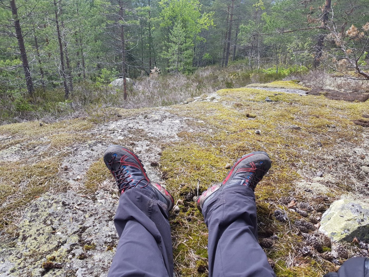 Fortsatt positivt overrasket over mine Millet sko. Her har de en velfortjent pause etter 3,5 timers marsj. Har ikke hatt behov for å skifte sokker. Luftet bare en gang underveis. 600 høydemeter. Paret veier 1160 gram.