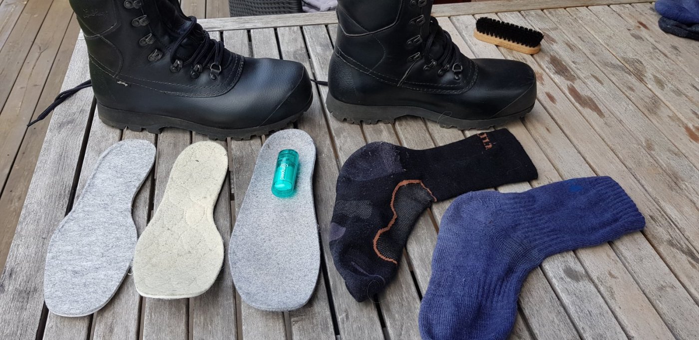Da har jeg gjennomført en vellykket tur/test. Oppskriften/løsningen for å unngå gangsår oppe på stortåa: Se bilde og forklaring: 1. La inn en filtsåle i bunn ( den til venstre). Denne var en størrelse mindre enn skoa 2. La så inn en såle ( tynn og som har alu på undersiden) . Denne var en størrelse mindre enn skoa 3. Orginal såle tilslutt 4. Prøvde compeed gnagsår stift for første gang. Usikker på om det ga noe. 5. Litt tykkere liner sokk.. Brukte de sorte i fra Härkila 6. Yttersokk er HH warm Skoa er Lundhags Proffesional -mid. En rå sko når man ferdes ( i alle fall ) utenfor stier.