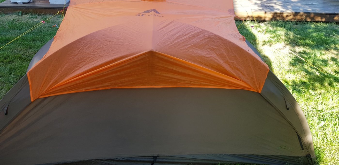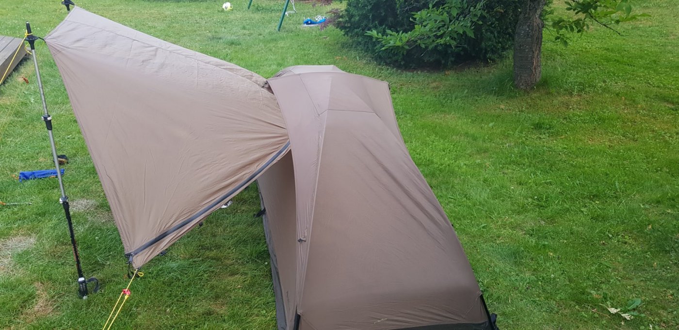 Har samme tanke som deg @a_aa Jeg tror det vil renne ut på siden ( Inn kommer det ikke uansett. Bak den lyse myggnettingen er det en tett flik med glidelås for å justere lufting). Må prøves når det kommer regn. Evt så kan man feste det på andre siden . ( da blir tarpen litt kortere , men man kan da åpne inngangen.) Teltet er symetrisk og kommer med to slike sideduker. Meget enket og raskt å sette opp. Selvståene. Tar max 2 min å sette opp selve teltet!