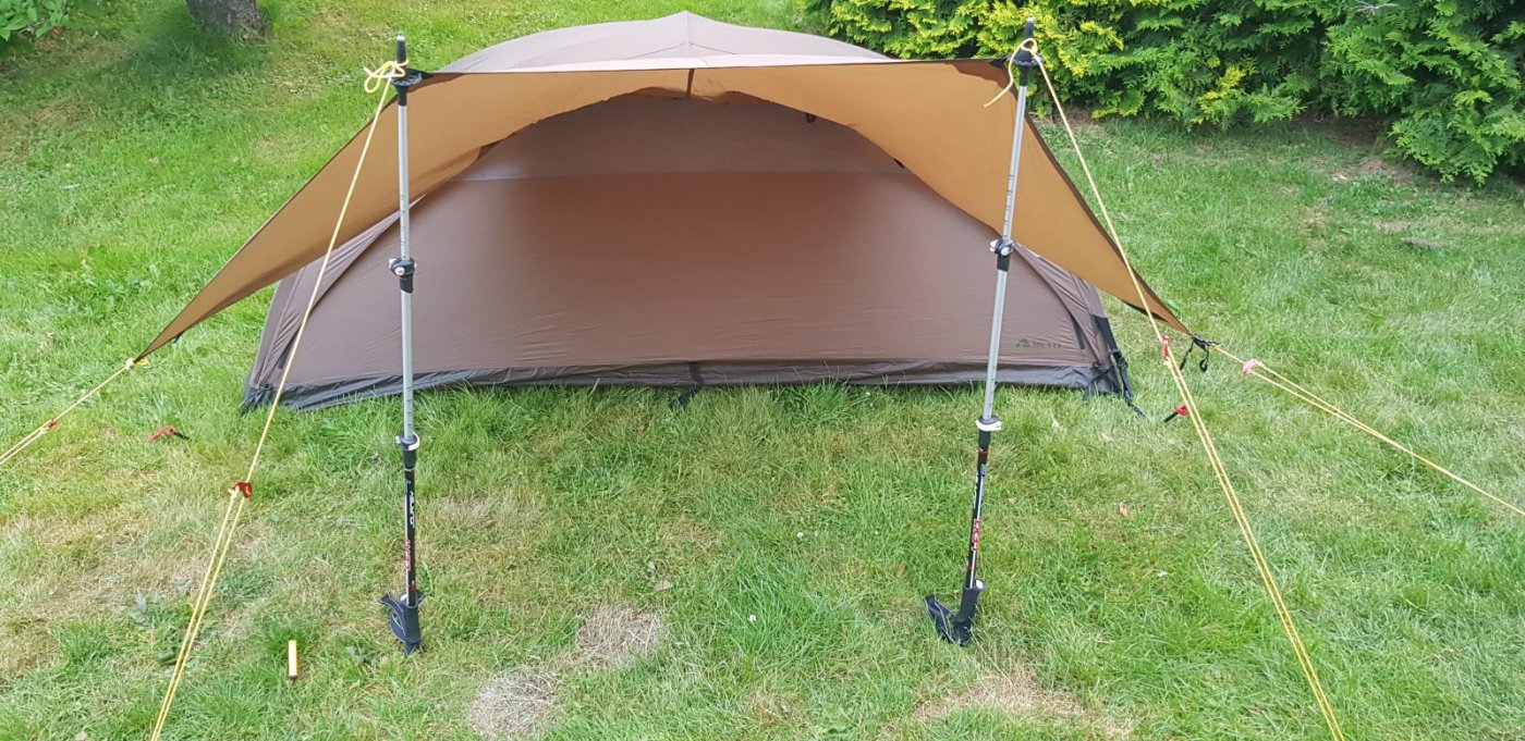 YES !!! Ettersom teltet er litt i det laveste laget for å sitte oppreist, har jeg prøvd ut en løsning som er levelig under dårlig vær. Se bilder. Setter gåstaven ( eller alternativ på 120 cm) og fester noen barduner i hempene på sideduken. Sideduken er bare festet med de 3 øverste hempene. Bardunerer også nederste hempe i duken
