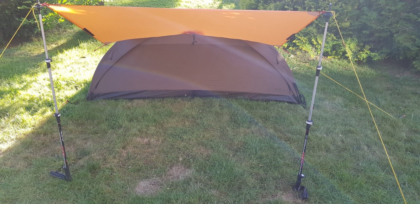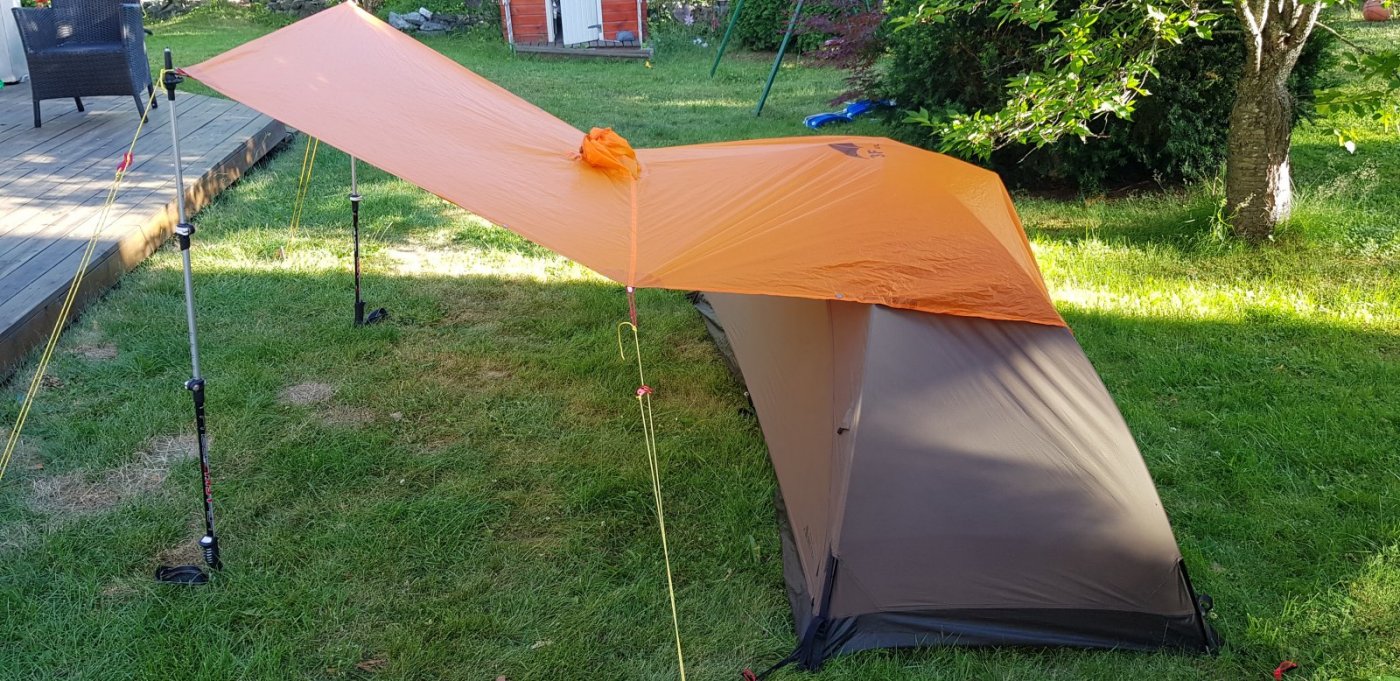 ..Og så en forbedret versjon Har jo en Poncho fra 3F UL Gear som veier 205g. Den har på den ene siden noen fine fester som passer utmerket til festene for sideduken. Så da er det bare å feste ponchoen i de på baksiden og trekke den over teltet. Så er det bare å feste i front med gåstavene/el. lignende. Denne ponchoen har ringer man kan sette spissen på staven i. For sikring kan man feste også barduner på siden....