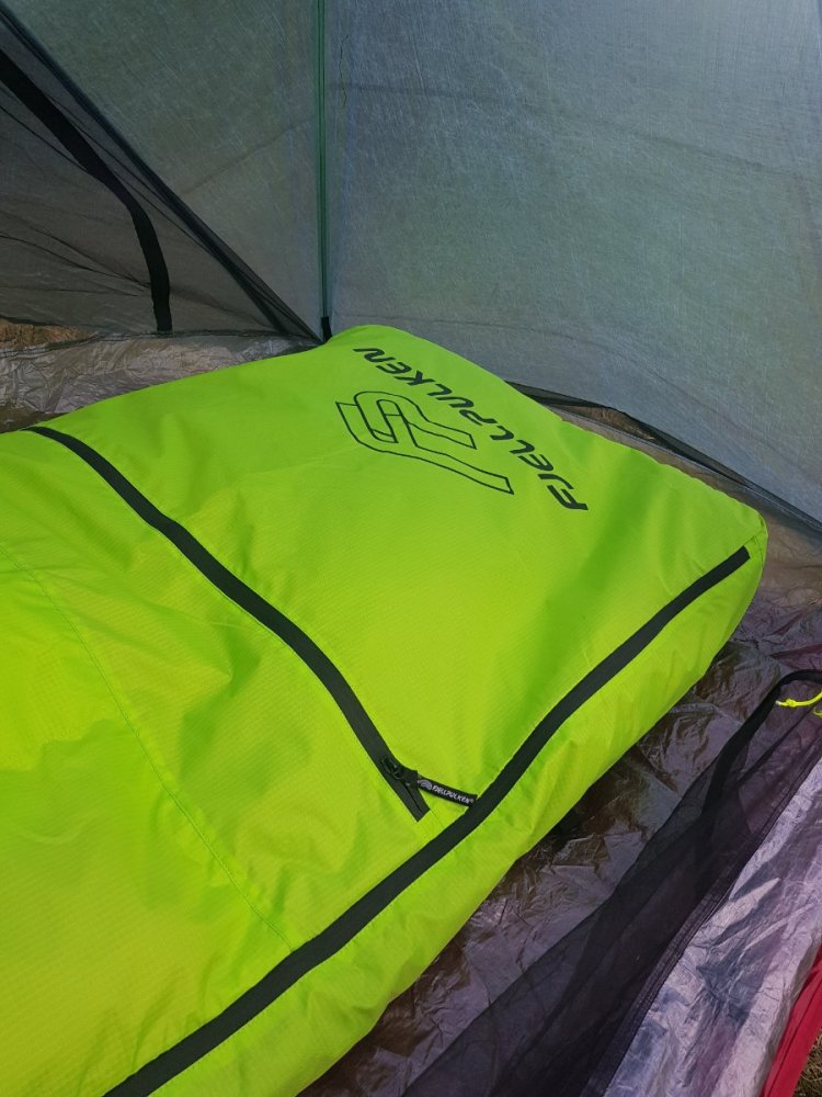 Okey, bilder tatt. Vil si at dette ikke er et telt å bruke dersom man forventer snødriv.. Det vil komme inn i teltet. Regn kommer ikke inn, ettersom "bathtube floor" er rimelig høyt. Bunnduken er en MSR regular 2. Liker lommen plassert på midten. Den er fin å benytte for inn og ut av teltet. (eventuell) kondens som dannes på teltduken og og renner ned, vil ikke komme innenfor "bathtube floor"