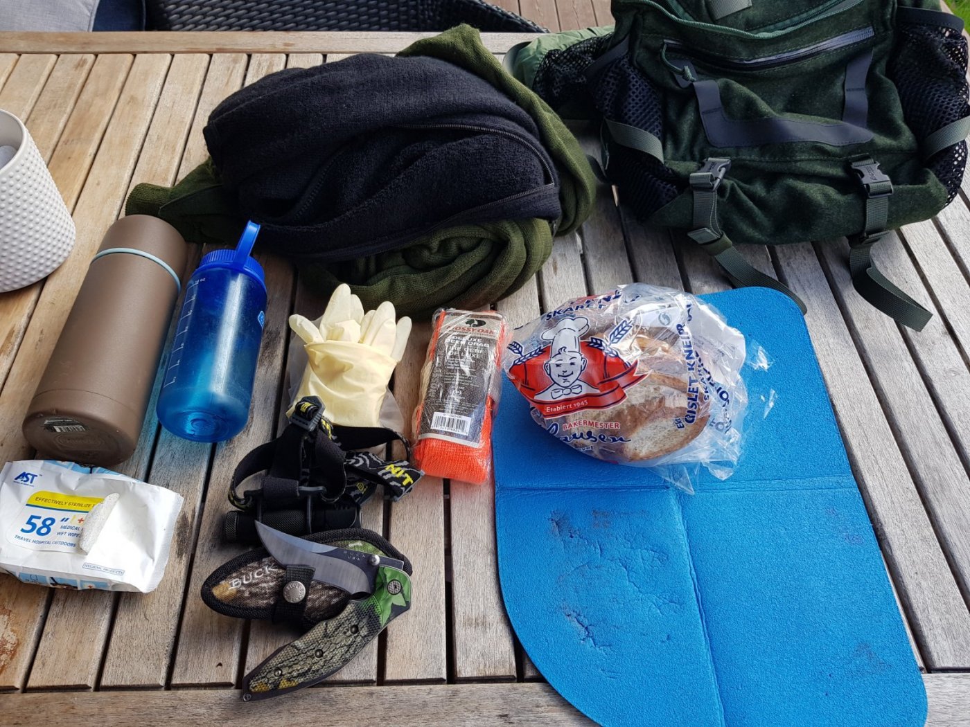 okey, er dette pakklisten i sekken? tau, ekstra kniv, hodelykt, engangshansker, våtservietter/papir osv, samt nistepakke og eit klesskift ( = ullfrotte genser ?). +Thermos ( 0,35L ? ) +Drikkeflaske(0,5 L?) -