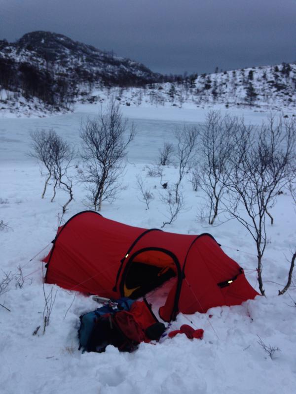 Jeg og en kompis hadde ordnet oss kone- og barnefri fra i går ettermiddag til i dag kl 12, og dennne anledningen måtte jo selvfølgelig utnyttes! Siden vi hadde relativt dårlig tid (fikk slengt oss i bilen kl 15 i går ettermiddag (etter at vi hadde ordnet morsdagsblomster til i dag!)), gikk turen mot Bynuten i Sandnes. Vi stoppet ved vannet et stykke nedenfor toppen; og slo opp teltet når det begynte å mørkne. Litt dårlig planlegging fra min side sørget for at vi ikke hadde med snøplugger, så vi benyttet greiner for å forankre bardunene i snøen. Bardunene ble festet rundt greinene (ca. 30 cm lange) som vi la horisontalt ned i snøen, og pakket godt med snø oppå. Resultatet i seg selv ble perfekt; det er lenge siden et telt har stått så godt i sterk kuling! (Nærmeste målestasjon rapportere 21 sekundmeter i natt). Når teltet var oppe satt vi opp Tarp vertikalt festet i bakken og øverst i noen trær, slik at denne dannet en 1.5m høy levegg mot kulingen. Vi fikk fyr på bålet (10 medbragte bjørkekubber gjorde susen!), og deretter var det frem med Real-turmat, 4 IPA, Jäger&Redbull og et halvt kilo smågodt.... Ugh! Det ble dog en tidlig kveld da snøfokken tok til sammen med vinden, og vi var i posene før klokken 21.... Sov godt gjorde vi også; stod opp først klokken 10:30. Superb! Turens eneste store utfordring ble så presentert i forbindelse med at vi skulle ta ned teltet; snøen vi tettpakket rundt bardun-pinnene hadde blitt hard som sement da temperaturen hadde falt godt under frysepunktet i løpet av natten... Så teltpakkingen som vanligvis tar 5-10 minutter tok det tidobbelte(!); men etter en times hardt arbeid hadde vi fått gravd ut alle sammen og var good to go!. 8/10 - would do again!