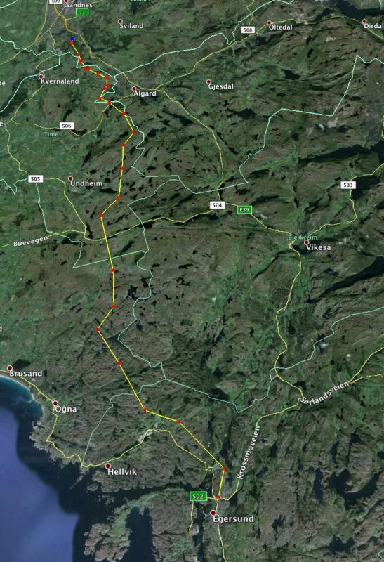 Hei! I påska har jeg både jobb- og familiefri (Tjohei!), og tenkte meg på en 3-4 dagers tur med telt og lett oppakning. Jeg dropper skiene denne gangen og tenkte å ta beina fatt, noe som gjør at jeg må holde meg i lavlandet.... Bor i Sandnes, og tenkte kanskje å ta toget til Egersund, for å deretter gå tilbake.... Har gått i dette terrenget før vinterstid og syntes det var helt supert, så en litt lengre tur lokker. I noenlunde luftlinje (se vedlagte kart) er distansen ca 45 KM. Regner med å bruke ca 3 dager på turen, med 2 teltovernattinger... Men så var det rutevalget da... Har sett litt på Nordsjøruta, men skjønner det slik at denne stort sett går langs kysten, og på grusvei/asfalt.. Ikke helt min greie.... Foretrekker vanlig "DNT-merket" skogsløype om jeg finner det..... Så... Har noen anbefalinger å komme med? Finnes det et slags sti-nett som strekker seg Eigersund-Sandnes? Takker å forhånd for alle innspill! TH