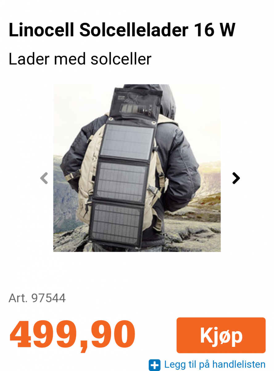 https://www.kjell.com/no/produkter/elektro-og-verktoy/stromforsyning/solceller/linocell-solcellelader-16-w-p97544?gclsrc=aw.ds&&gclid=Cj0KCQjw7sDlBRC9ARIsAD-pDFr-sdD5F8_zJ9bkaFKqdbP5adYAdCoatbL6pU1q0RbjE1rMD6CiaqYaAhpUEALw_wcB Solcellelader med to USB-porter for lading av mobil, nettbrett og andre USB-enheter. Laderen kan foldes sammen og festes på f.eks. ryggsekk, telt eller sykkel. Mobil eller powerbank kan legges i en lomme ved lading. USB-portene gir totalt ut 2,6 A. IP53-klassifisert. Mål sammenfoldet: 255x195x20 mm. Mål foldet ut: 255x815x15 mm. Vikt: 800 g.