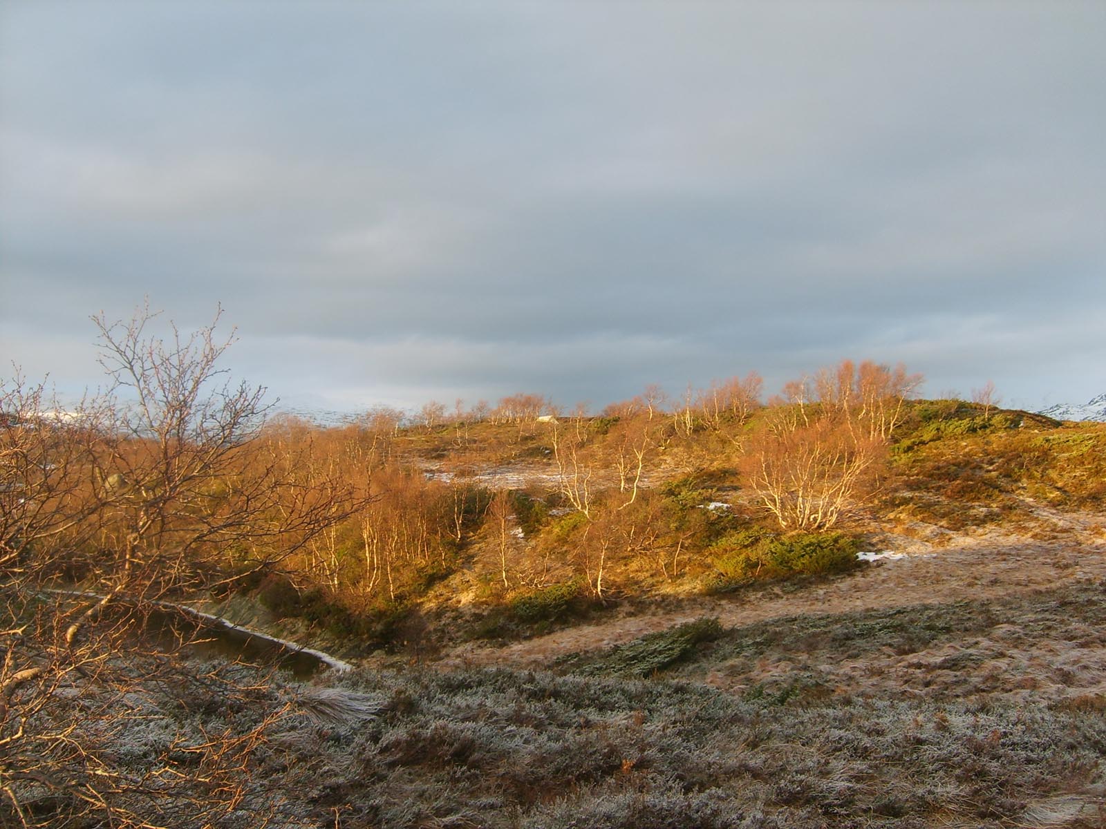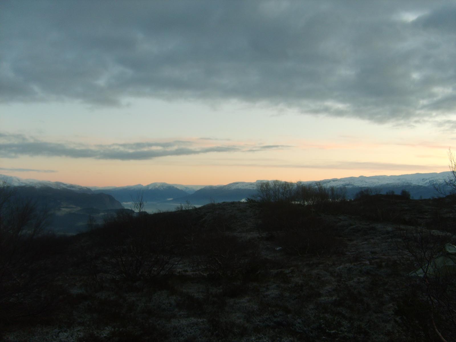 12. Torsdag 28. des til fredag 29. des var jeg på min andre overnattings tur -alene. Jeg befant meg på Krokavatn. Ble kjørt et langt stykke opp, ble ikke langt å gå(rundt 1 time gåing). Det var tykk tåke da jeg satt i bilen og da jeg begynte å gå, men da jeg kom opp på et lite utsiktspunkt var plutselig all tåka under meg. Sola lyste rødt på fjellene i den hvite snøen. Noe som ga et fantastisk lys. Hele dalen under meg var tykk i tåke mens der jeg var, var det skyfritt. Jeg gikk videre for å finne en leirplass. Mørket senket seg og gradene krøp seg nedover på gradestokken. Månen hjelpte med lys, og telt-duken var hvit av frost. Isen på vannet begynte å smelle å bråke. Det gjorde den hele natten. Det eneste av dyr jeg såg var en rype som flakset i mørket. Snø var det ikke, men kaldt. Tipper det var runt -6 til -7 °C. Kulden plaget meg ikke da jeg sov, soveposen var varm og god. Først så sovna jeg rundt 00.30 og våkna 2.00. Deretter våkna jeg igjen kl 05.00 og sov helt til 09.00. Våkna opp med samme farge på fjellene. Veldig fint. Det var litt skyer, men det var like mye blå himmel. Isen på vannet var blitt noe tykk, så det var moro å kaste store steiner på den. Fin tur. Bilder:
