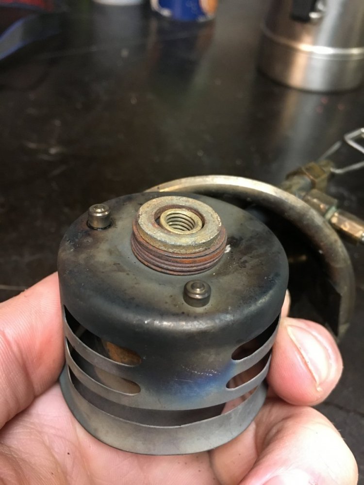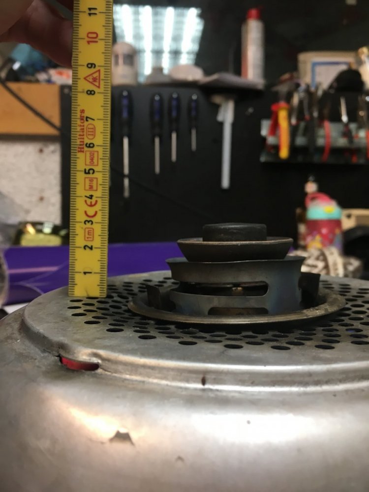 Har og brukt skiver/ chims for å få klem på skruen. Primusen bygger ca 3cm opp i traiangianen. Fra topp brenner til bunn liten kasseroll har jeg ca. 1,5 cm.. -