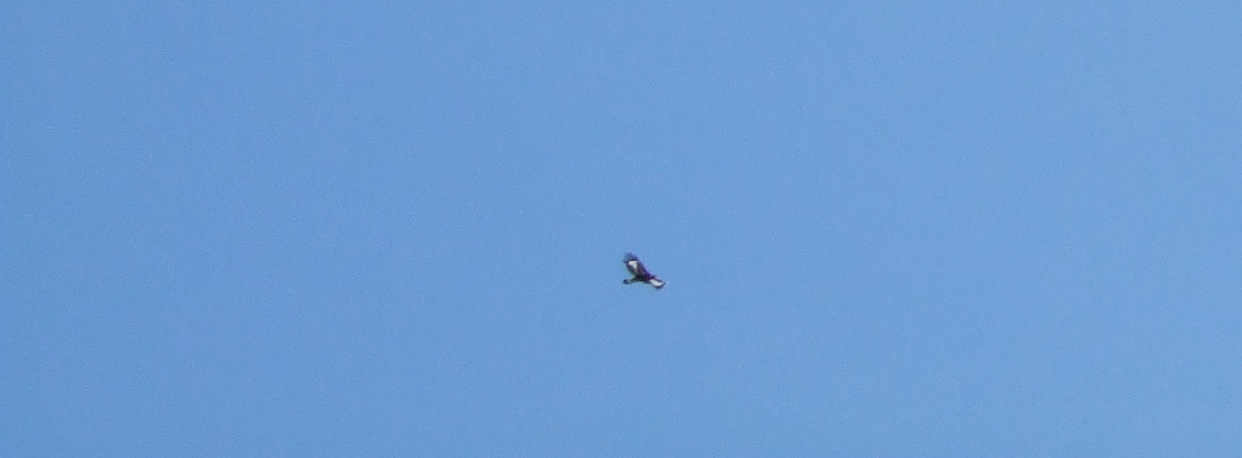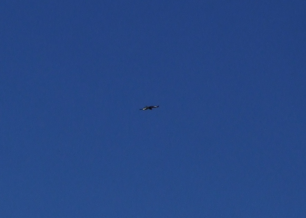 På min lille vårtur over Tverrbotntindene fredag 8.mai kom jeg over denne majestetiske luftens herre. Den hadde markerte hvite flekker på vingene og ett smalt hvitt band på stjerten. Fugleboka har ett bilde av en ung kongeørn som ligner på dette, men ikke med så hvite felter. Fuglen hadde glideflukt og den speidet fra side til side med ganske utstrakt hals. Vingespennet vil jeg anta var ca 1 meter. Beklager oppløsning, men bildet er forstørret maksimalt. Er det kongeørn ?