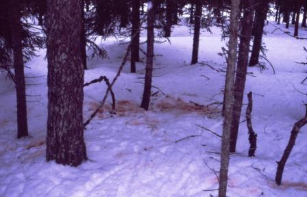 Hvilket dyr har vært her, så vidt jeg vet har vi ingen dyr i norsk fauna med tre tær som dette dyret ser ut til å ha. Bildene viser ulike sportegn der dyret har forfulgt, skadet og drept en hjort. Det er mye hjort i dette området. Gaupe holder til fast i området, og sesongen-01 var det ulv i området som tok sau, mens i -02 var det jerv som forsynte seg av sauene. Bildene er enten fra 2001 eller 2002, det var dette med husken da. Hvis jeg skulle gjette ville det blitt jerv Noen forslag der ute??