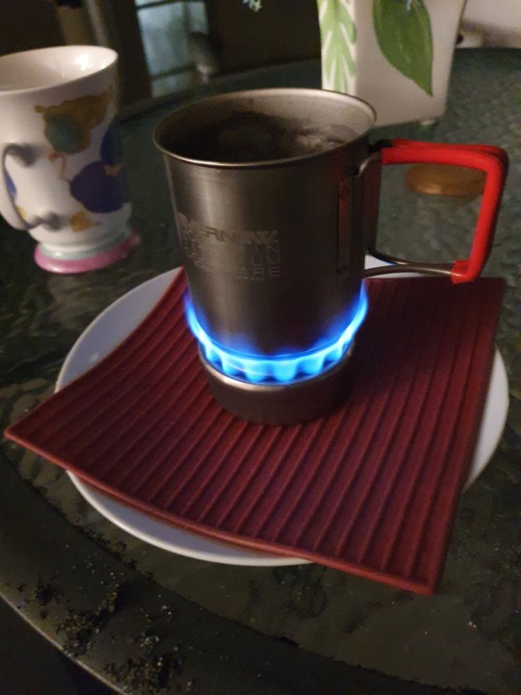 I Irland og UK har de solgt sånne i lang tid. Men da noe større. Denne kompakte modellen, er laget etter mønster av noe som ble solgt av en amerikansk produsent. Prinsippet med brennkammer i midten har også vært brukt i Midtøsten. Sannsynligvis i lenger tid enn på de britiske øyer. Hadde en sånn Mkettle greie. Den ble gitt bort til min svoger. Han bruker den av og til på nærturer med ungene. Har aldri brukt den med rødsprit. Bare med kvist. -
