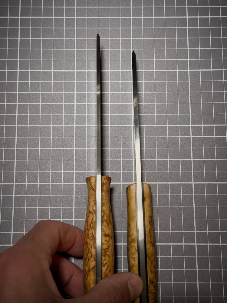 Her er noen kjappe bilder fra hjemme! Resten av knivene mine er på hytten, kommer mer! Nord vs Nordlys Utvær vs Nordlys Lars Fält vs Nordlys liker spesielt godt at bladet på Nordlys er såpass mye tynnere enn Lars Fält førsteinntrykket er jo som alltid. Wow for en kniv! Den sitter så utrolig godt i hånden og ser veldig bra ut i forhold til andre kniver jeg eier! men, hvordan den er i bruk til forskjellige oppgaver får jeg bruke helgen til å finne ut av 🔥