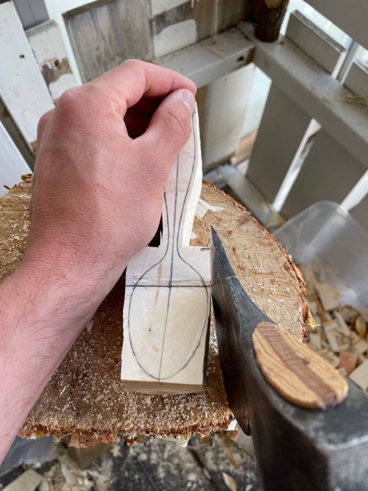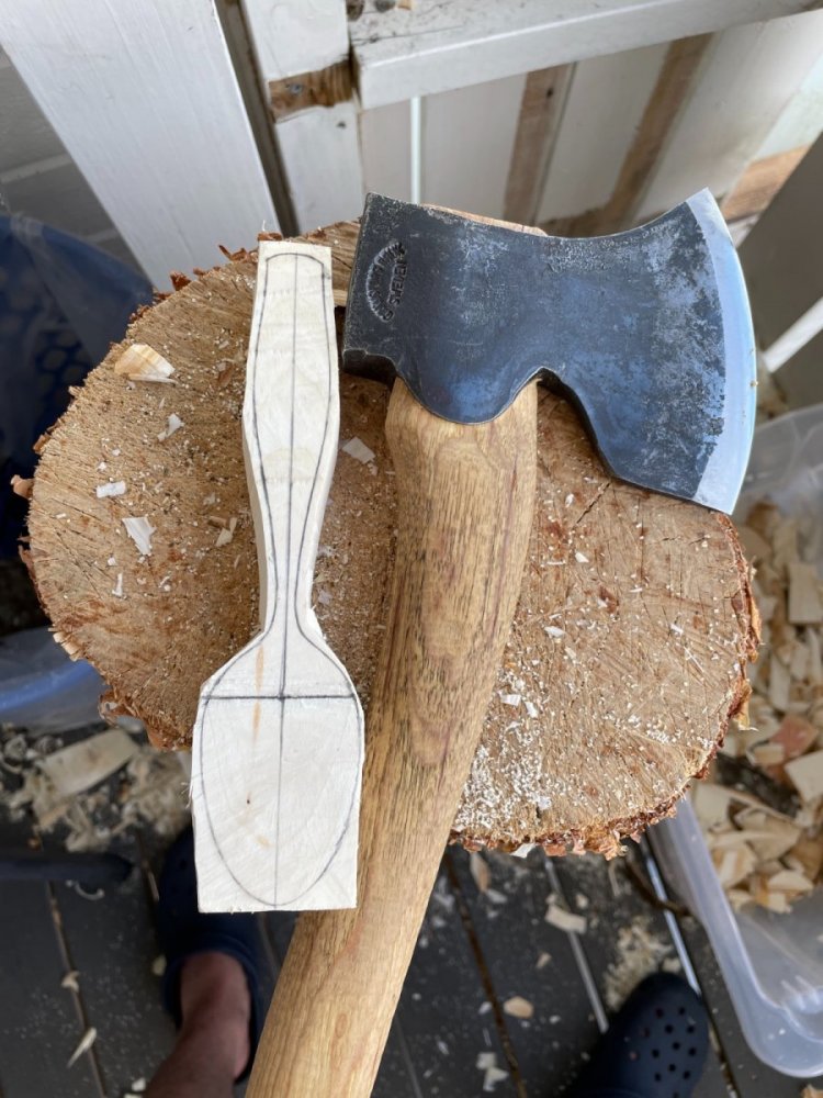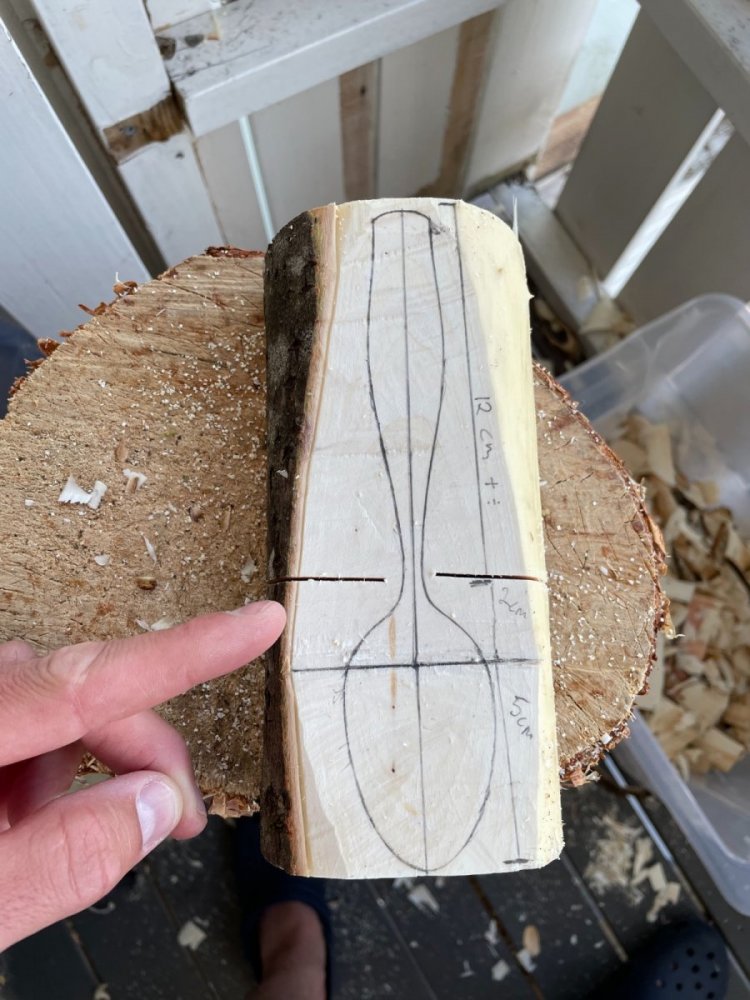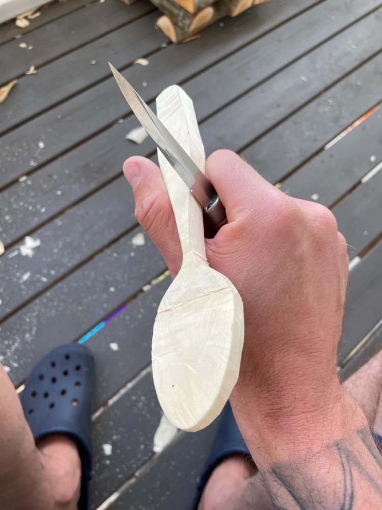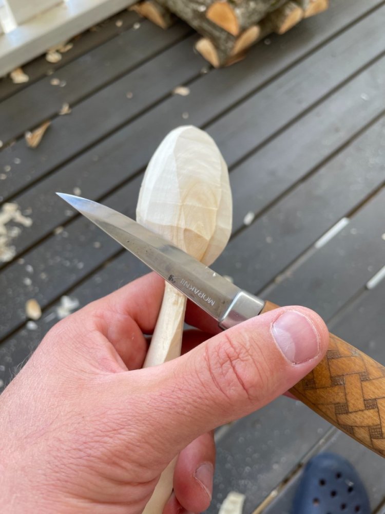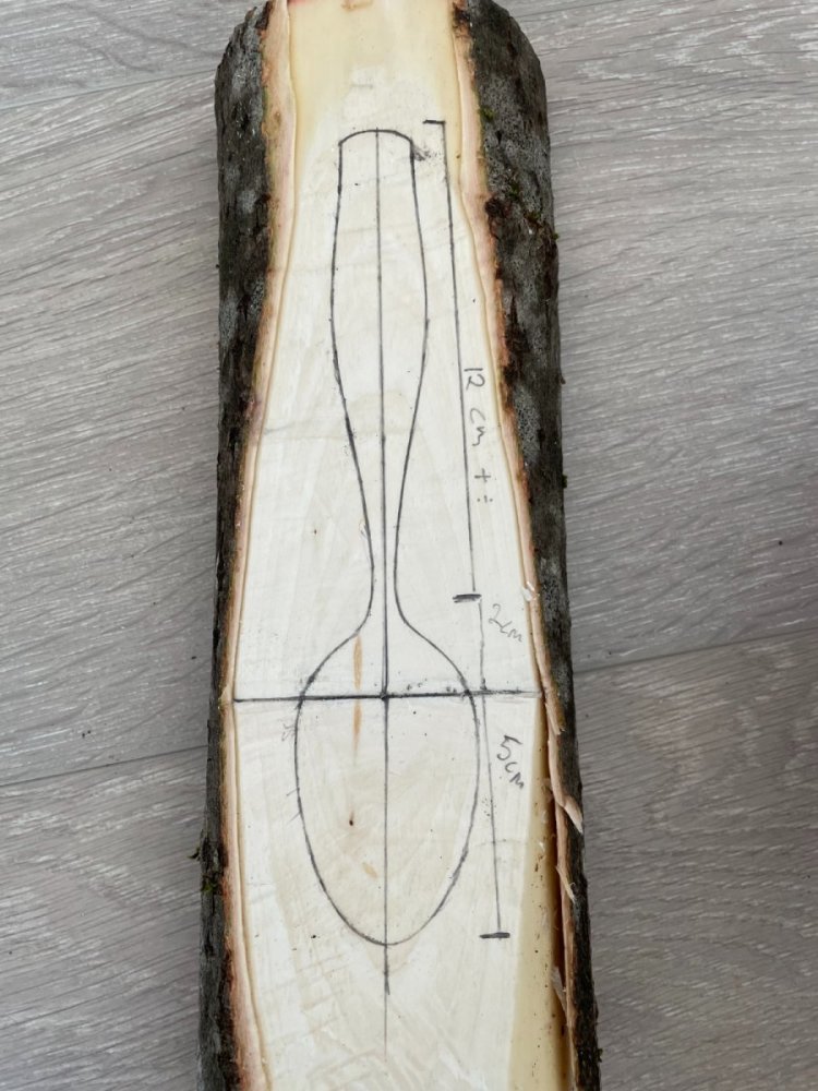 Utstyret man trenger er minimalt En sag, en god øks, en skje kniv, en sløyd kniv (mora 106), blyant, linjal og litt olje. finn deg en kubbe i skogen selv foretrekker jeg for tiden å bruke Selje sag av en passe lengde… gjerne med litt overmål i forhold til hvilken skje du ønsker å lage. En normal skje ligger på rundt 20cm. prøv å se på årringene i treet hvor det er best å kløyve stokken i to Bruke øksen til å kløyve stokken, bruk gjerne en kubbe til å slå øksen gjennom, da får du mer presist hugg. nå begynner med å lage grunnlaget for bøyen på skjea ved å hugge inn en V fra barkesiden og ned. litt mer lengde på der håndtaket skal være i forhold til bollen. Her finnes det ingen fasit. Prøv hva du liker best. Alternativt se hvordan dine metall skjeer er formet. Er du nøye her, vil jobben senere bli mye lettere 👍🏻 nå starter jobben med å finne designet du vil ha på skjeen. Her prøver jeg å se på mønsteret i ringene å former slik det ser naturlig ut i treverket. En linjal som lar seg bøye litt er å foretrekke. her er det bare fantasien som setter stopper… jeg syntes det var veldig vanskelig å håndtegne formen til å begynne med, men øvelse gjør mester. Det finnes også uendelig med maler du kan bruke på nettet. det finnes en gylden regel for hva som utgjør en god skje, uten at jeg husker den i hodet, men jeg holder meg ca til disse målene når jeg setter opp omrisset. nå bruker jeg sagen til å få vekk overflødig i endene også sager jeg inn 2 hjelpe kutt mot halsen på skjeen. Dette for å lettere kunne økse ut mot streken. hvor nært du velger å gå til streken avhenger av øksen din, hvor skarp den er og hvor god teknikk du har. Jo nærmere du kommer jo lettere blir kniv arbeidet. Men husk, her er det lett å bli overmodig! nå begynner arbeidet med kniven… her er det bare å kutte inn mot streken og forme skjeen slik som du vil ha den. Kutt ikke for dypt om gangen, å følg den naturlige retningen i treet. jeg bruker en mora 106 som er noe av det beste du finner og koster et par hundrelapper på nettet. å kutte ut av bollen gjør jeg ved hjelp av en god skje kniv. Jeg opplever at mora sine skje kniver biter for dypt, så det er vanskelig å få en fin pusset overflate. Derfor bruker jeg 2 kniver til skjeene mine fra wood tools i England. Mora sine er mye bedre til kuksa å større boller. her bestemmer du selv hvor pirkete og fint resultat du vil ha. Jo skarpere kniv jo finere resultat. Selv bruker jeg litt 120 sandpapir for å få vekk de små ujevnhetene. Etter en time med OCD har du ditt ferdige resultat. jeg har enda tilgode å oppleve at en skje sprekker når jeg bruker Selje. Den holder seg veldig fin, jeg setter den inn med litt valnøtt olje og lar den tørke naturlig inne eller ute. Den bruner også veldig fint om man putter den litt i steike ovnenen 👏🏻 har du noen spørsmål er det bare å hyle ut. Har du laget skje selv, post gjerne bilde så jeg får se hva du har laget. Lykke til 🔥