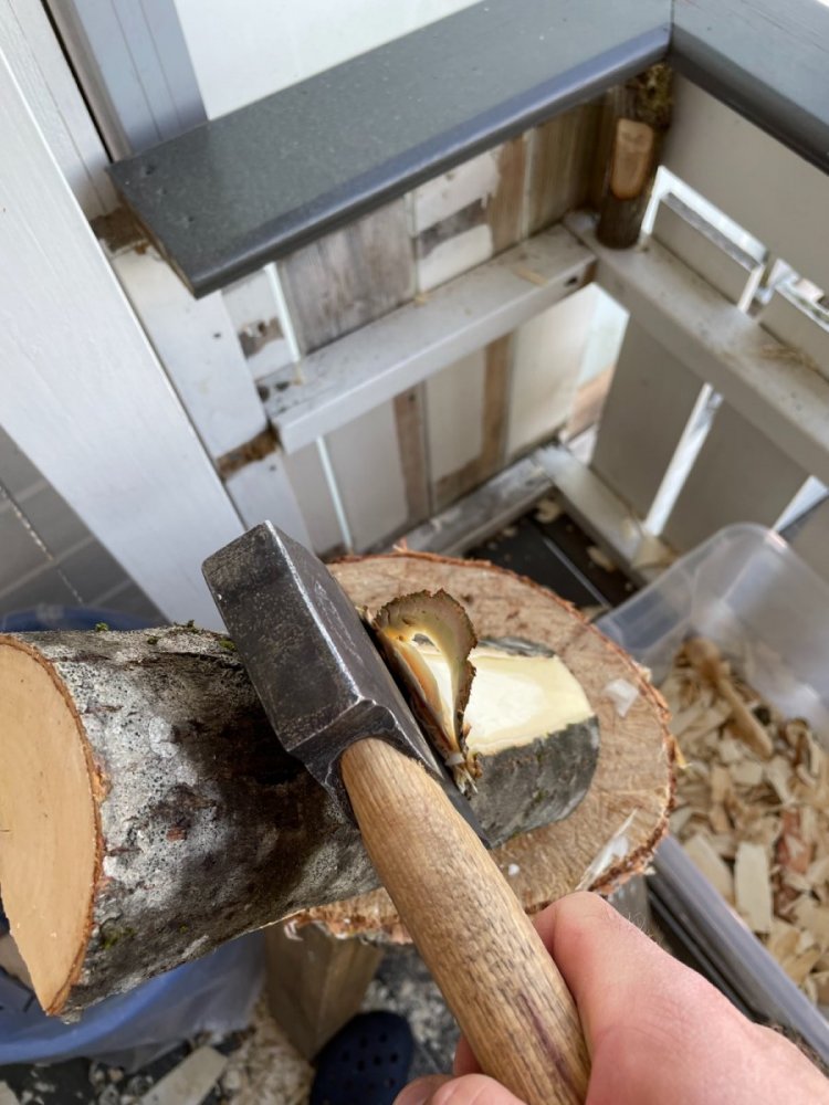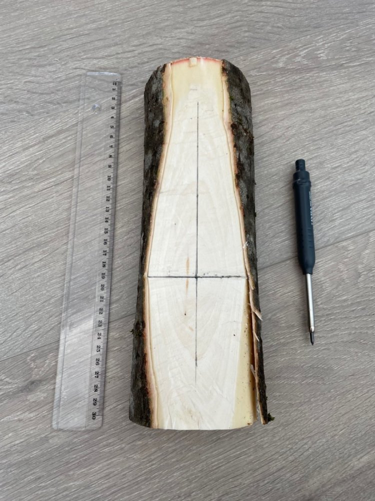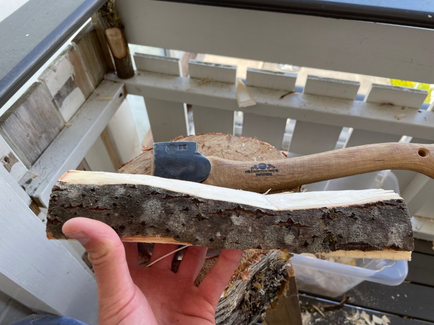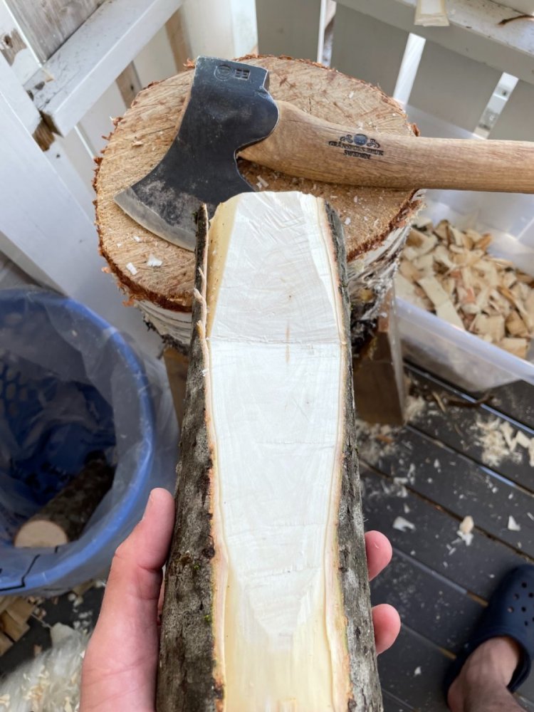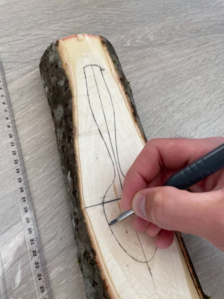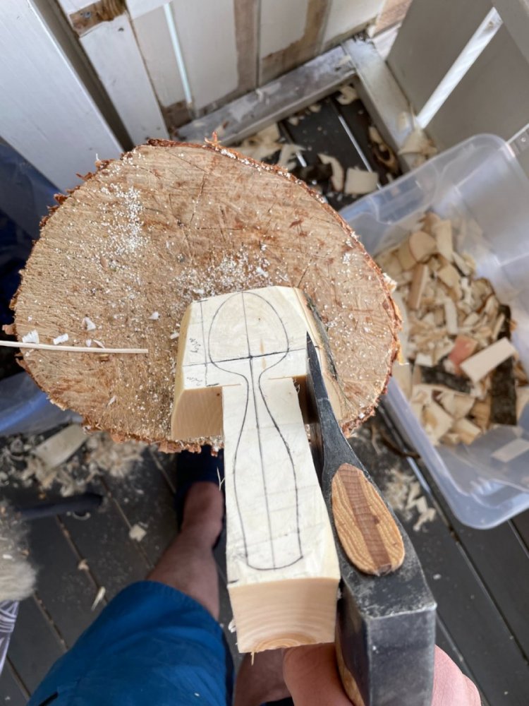 Utstyret man trenger er minimalt En sag, en god øks, en skje kniv, en sløyd kniv (mora 106), blyant, linjal og litt olje. finn deg en kubbe i skogen selv foretrekker jeg for tiden å bruke Selje sag av en passe lengde… gjerne med litt overmål i forhold til hvilken skje du ønsker å lage. En normal skje ligger på rundt 20cm. prøv å se på årringene i treet hvor det er best å kløyve stokken i to Bruke øksen til å kløyve stokken, bruk gjerne en kubbe til å slå øksen gjennom, da får du mer presist hugg. nå begynner med å lage grunnlaget for bøyen på skjea ved å hugge inn en V fra barkesiden og ned. litt mer lengde på der håndtaket skal være i forhold til bollen. Her finnes det ingen fasit. Prøv hva du liker best. Alternativt se hvordan dine metall skjeer er formet. Er du nøye her, vil jobben senere bli mye lettere 👍🏻 nå starter jobben med å finne designet du vil ha på skjeen. Her prøver jeg å se på mønsteret i ringene å former slik det ser naturlig ut i treverket. En linjal som lar seg bøye litt er å foretrekke. her er det bare fantasien som setter stopper… jeg syntes det var veldig vanskelig å håndtegne formen til å begynne med, men øvelse gjør mester. Det finnes også uendelig med maler du kan bruke på nettet. det finnes en gylden regel for hva som utgjør en god skje, uten at jeg husker den i hodet, men jeg holder meg ca til disse målene når jeg setter opp omrisset. nå bruker jeg sagen til å få vekk overflødig i endene også sager jeg inn 2 hjelpe kutt mot halsen på skjeen. Dette for å lettere kunne økse ut mot streken. hvor nært du velger å gå til streken avhenger av øksen din, hvor skarp den er og hvor god teknikk du har. Jo nærmere du kommer jo lettere blir kniv arbeidet. Men husk, her er det lett å bli overmodig! nå begynner arbeidet med kniven… her er det bare å kutte inn mot streken og forme skjeen slik som du vil ha den. Kutt ikke for dypt om gangen, å følg den naturlige retningen i treet. jeg bruker en mora 106 som er noe av det beste du finner og koster et par hundrelapper på nettet. å kutte ut av bollen gjør jeg ved hjelp av en god skje kniv. Jeg opplever at mora sine skje kniver biter for dypt, så det er vanskelig å få en fin pusset overflate. Derfor bruker jeg 2 kniver til skjeene mine fra wood tools i England. Mora sine er mye bedre til kuksa å større boller. her bestemmer du selv hvor pirkete og fint resultat du vil ha. Jo skarpere kniv jo finere resultat. Selv bruker jeg litt 120 sandpapir for å få vekk de små ujevnhetene. Etter en time med OCD har du ditt ferdige resultat. jeg har enda tilgode å oppleve at en skje sprekker når jeg bruker Selje. Den holder seg veldig fin, jeg setter den inn med litt valnøtt olje og lar den tørke naturlig inne eller ute. Den bruner også veldig fint om man putter den litt i steike ovnenen 👏🏻 har du noen spørsmål er det bare å hyle ut. Har du laget skje selv, post gjerne bilde så jeg får se hva du har laget. Lykke til 🔥