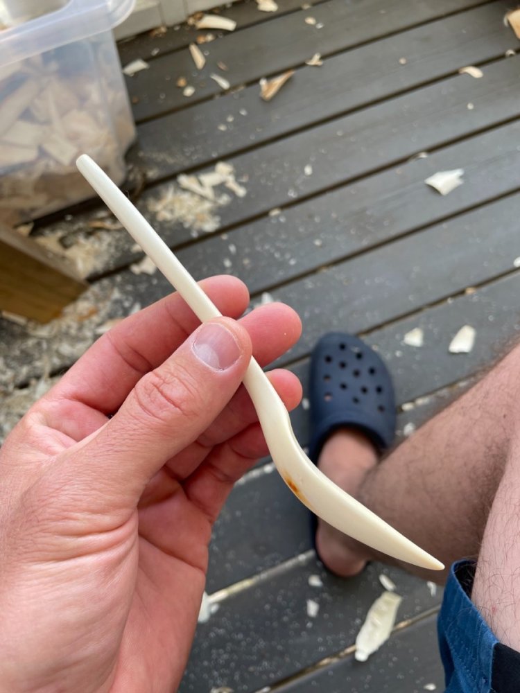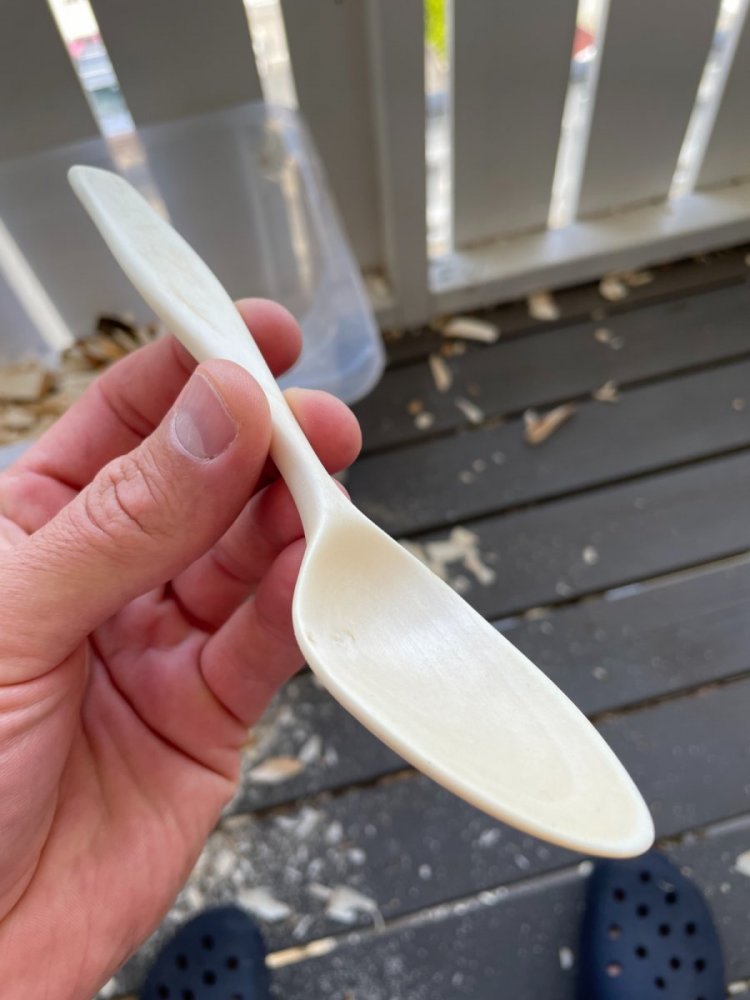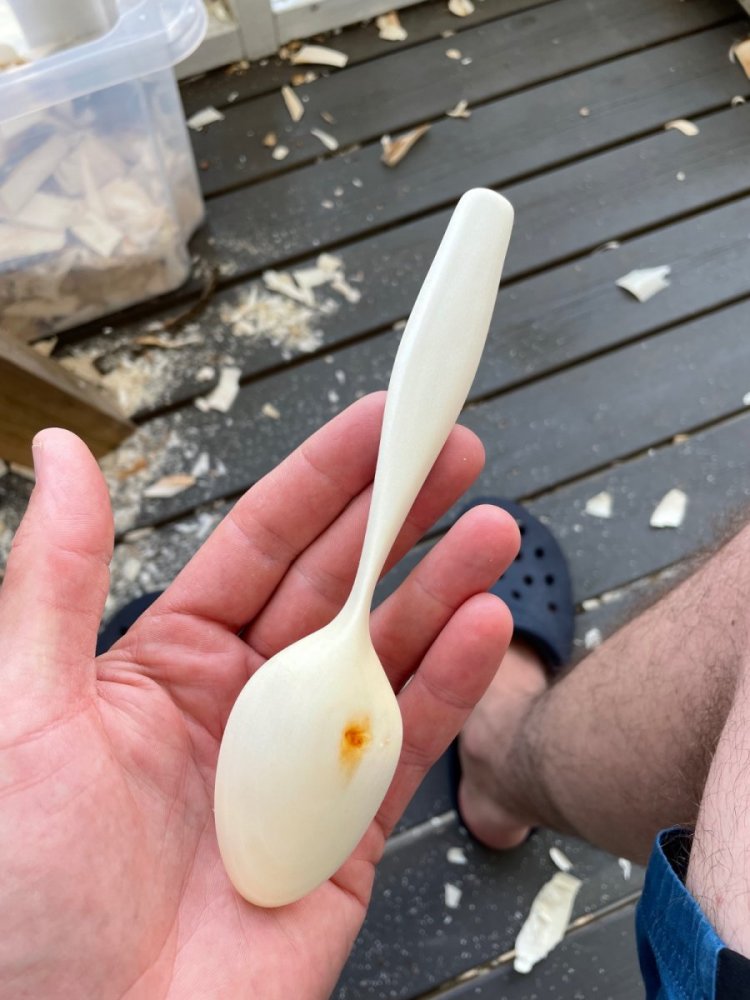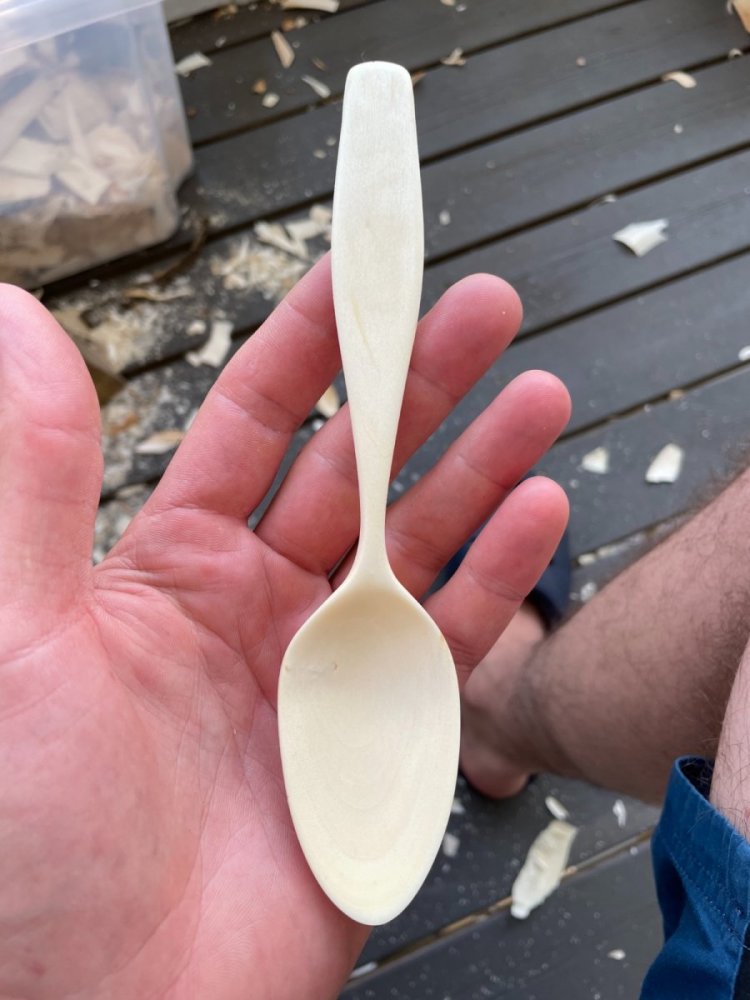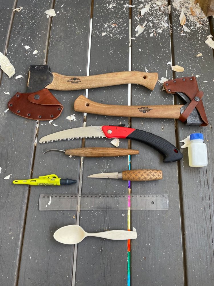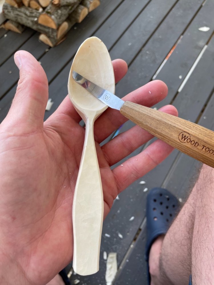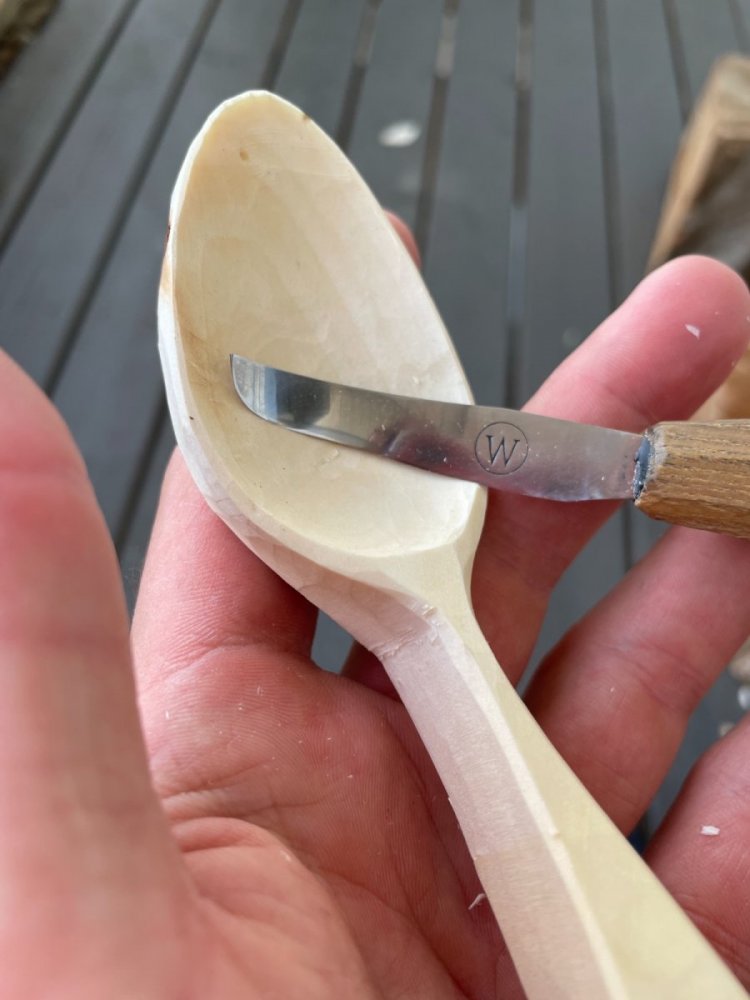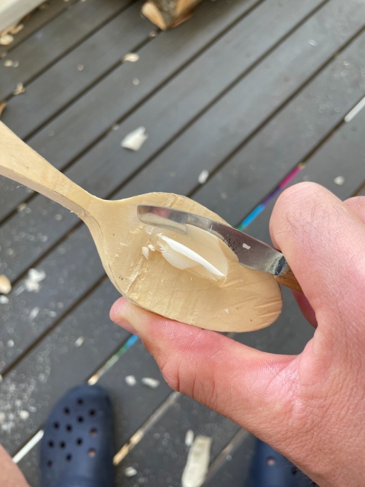 Det er litt artig å se hvor man begynte og hvor man er 😋 her er et bilde av den første skjeen jeg laget ved siden av den siste jeg laget nå hører det med til historien at det har blitt laget ganske mange skjeer denne vinteren, men det er utrolig hva man kan få til med litt tålmodighet og ønsket om å lære noe nytt 👍 mange har brukket, gått i bålpanna eller bare ligger under stolen for å minne meg på at ikke alle blir bra men jeg har så smått begynt å forstå hva som sprekker, hvordan jeg tørker de og noen små andre triks i Ludo 😂 Så får vi bare se hvordan man klarer å spinne dette videre. Tenkte å lage en egen post med tekst å bilder rundt hvordan jeg lager en skje helt fra valg av emne til ferdig innsatt med olje 👍
